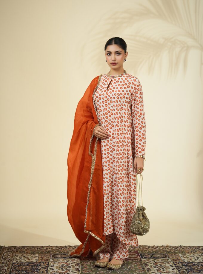 Sand & toasted orange butti print kurta set