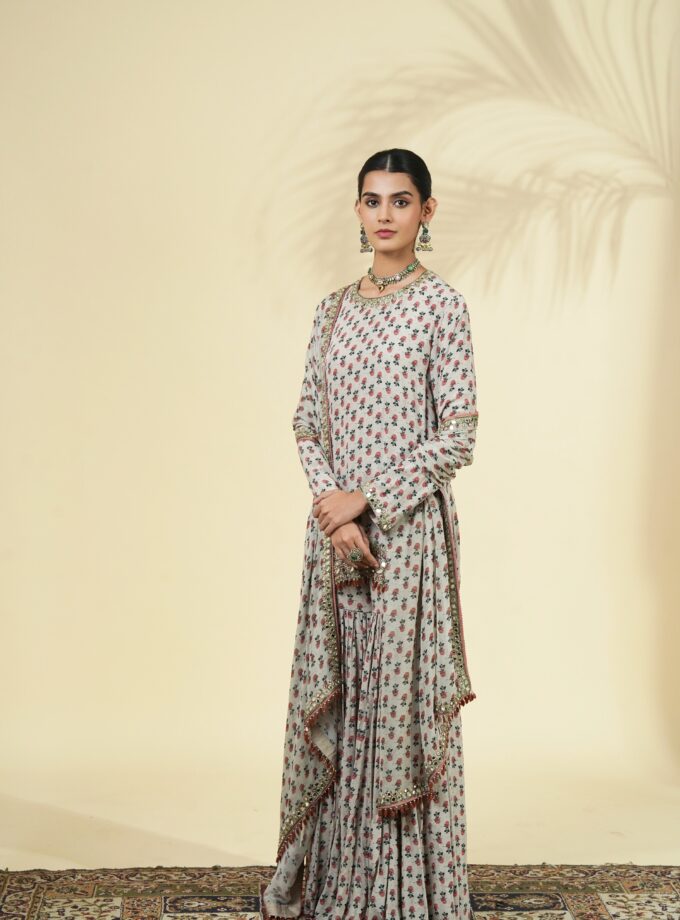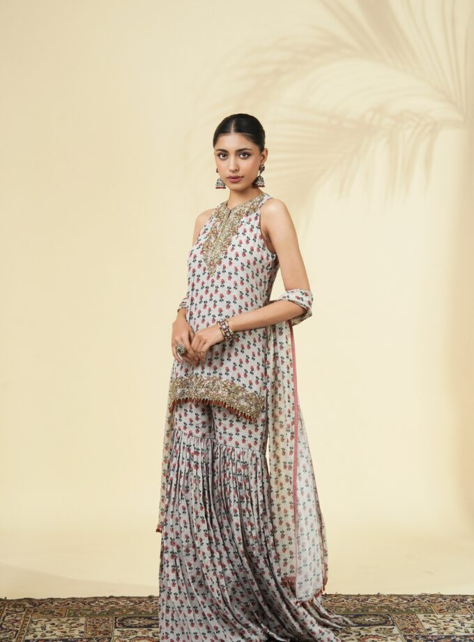 Vintage rose butti print short kurta & gharara set