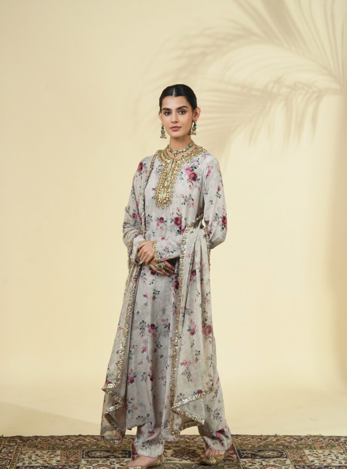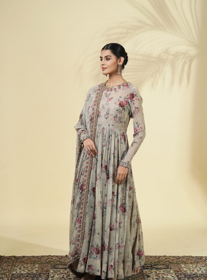 Vintage rose print hand embroidered anarkali set