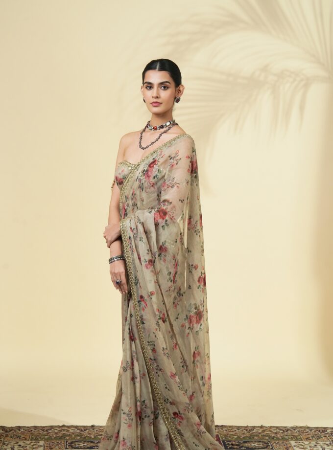 Vintage rose print hand embroidered organza corset sari set