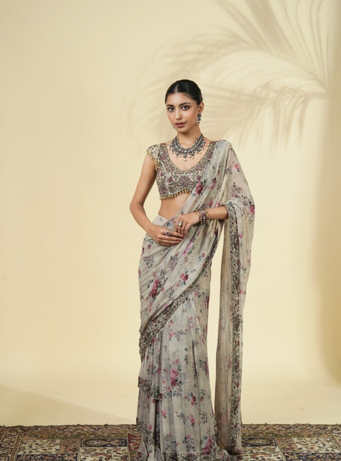 Vintage rose print hand embroidered ruffle sari set