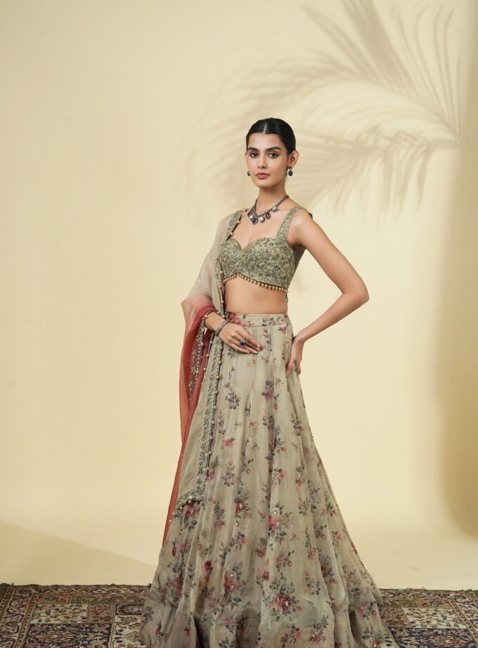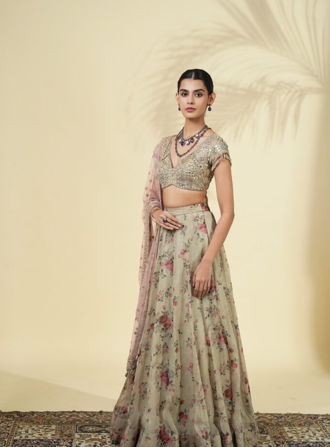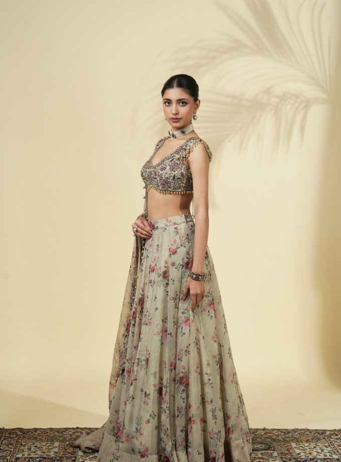 Vintage rose print organza lehenga set