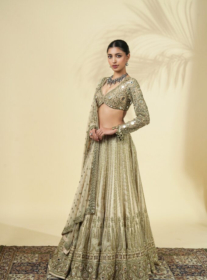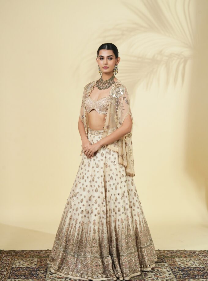 Vintage rose print hand embroidered organza lehenga set