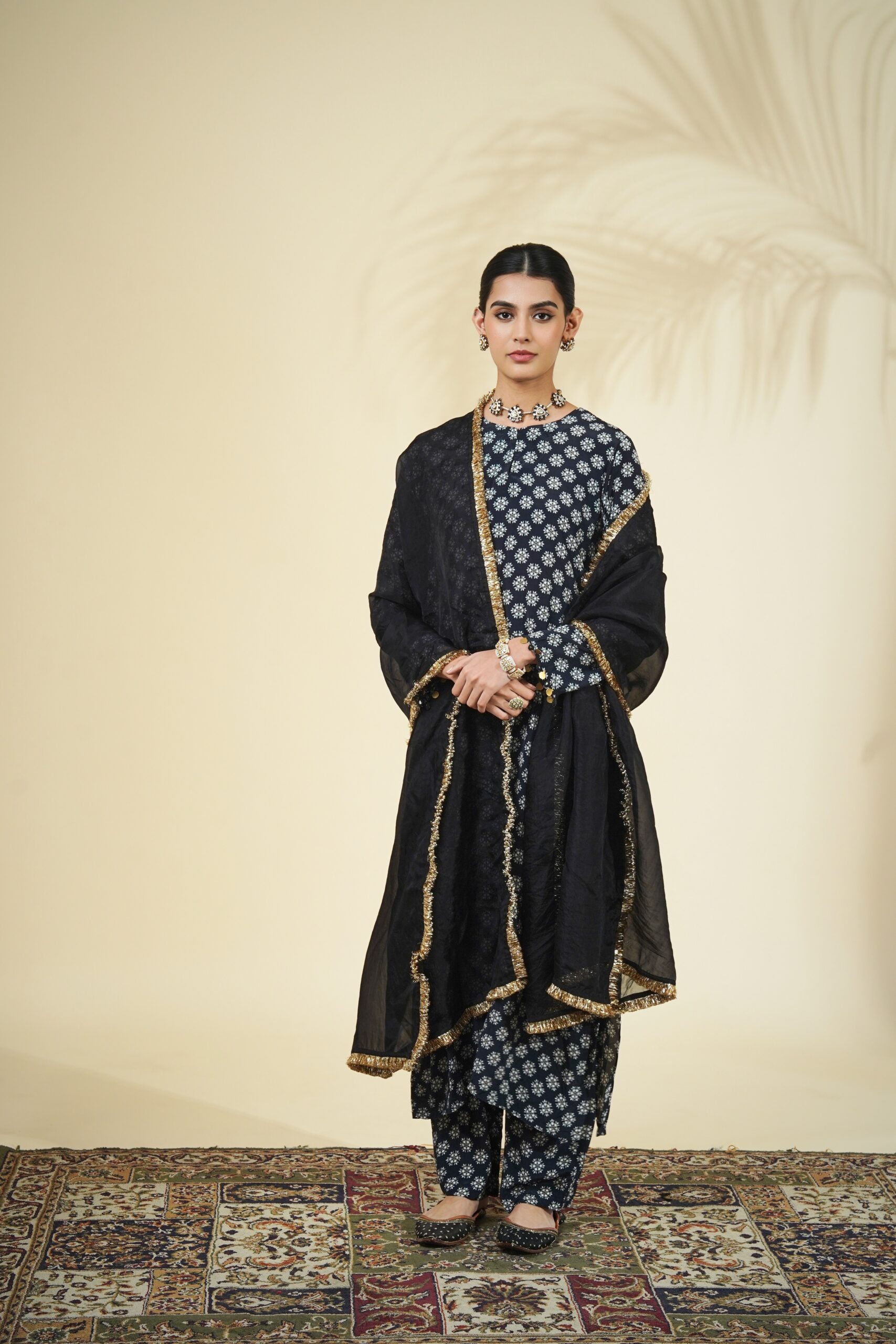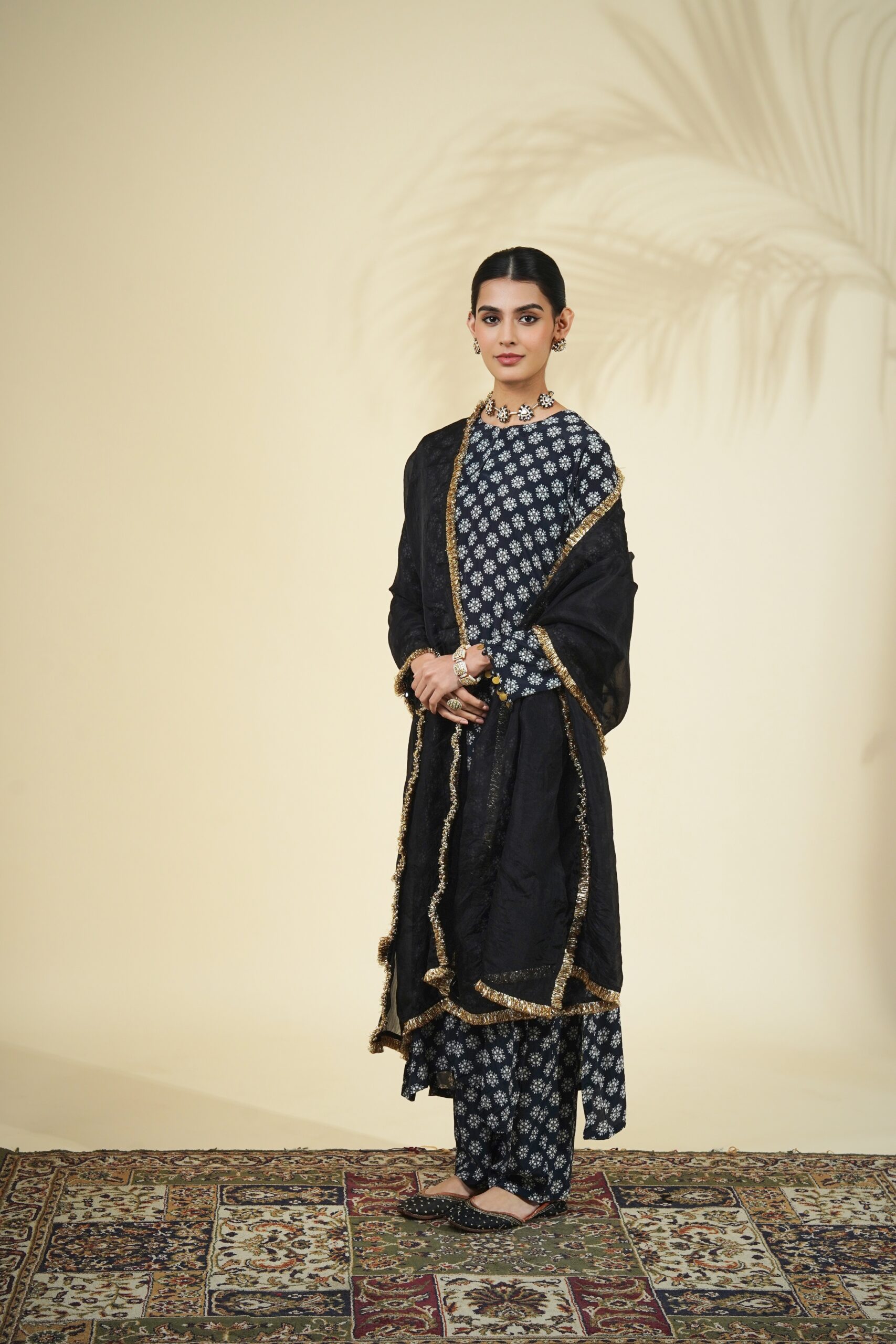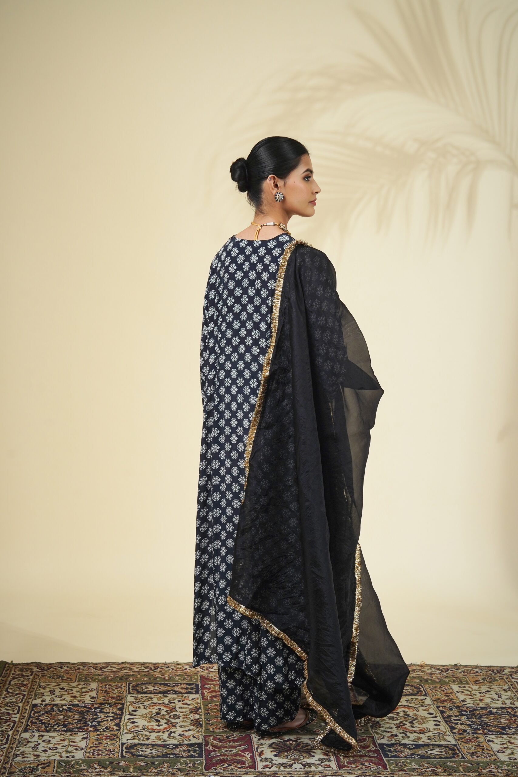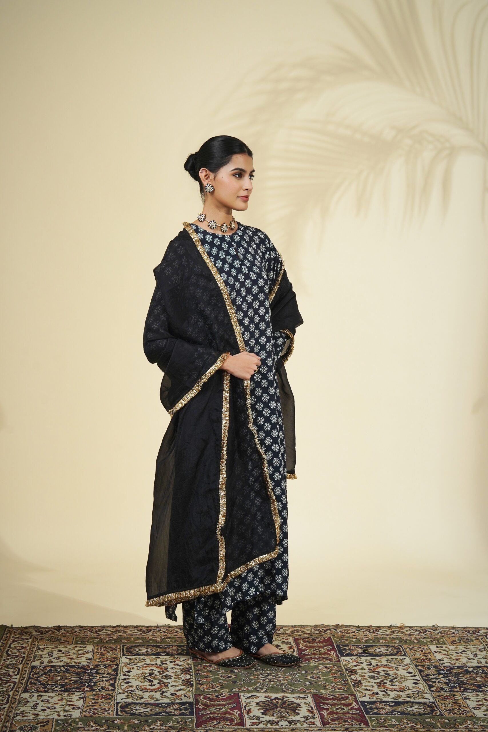 Black & sand butti print kurta & pant set paired with a solid black organza dupatta.