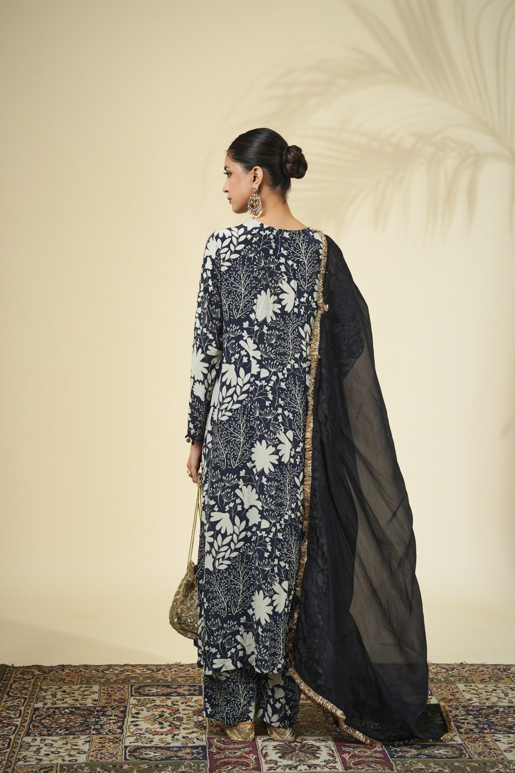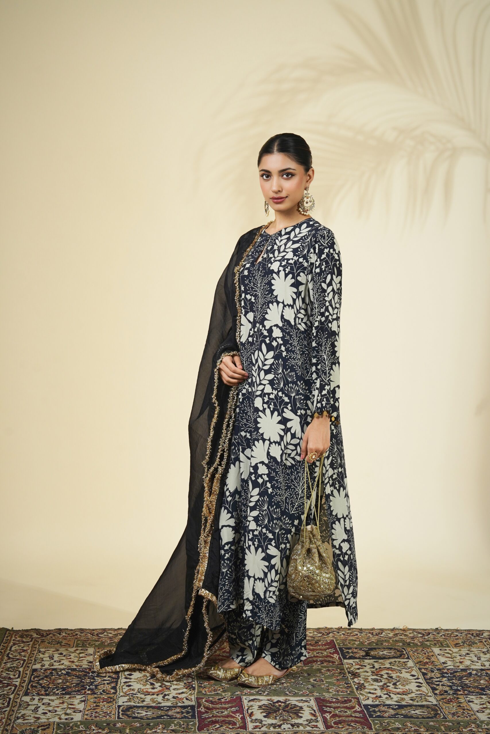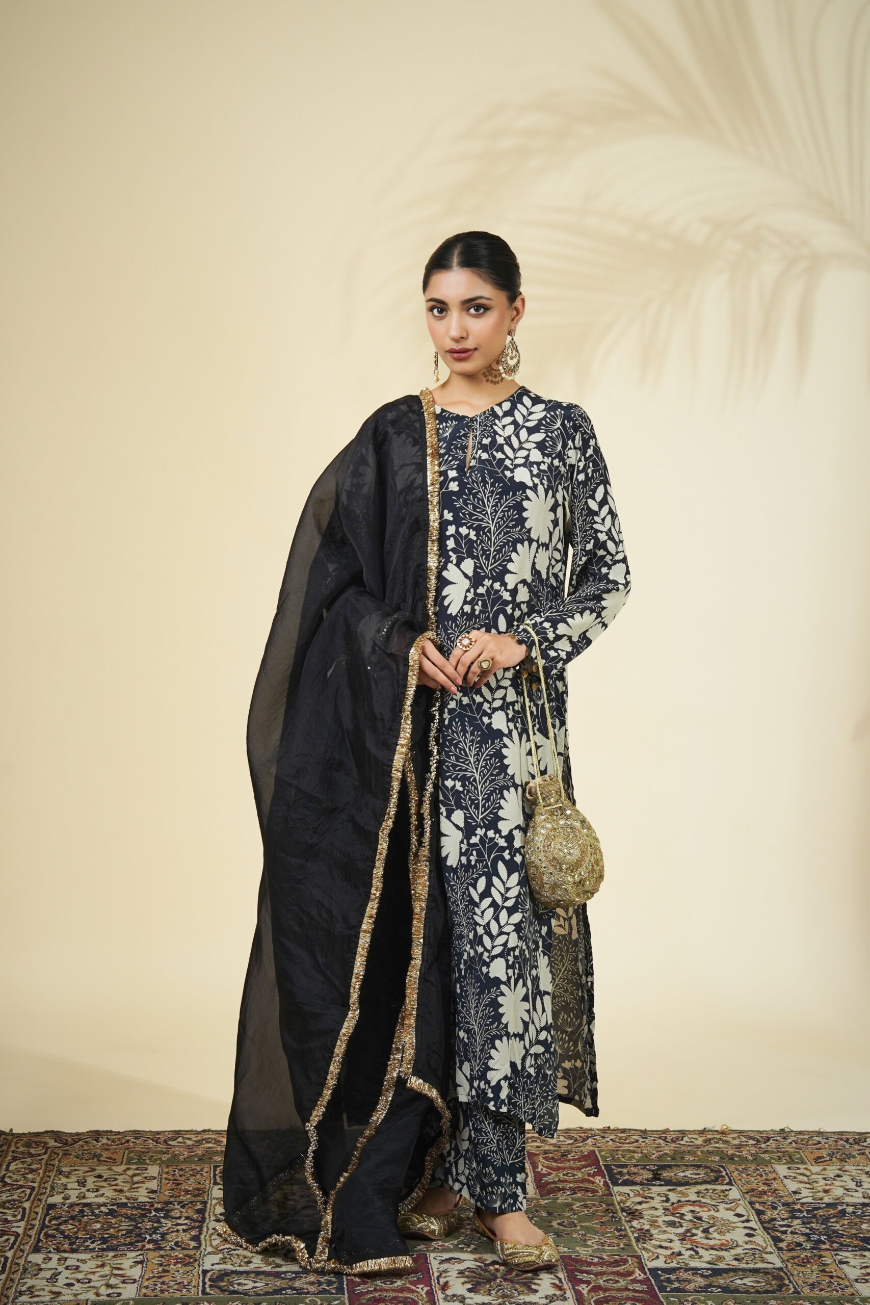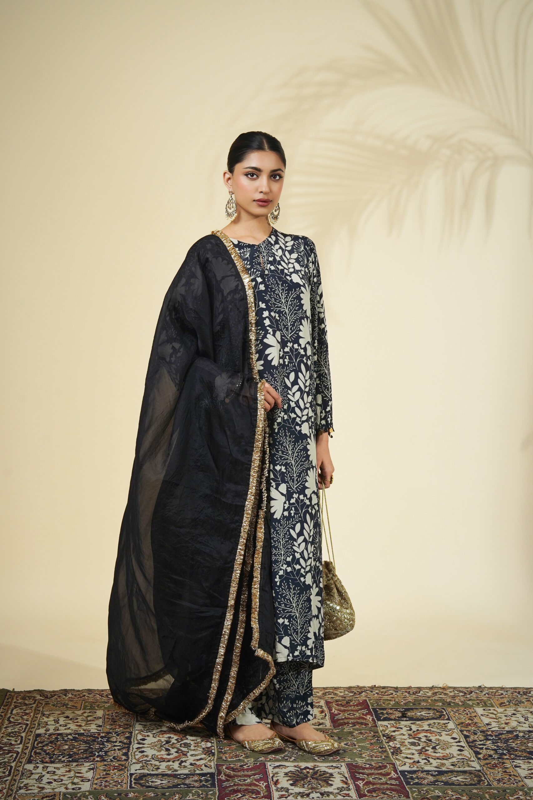 Black & sand garden print kurta & pant set paired with a solid black organza dupatta.