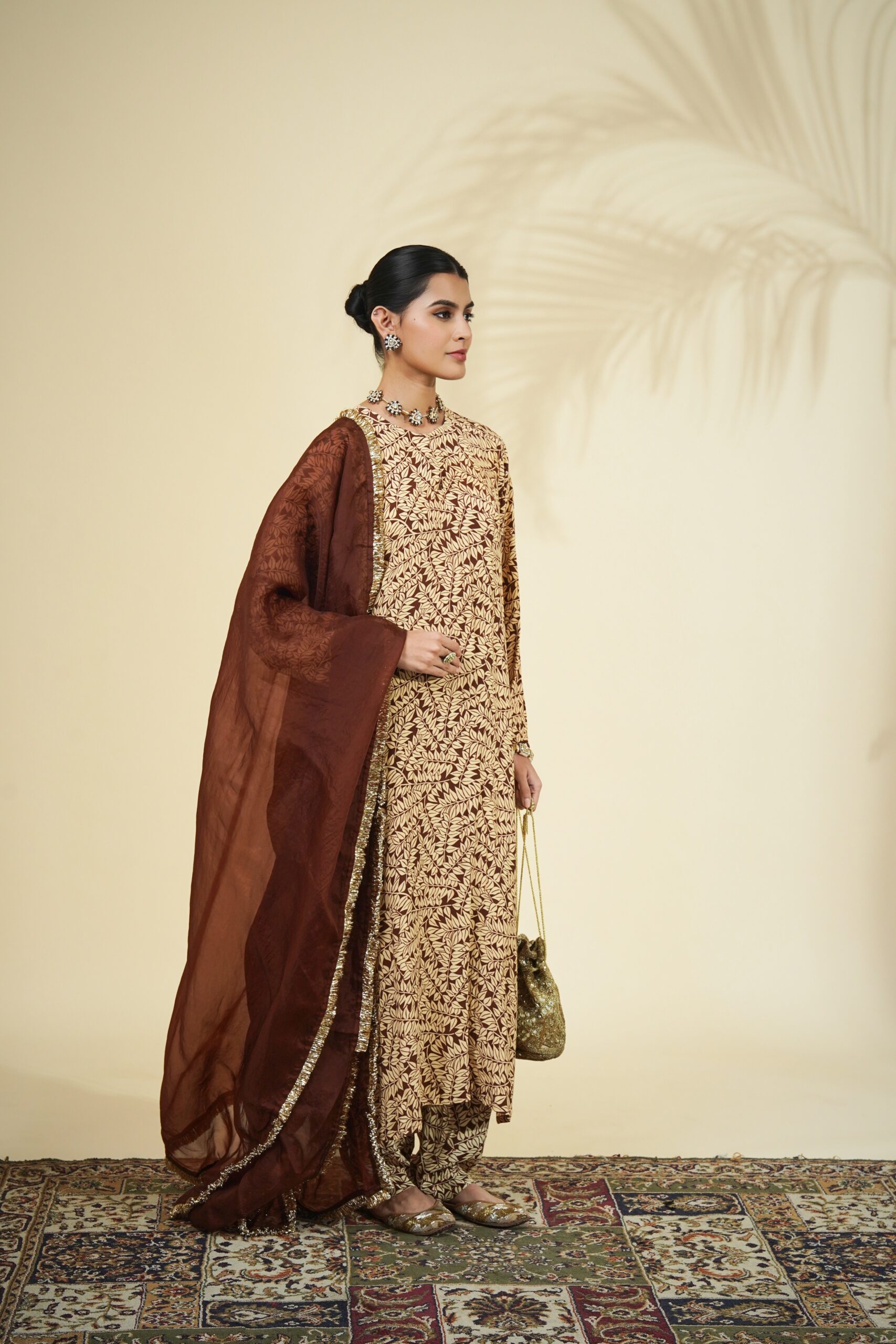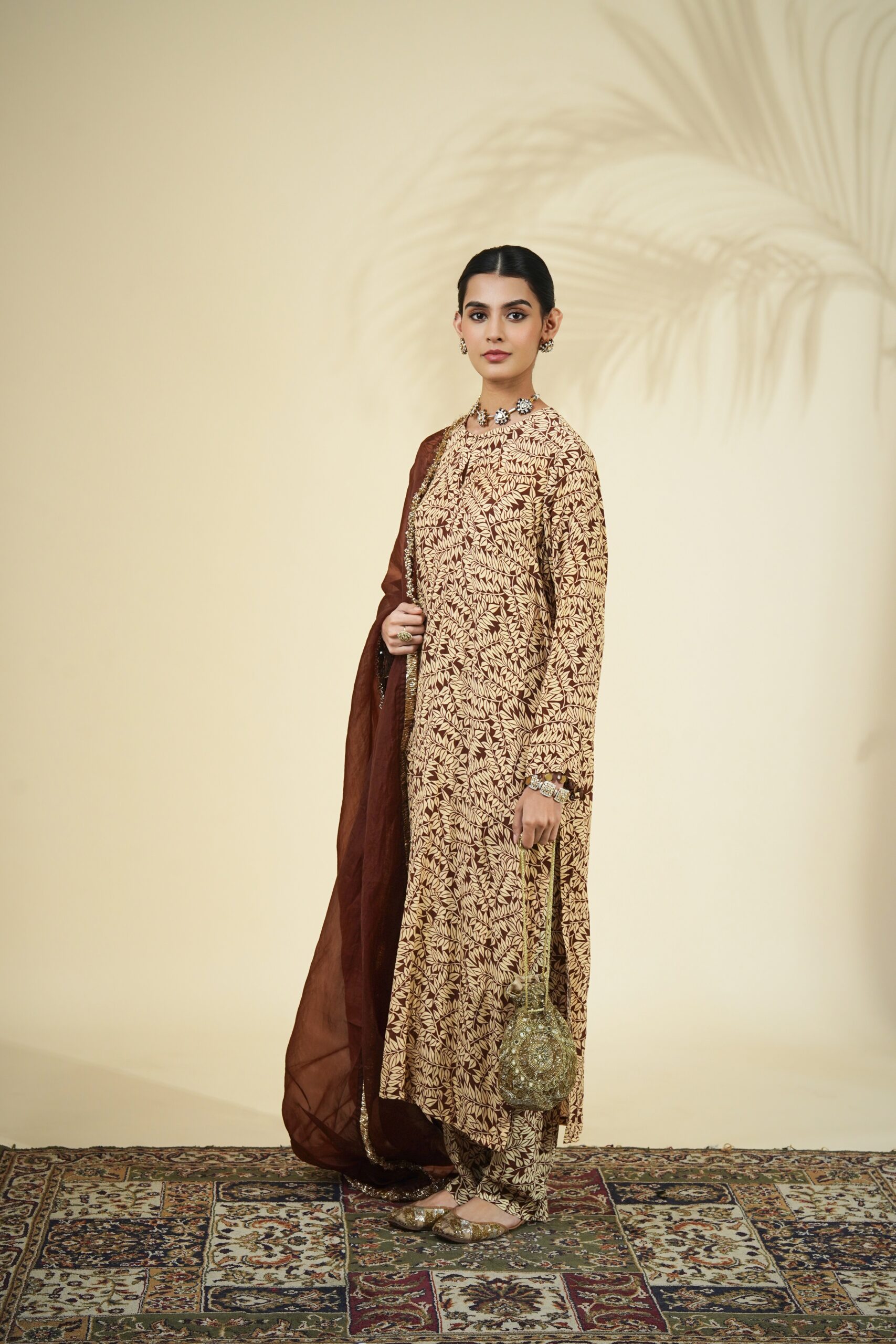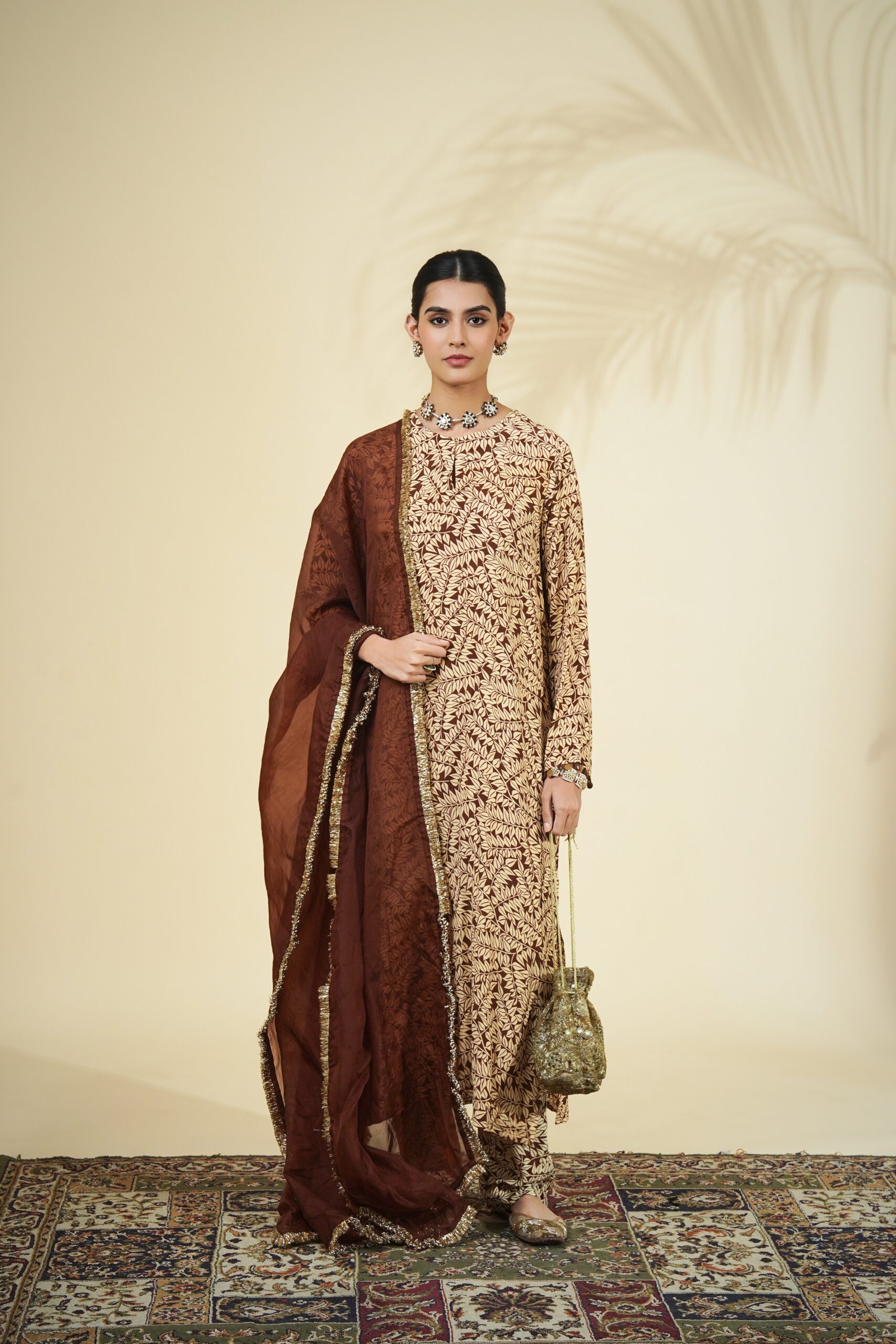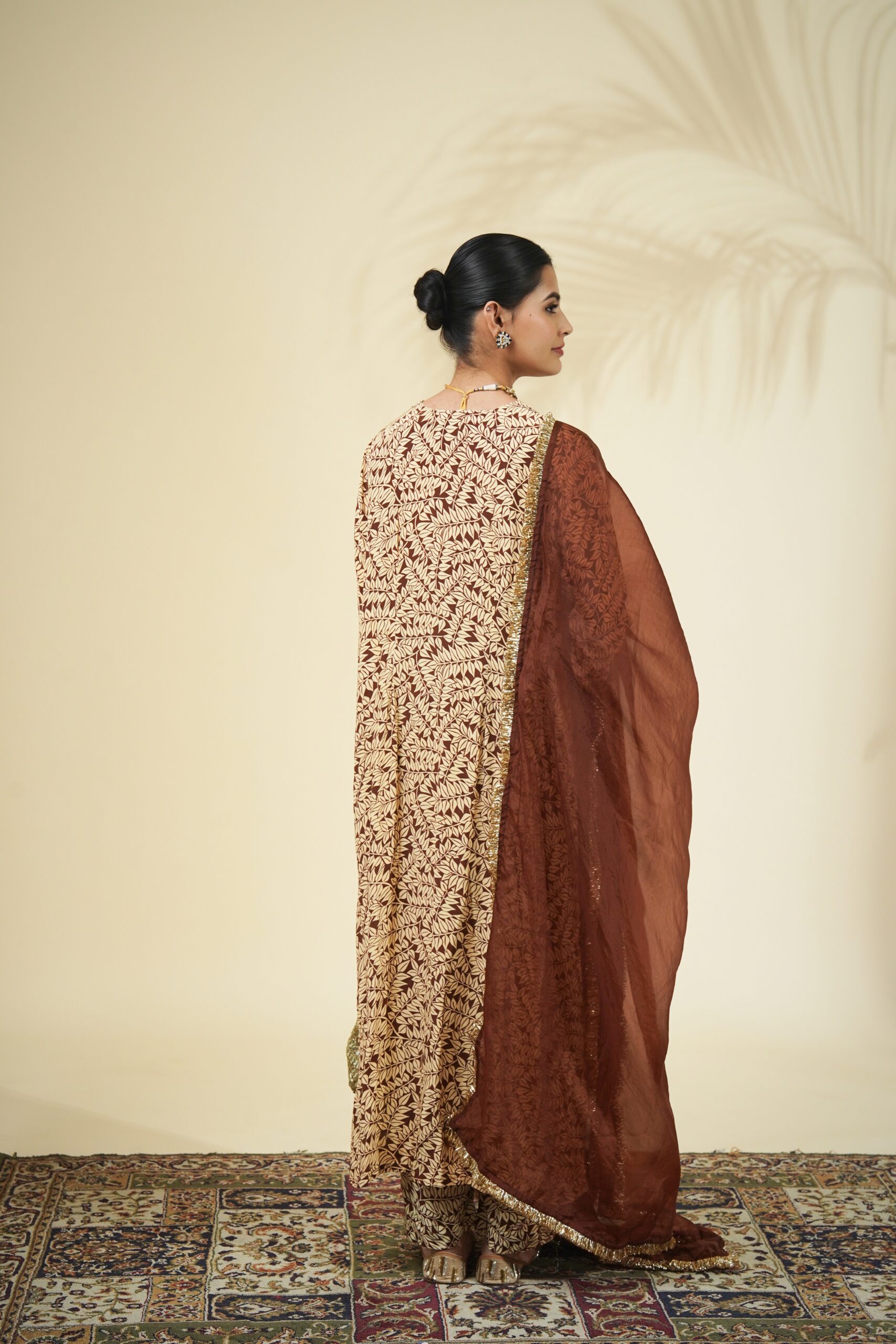 Brown fire print kurta & pant set paired with a solid brown organza dupatta.