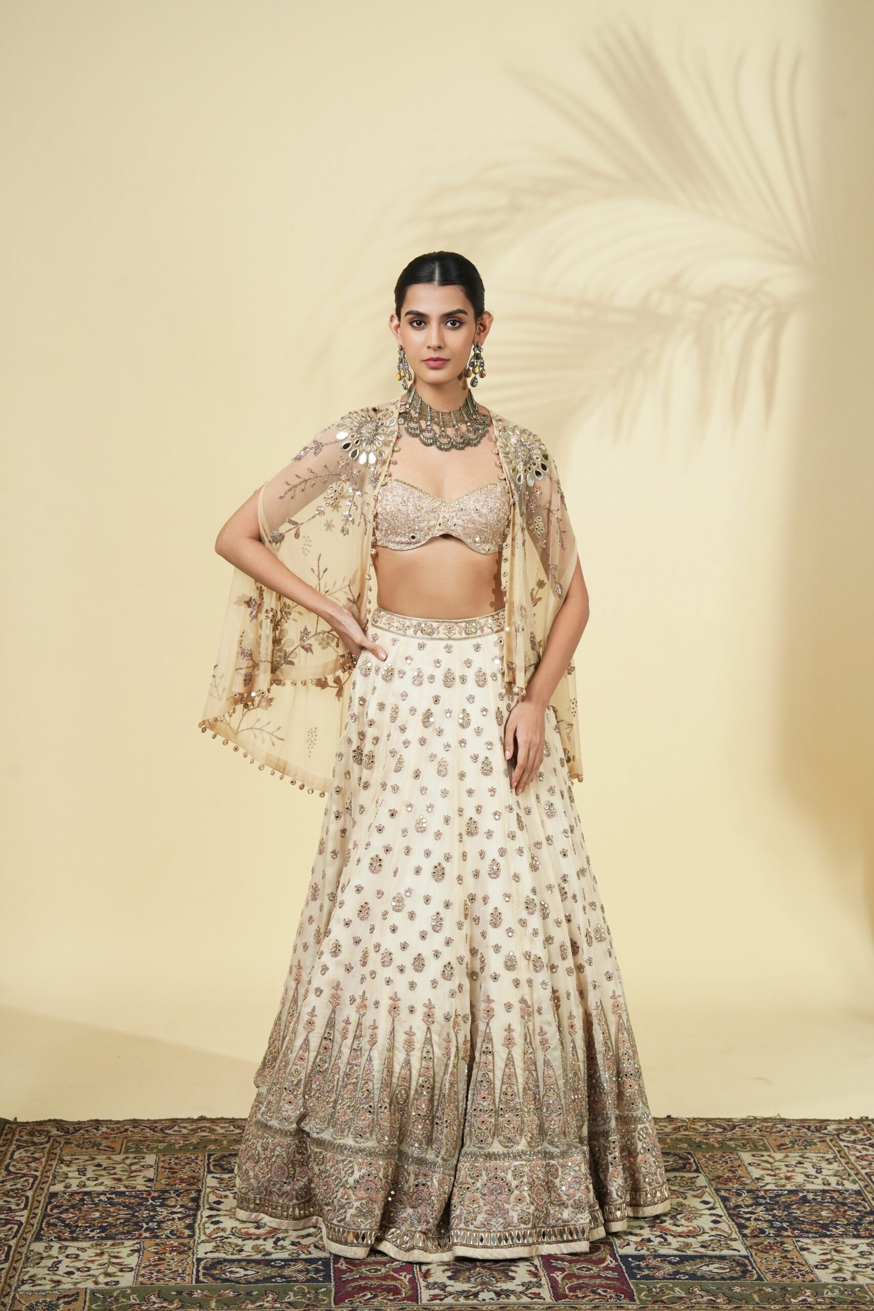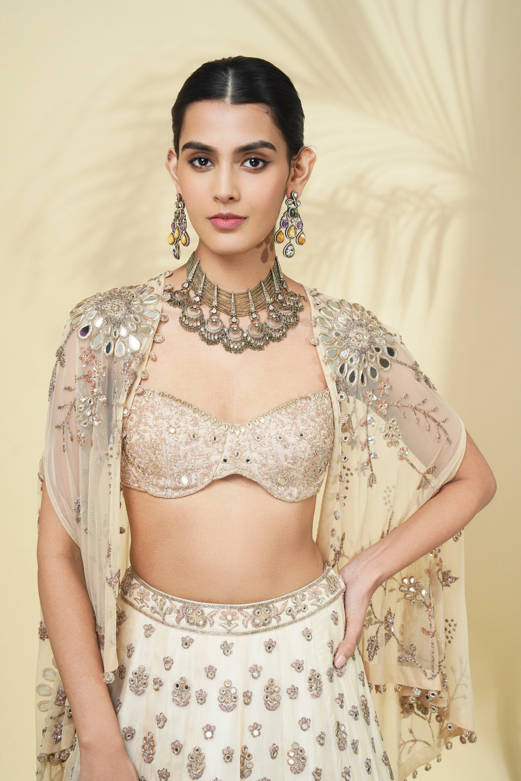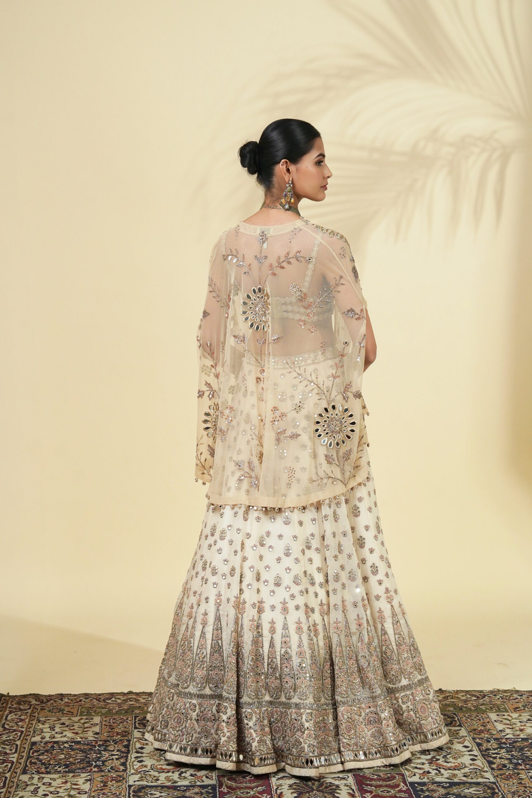 Coconut & dull gold mirror, cutdana & dust pink dhaga hand embroidered lehenga & blouse paired with a short hand embroidered jaal cape.