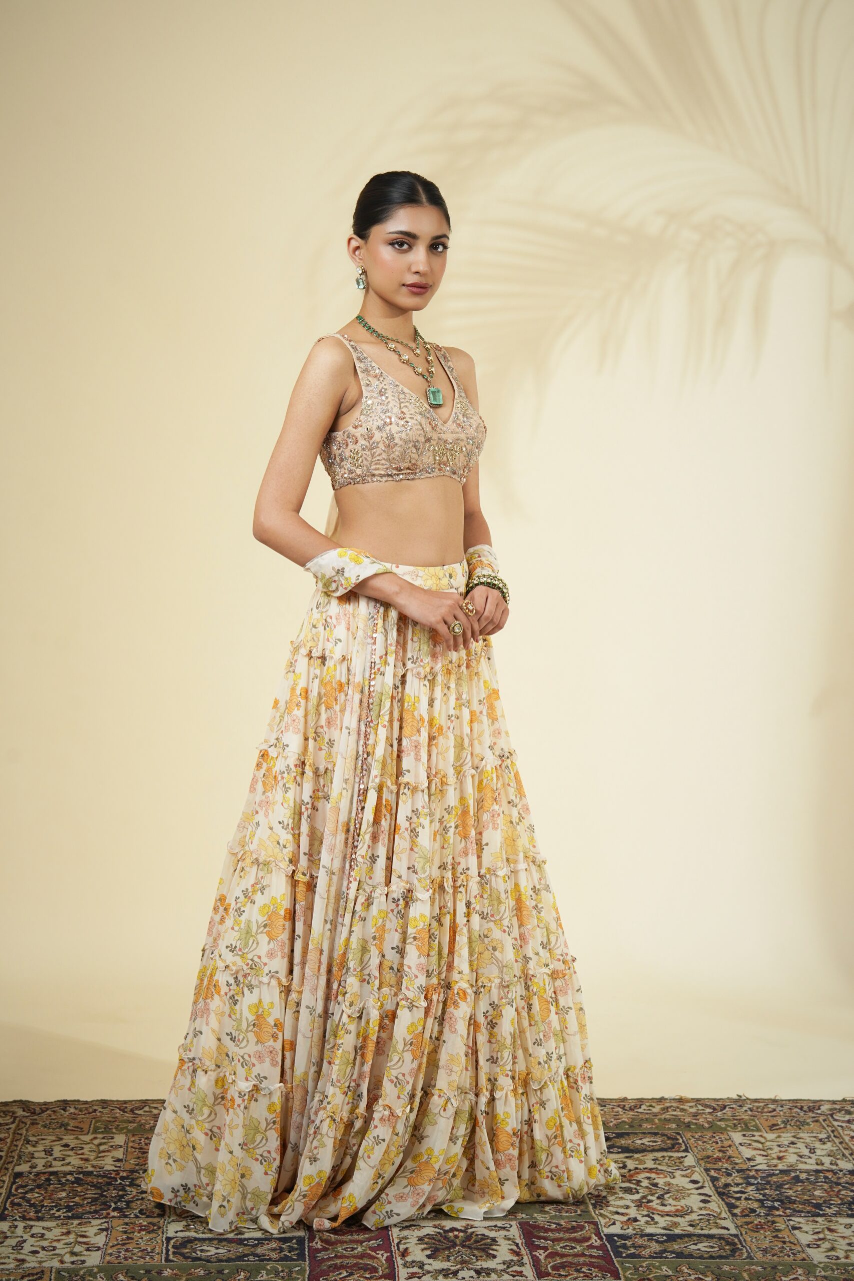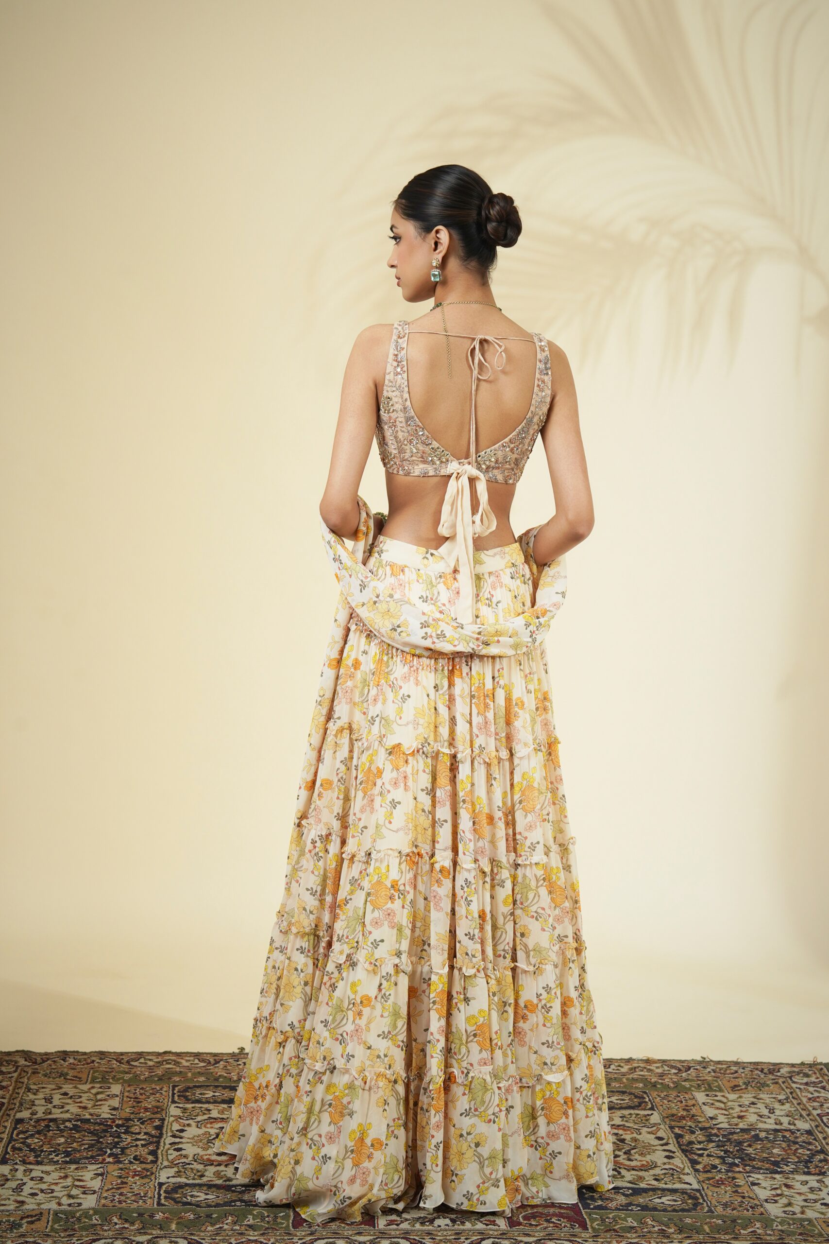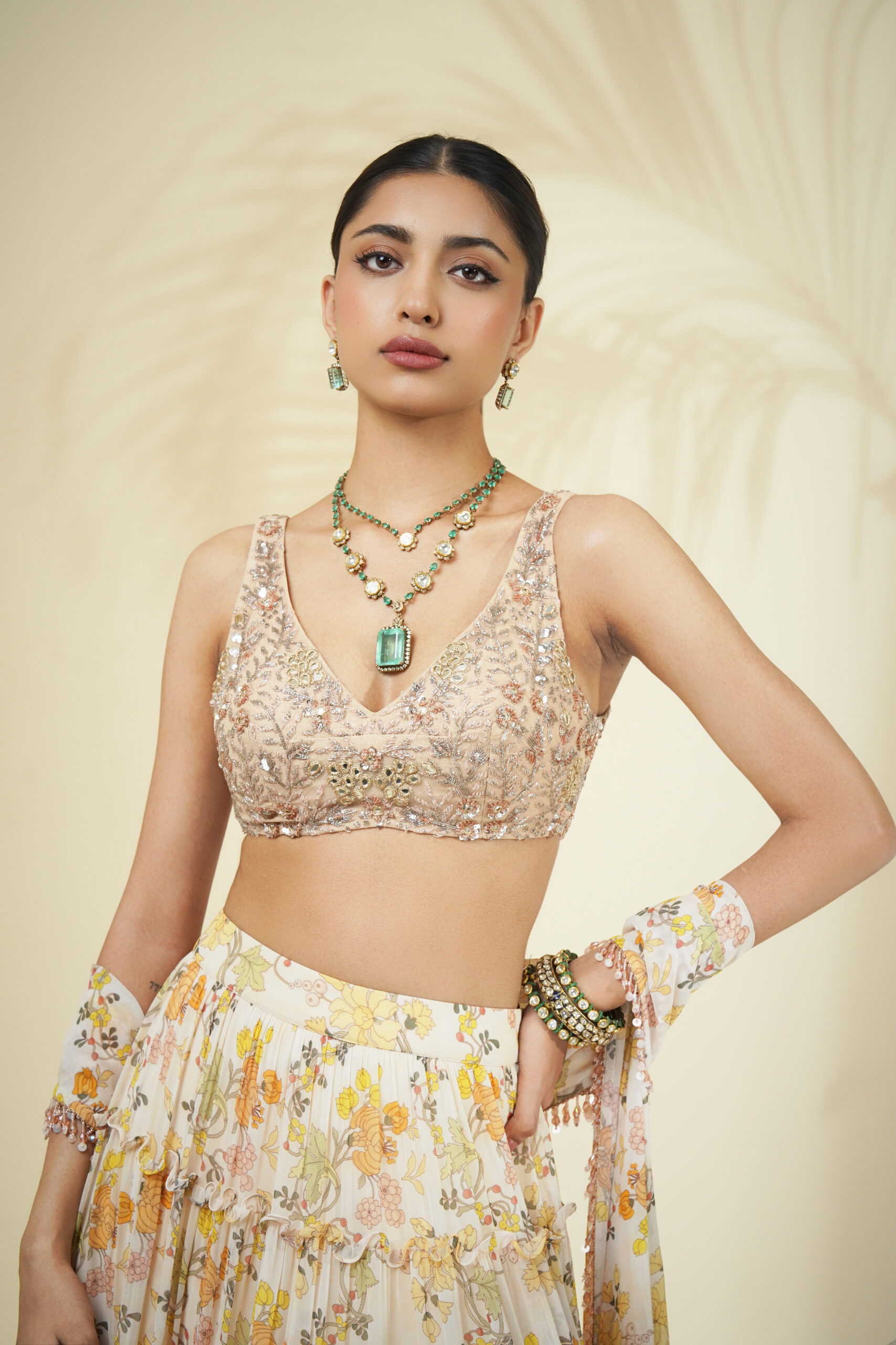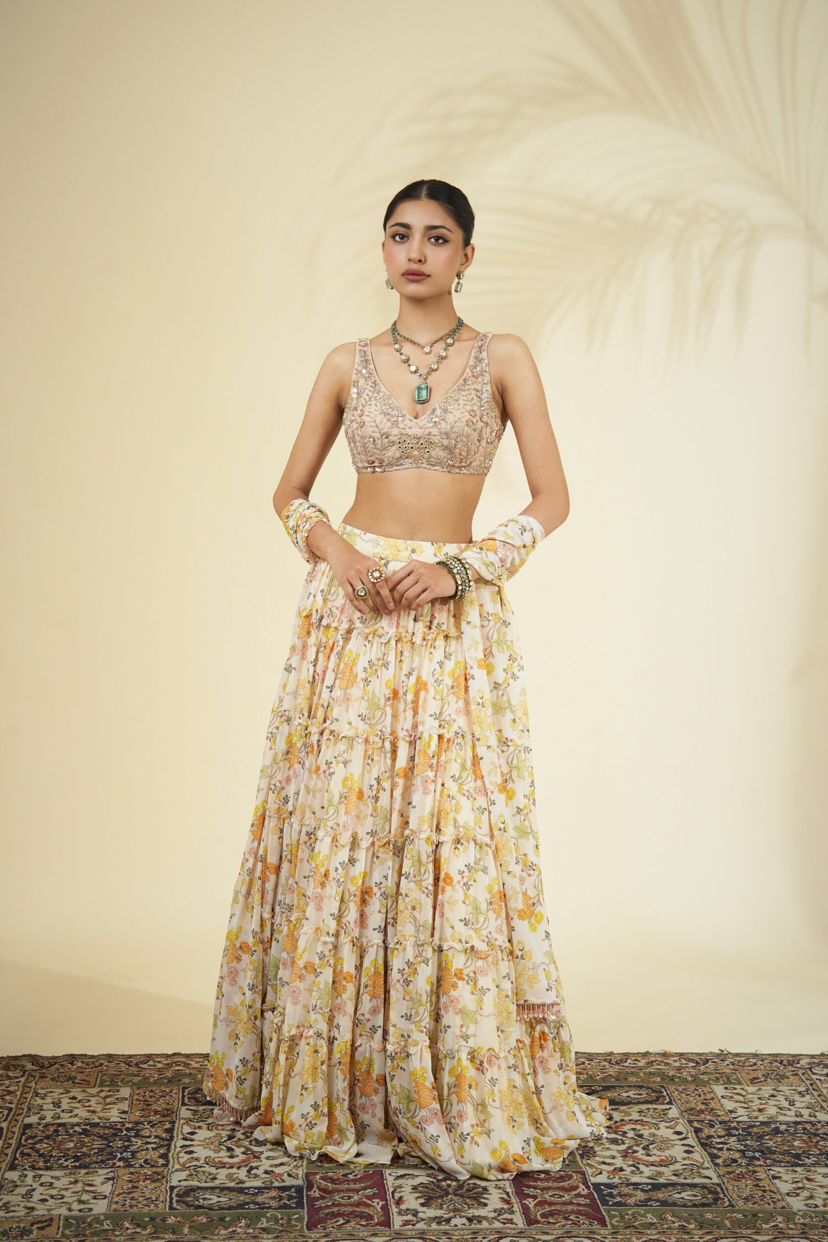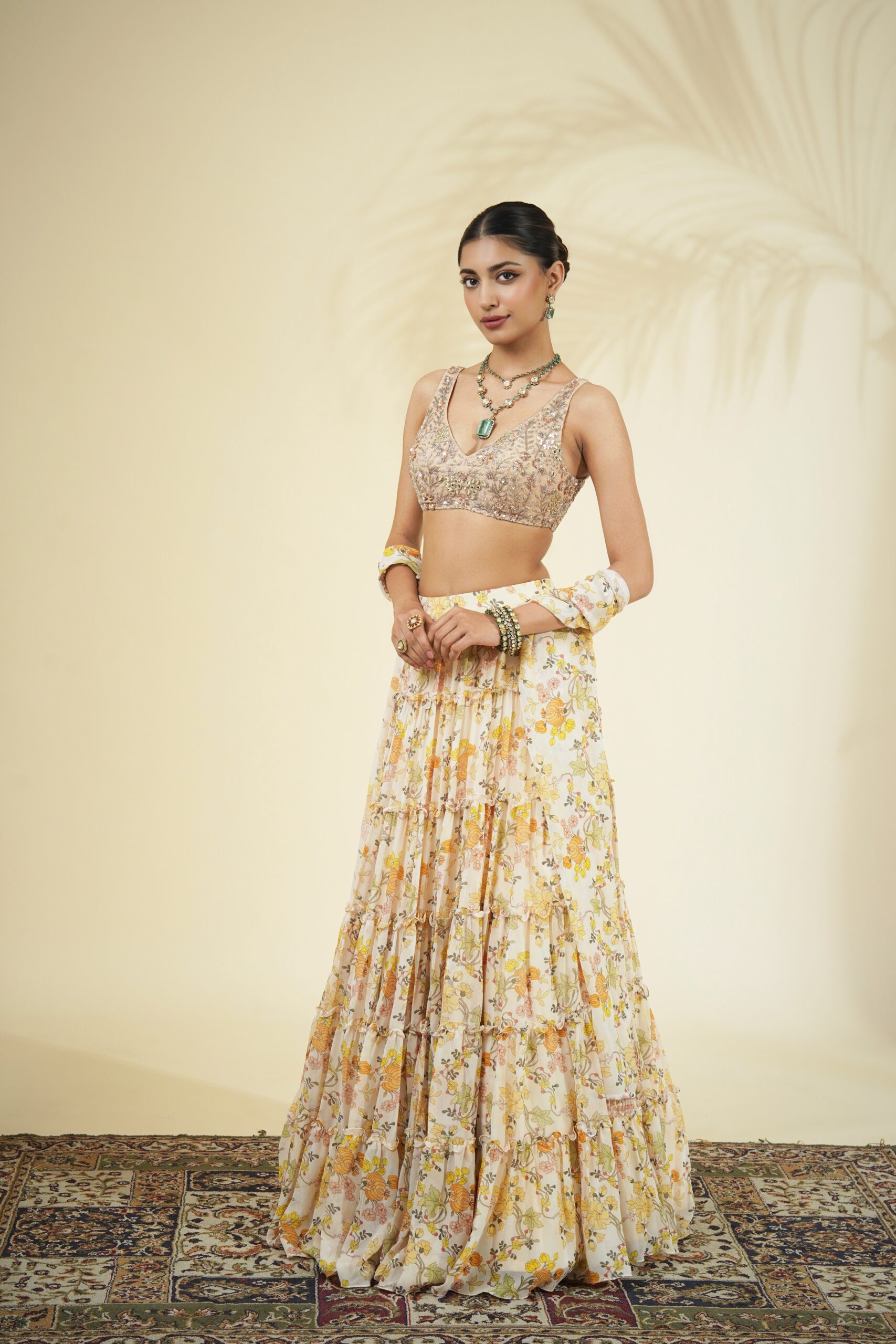 Coconut & yellow floral print tiered skirt & slim dupatta with crystal tassel detailing paired with a rose gold mirror, cutdana & kasab hand embroidered blouse.