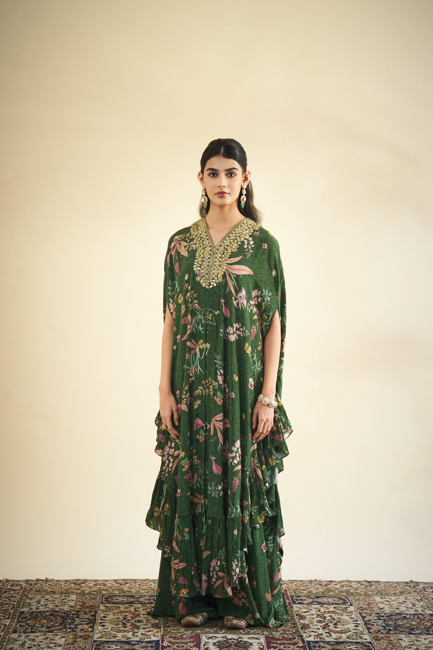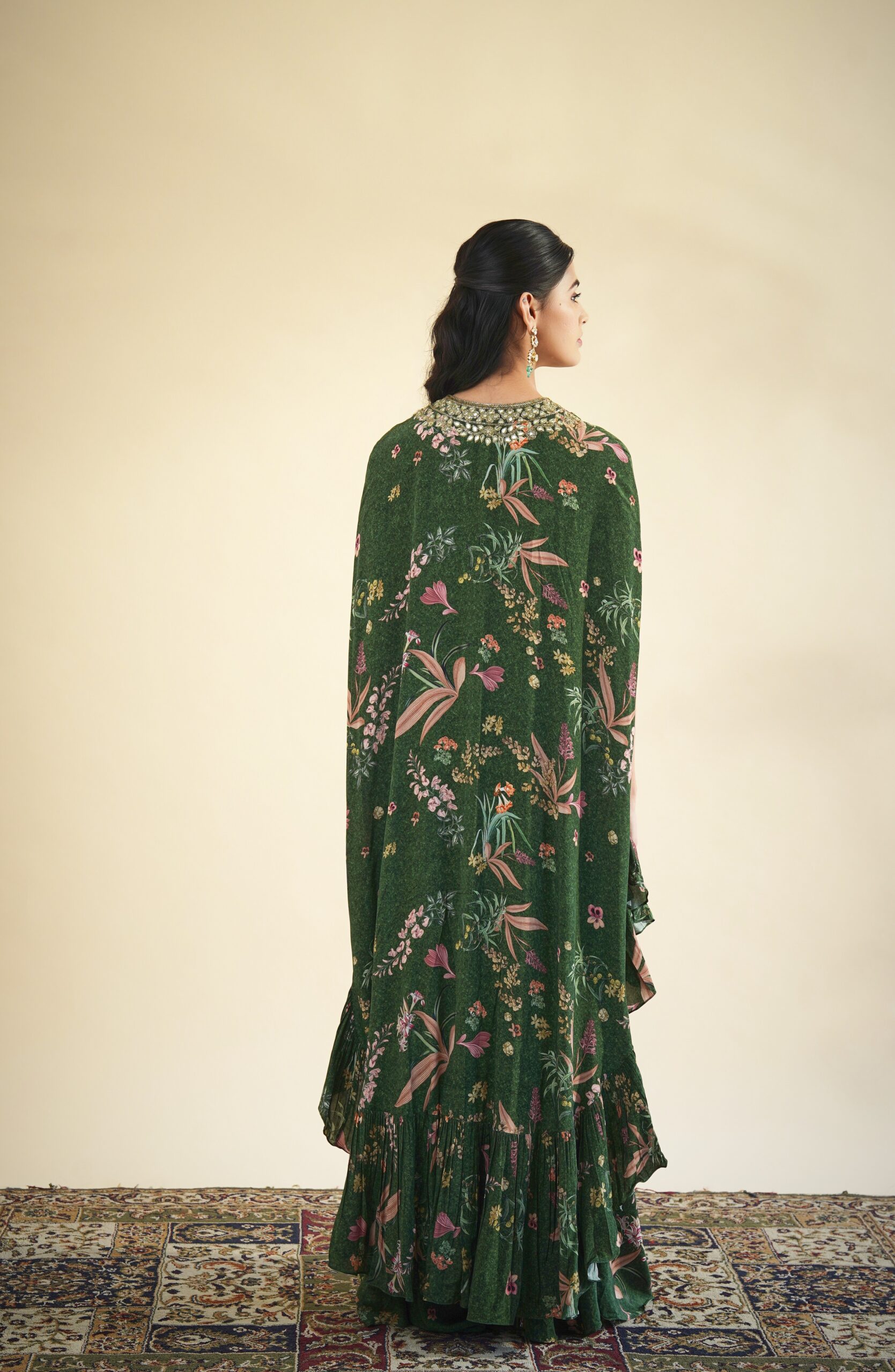 Green floral print & beige gold mirror, cutdana & kasab V neck hand embroidered yoke cape & kite pant.