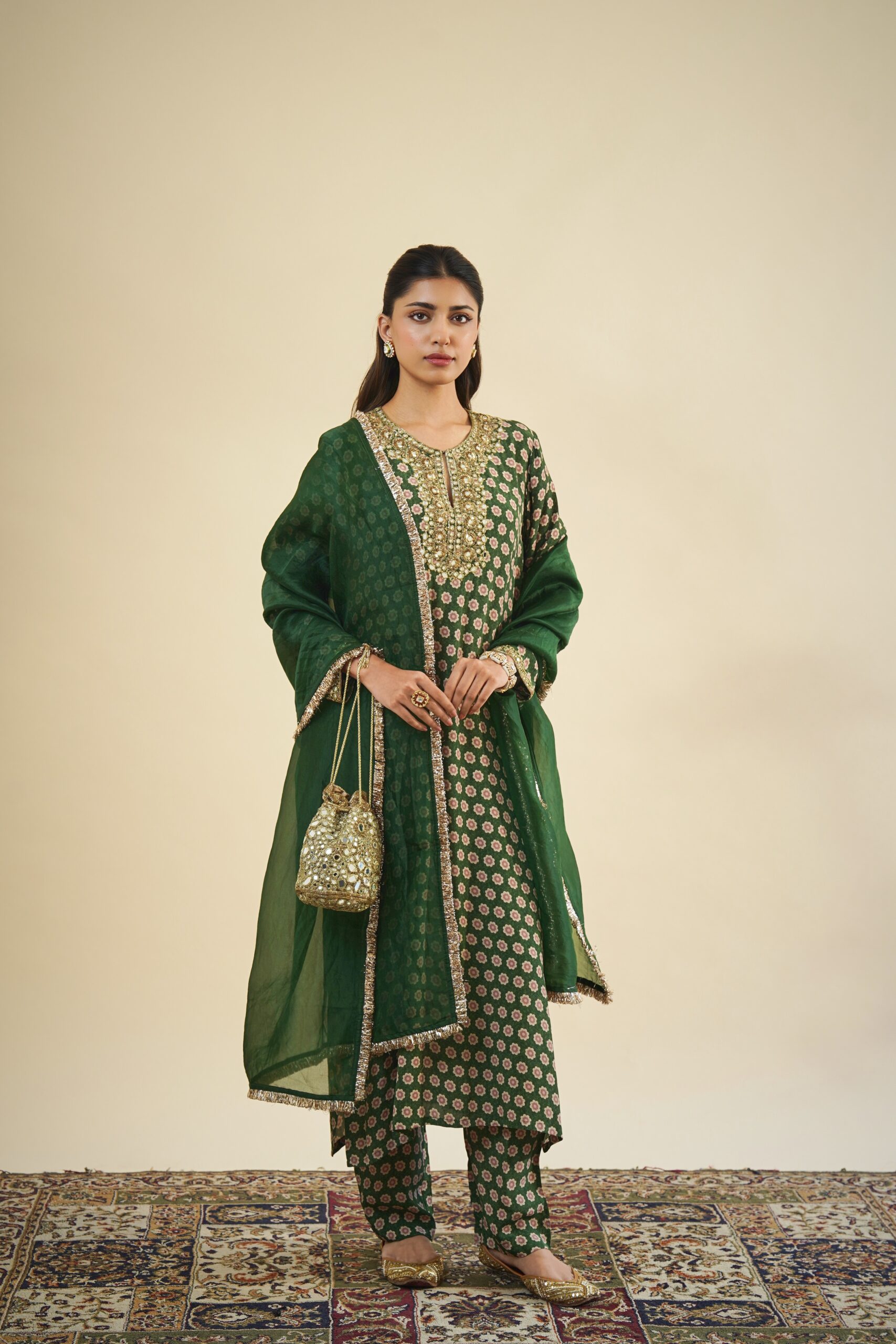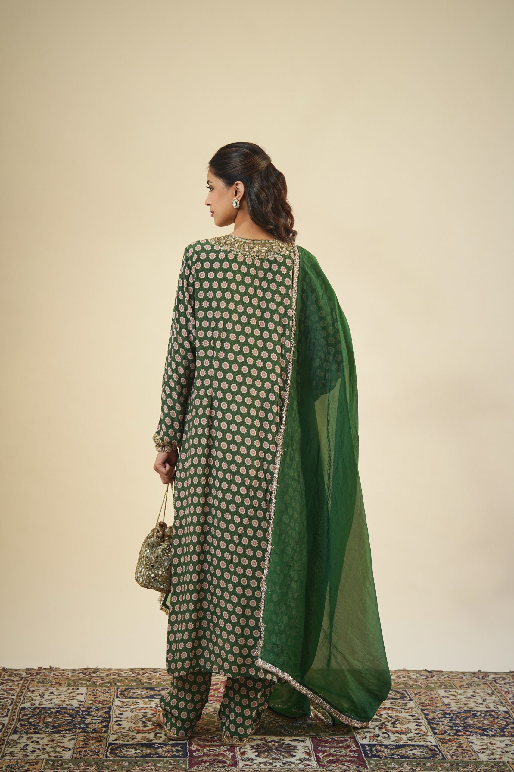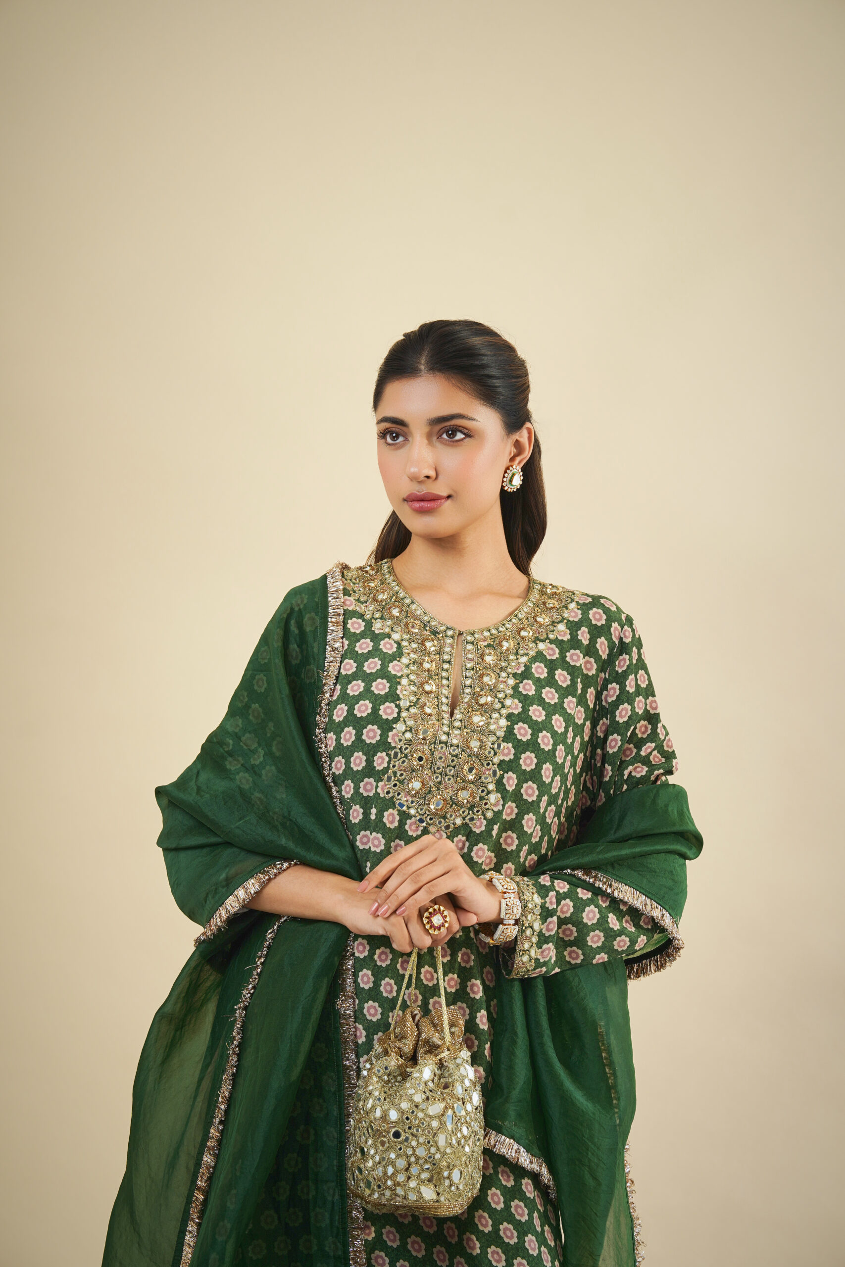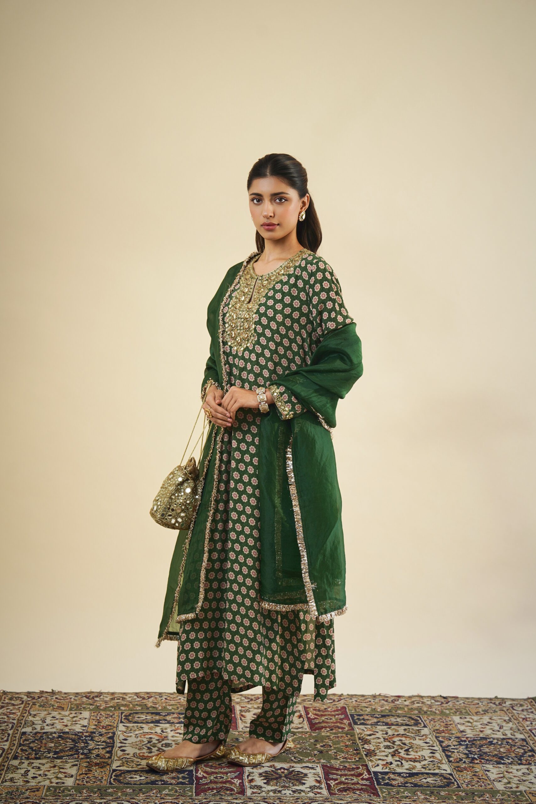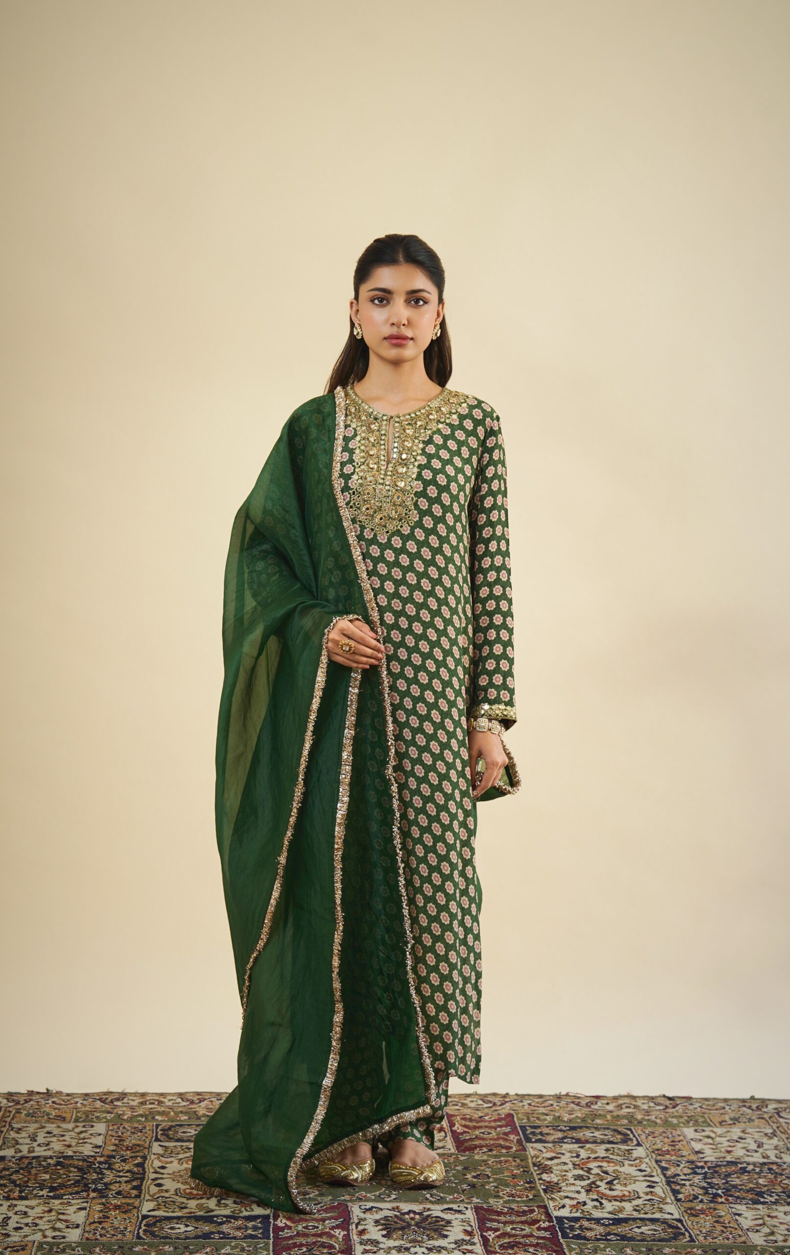 Green flower butti print & beige gold mirror, cutdana & kasab hand embroidered yoke kurta set paired with a solid green organza dupatta.