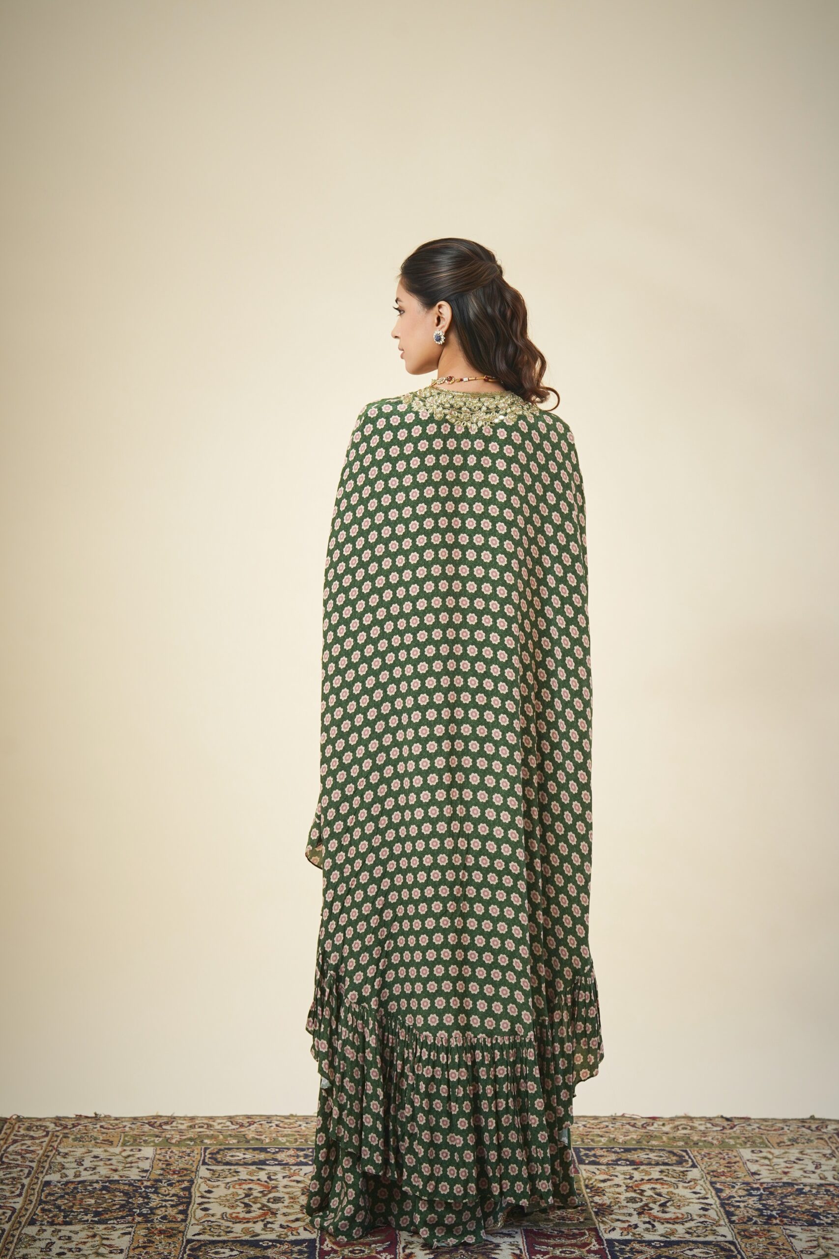 Green flower butti print & beige gold mirror, cutdana & kasab V neck hand embroidered yoke cape & kite pant.