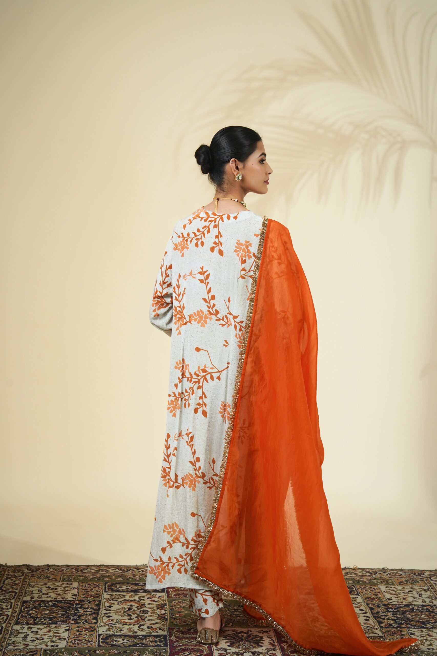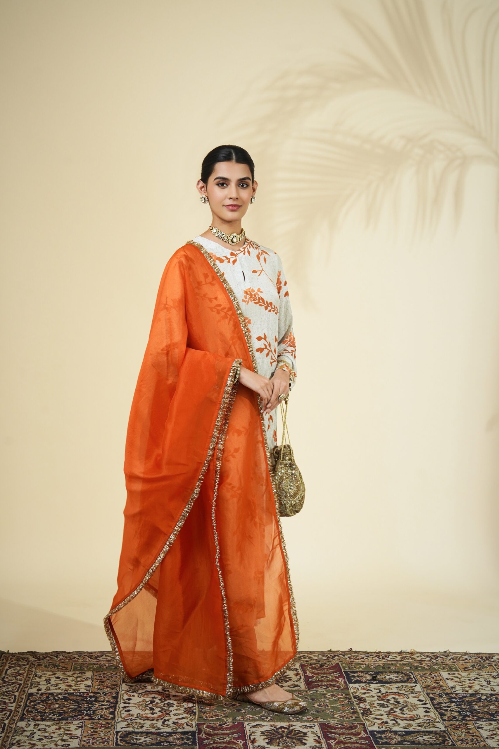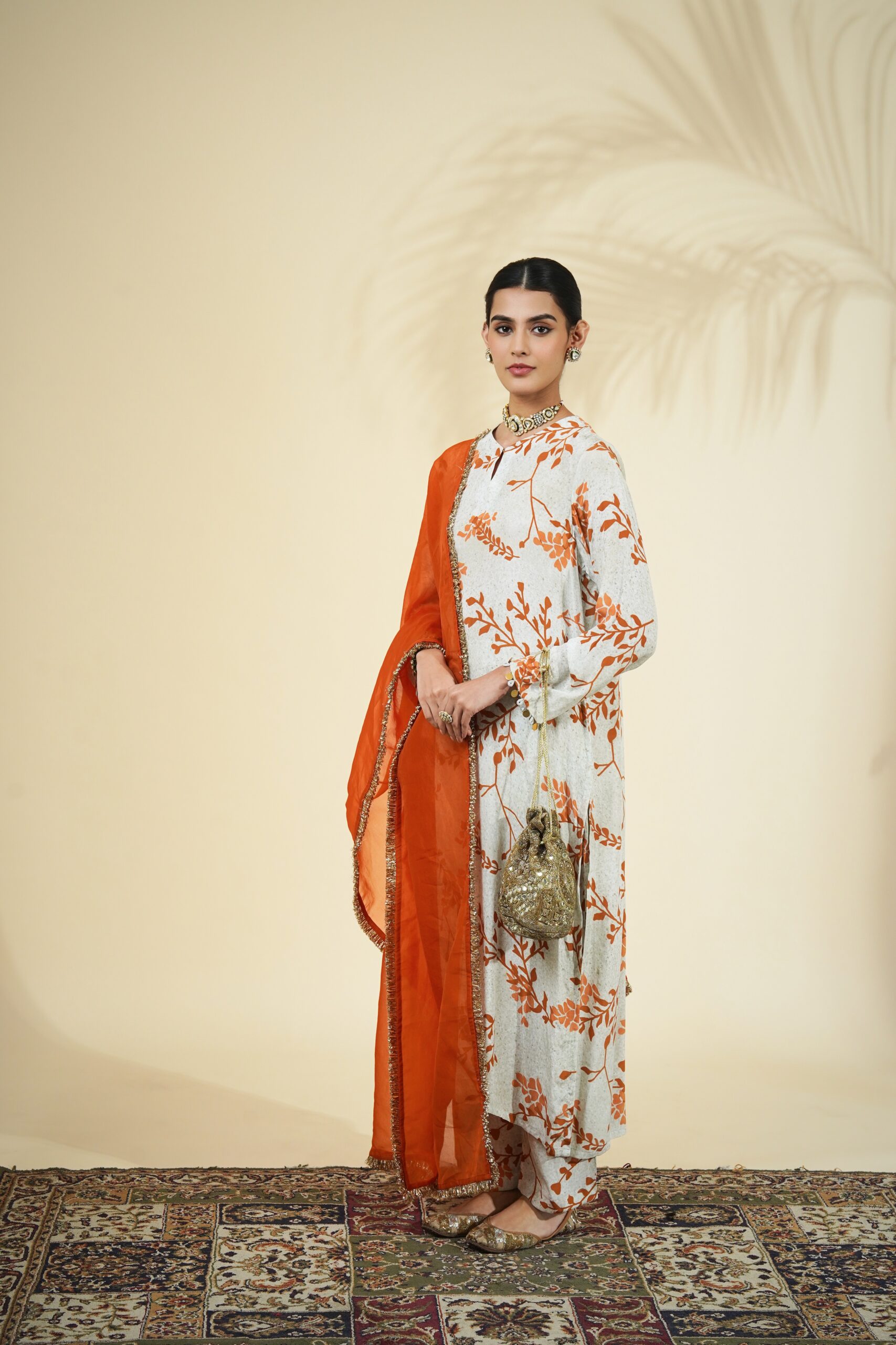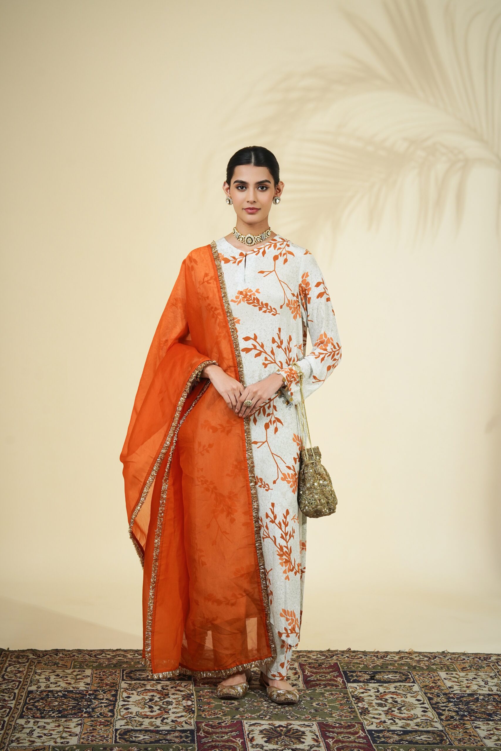 Mother of pearl & burnt orange twig print kurta & pant set paired with a solid burnt orange organza dupatta.
