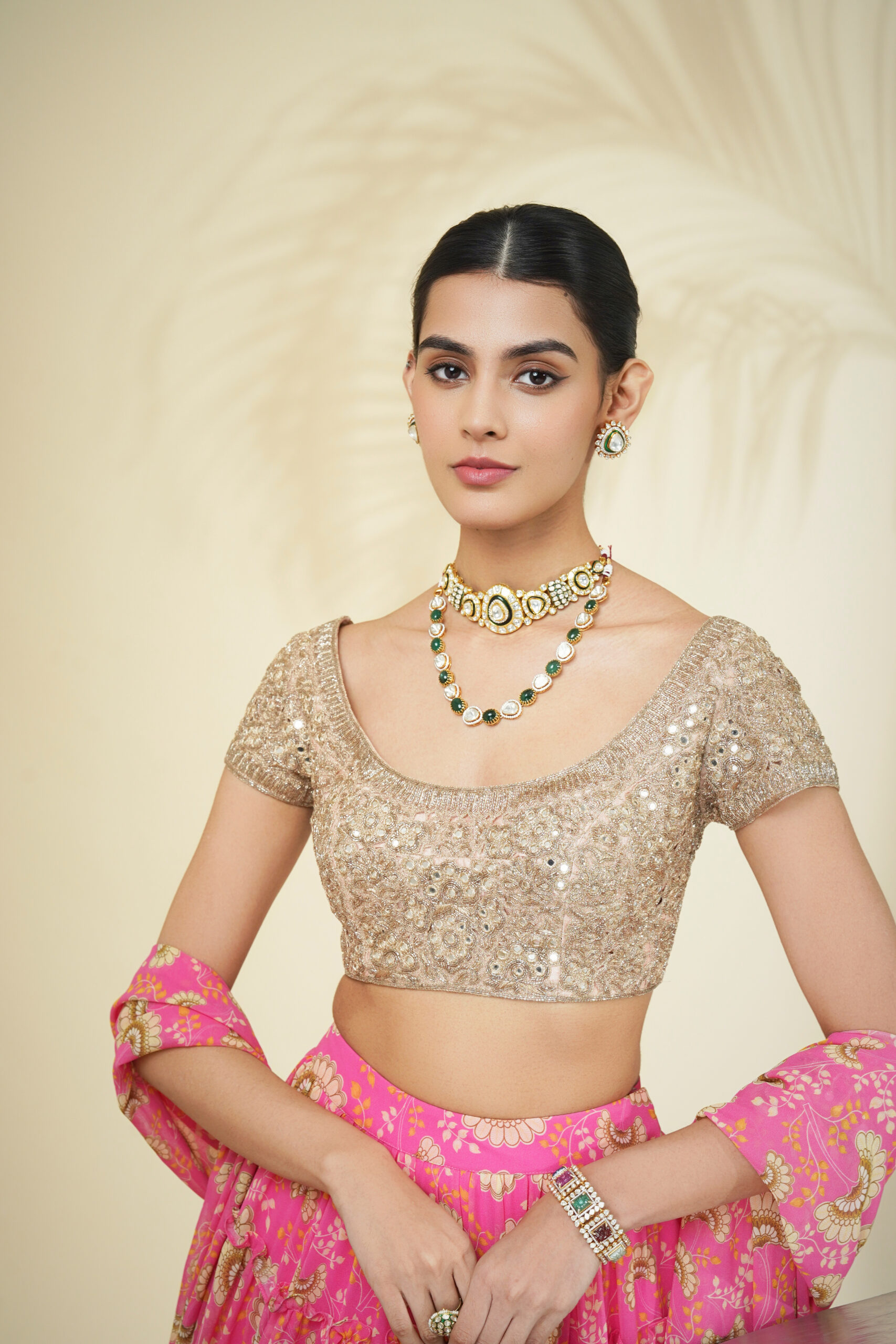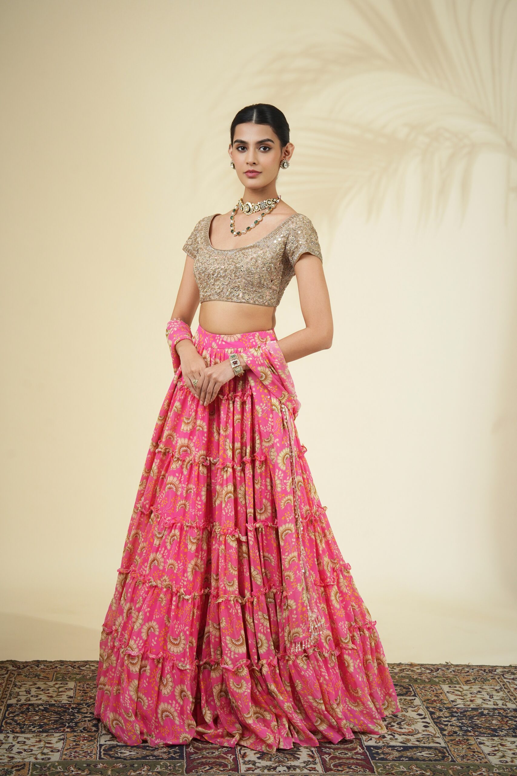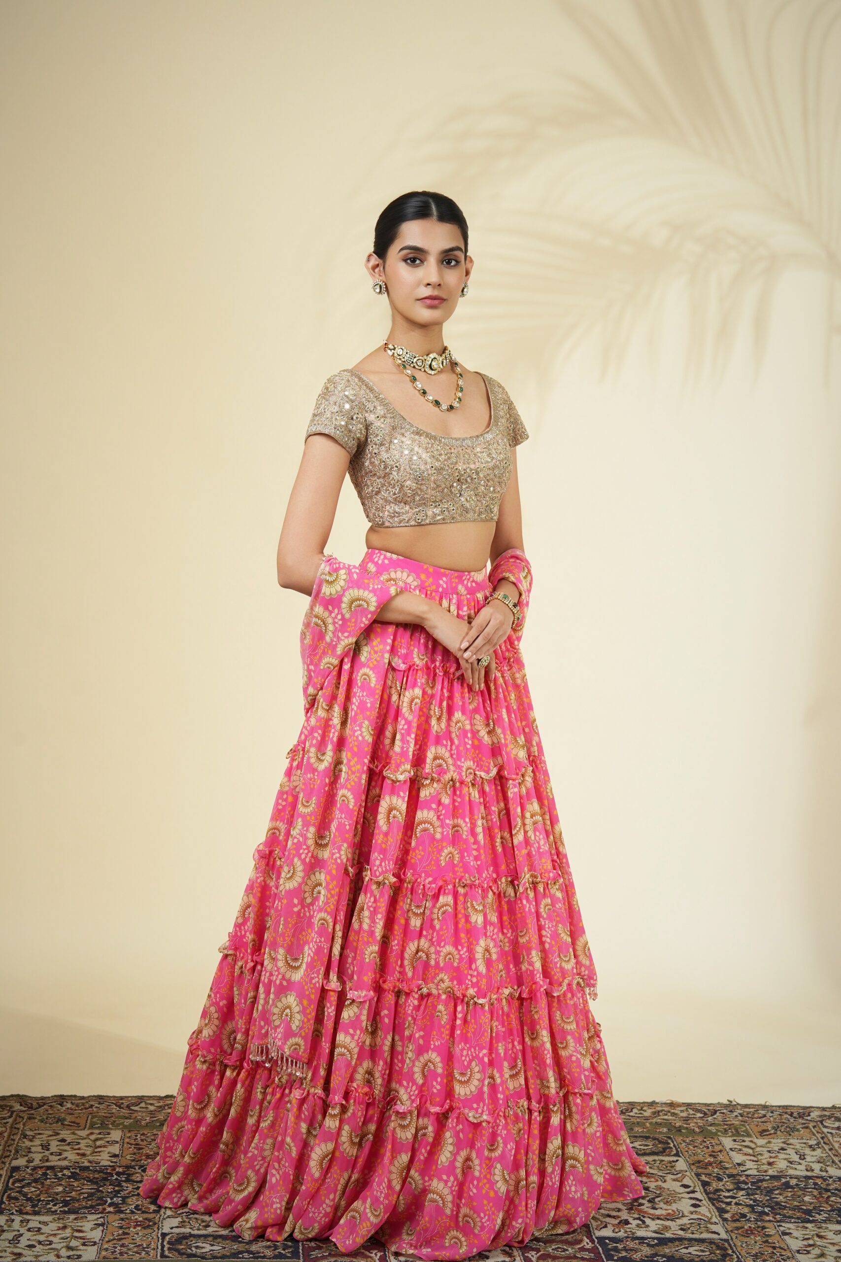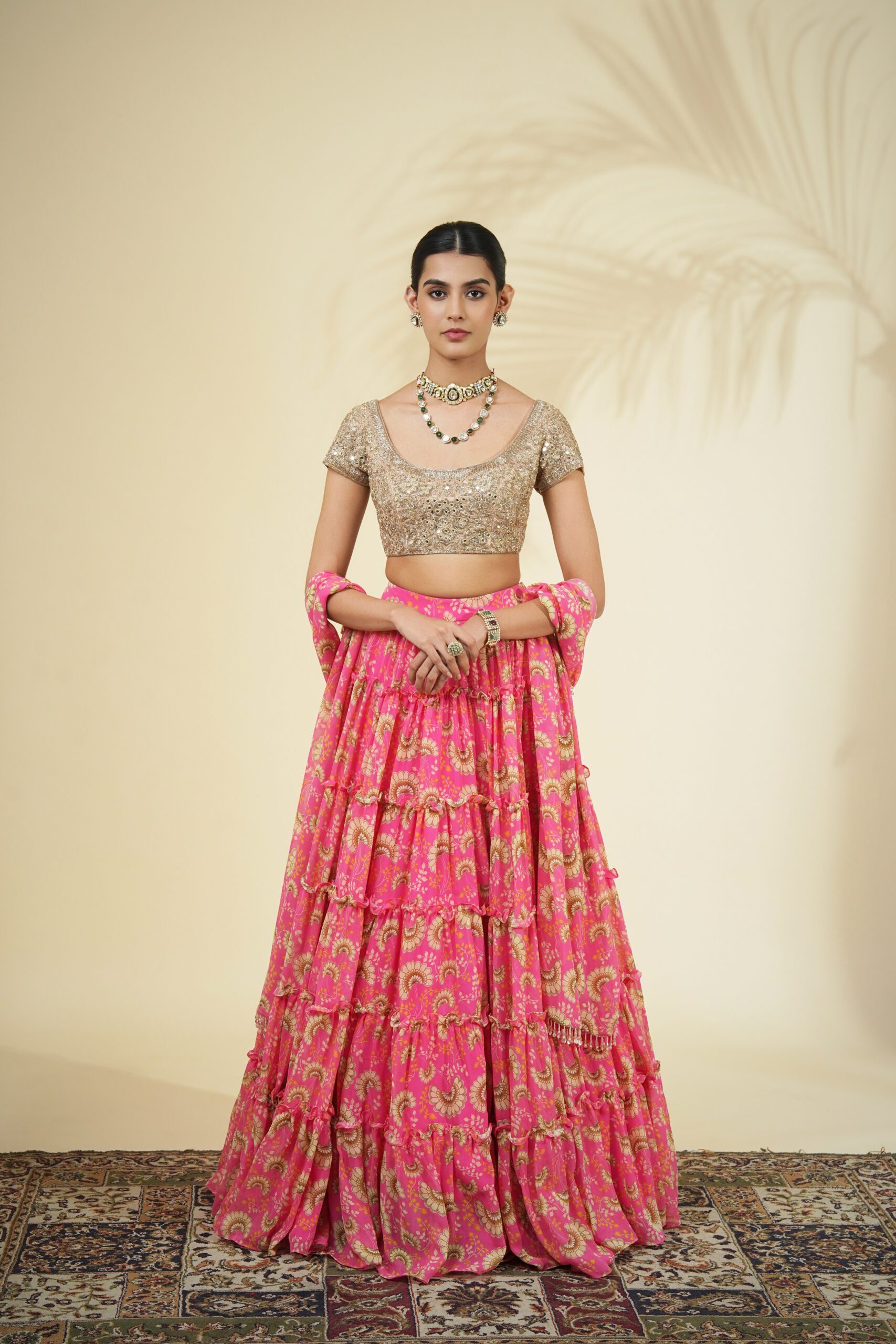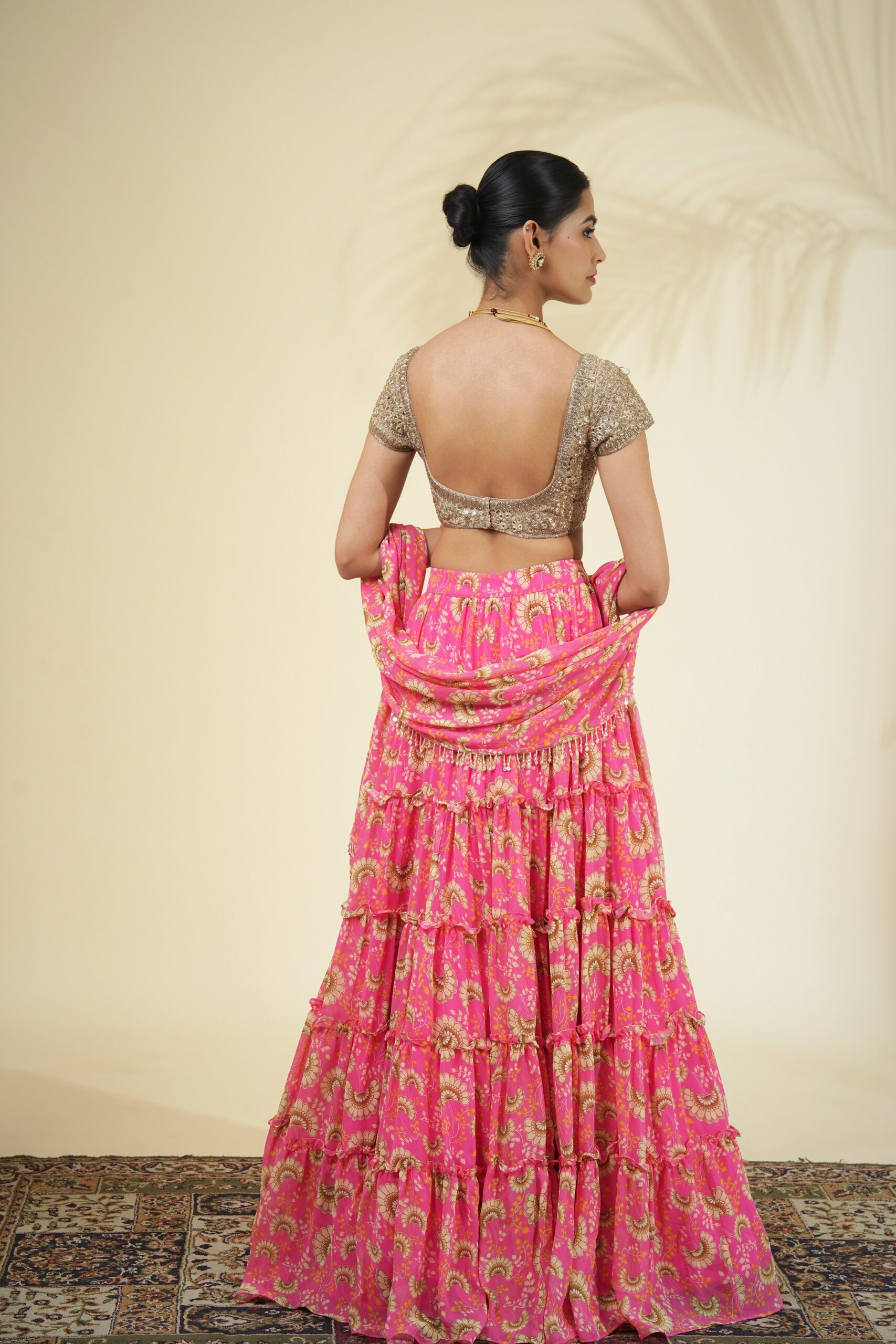 Pink fan flower print tiered skirt & slim dupatta with crystal tassel detailing paired with an rose gold mirror, cutdana & kasab hand embroidered blouse.