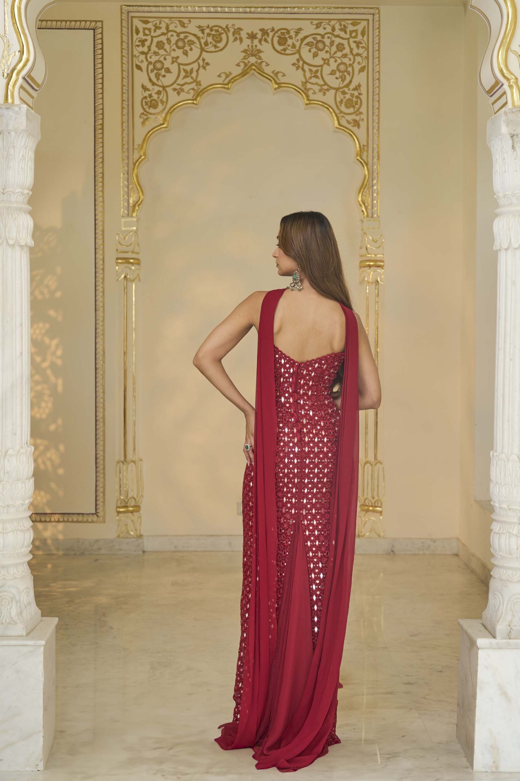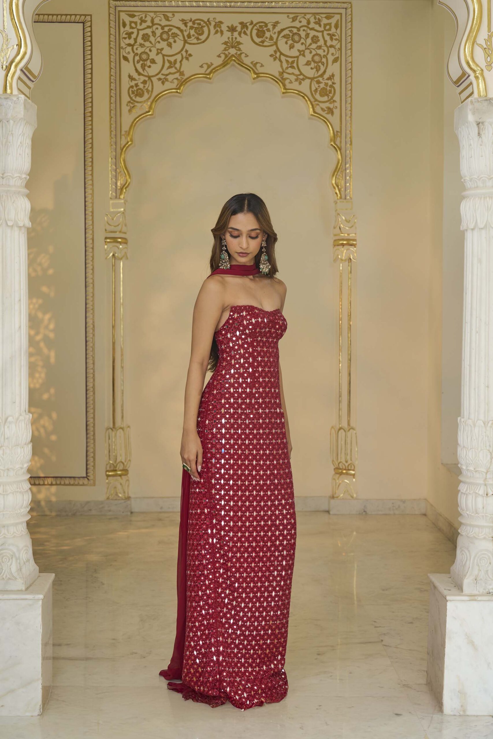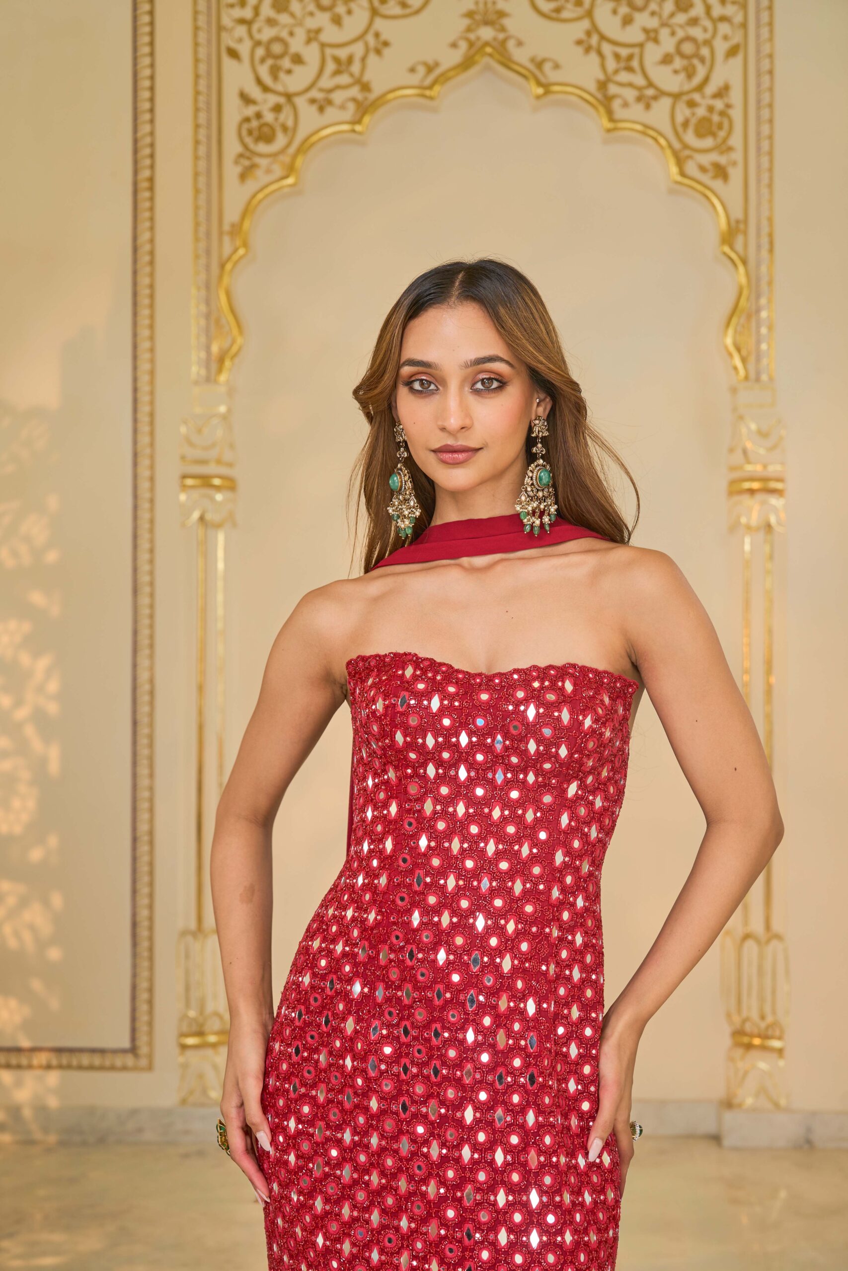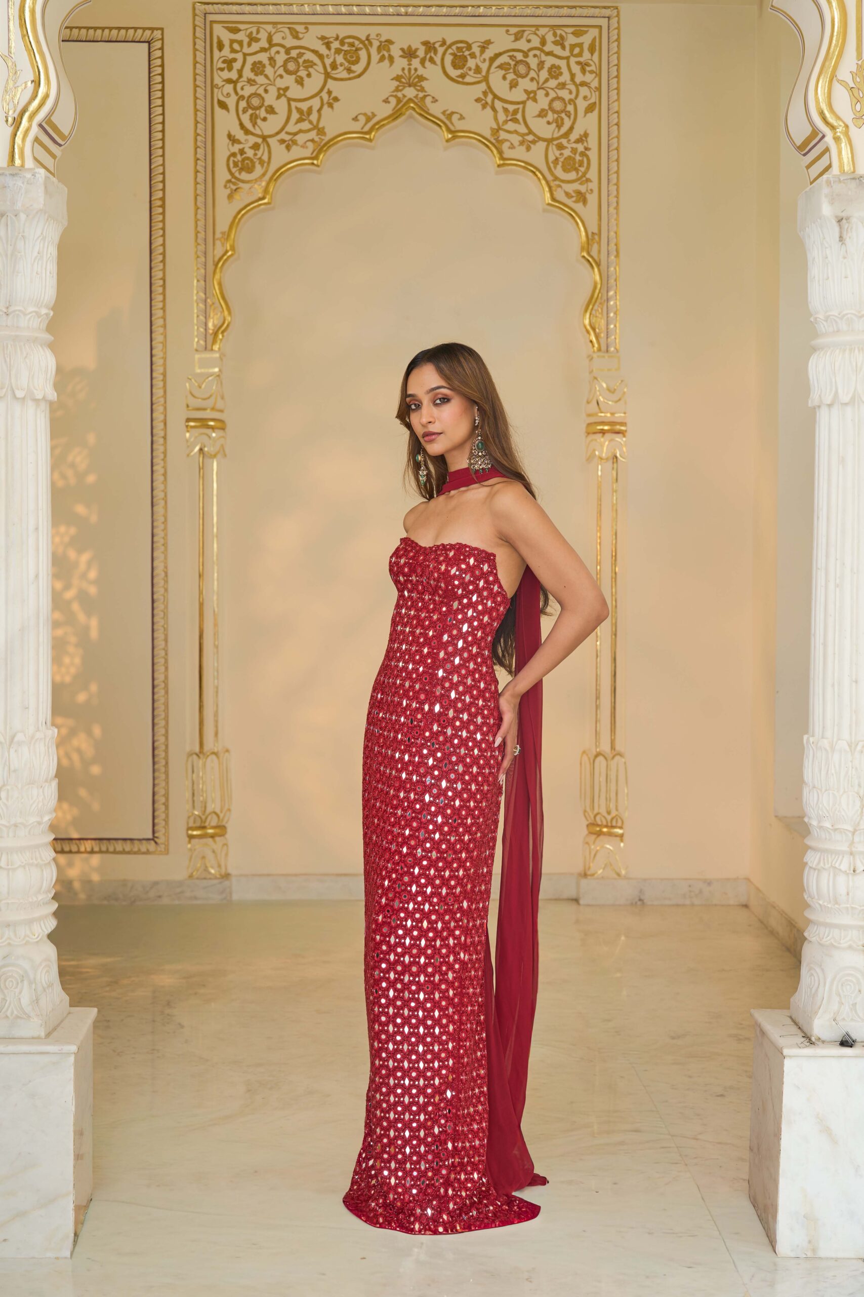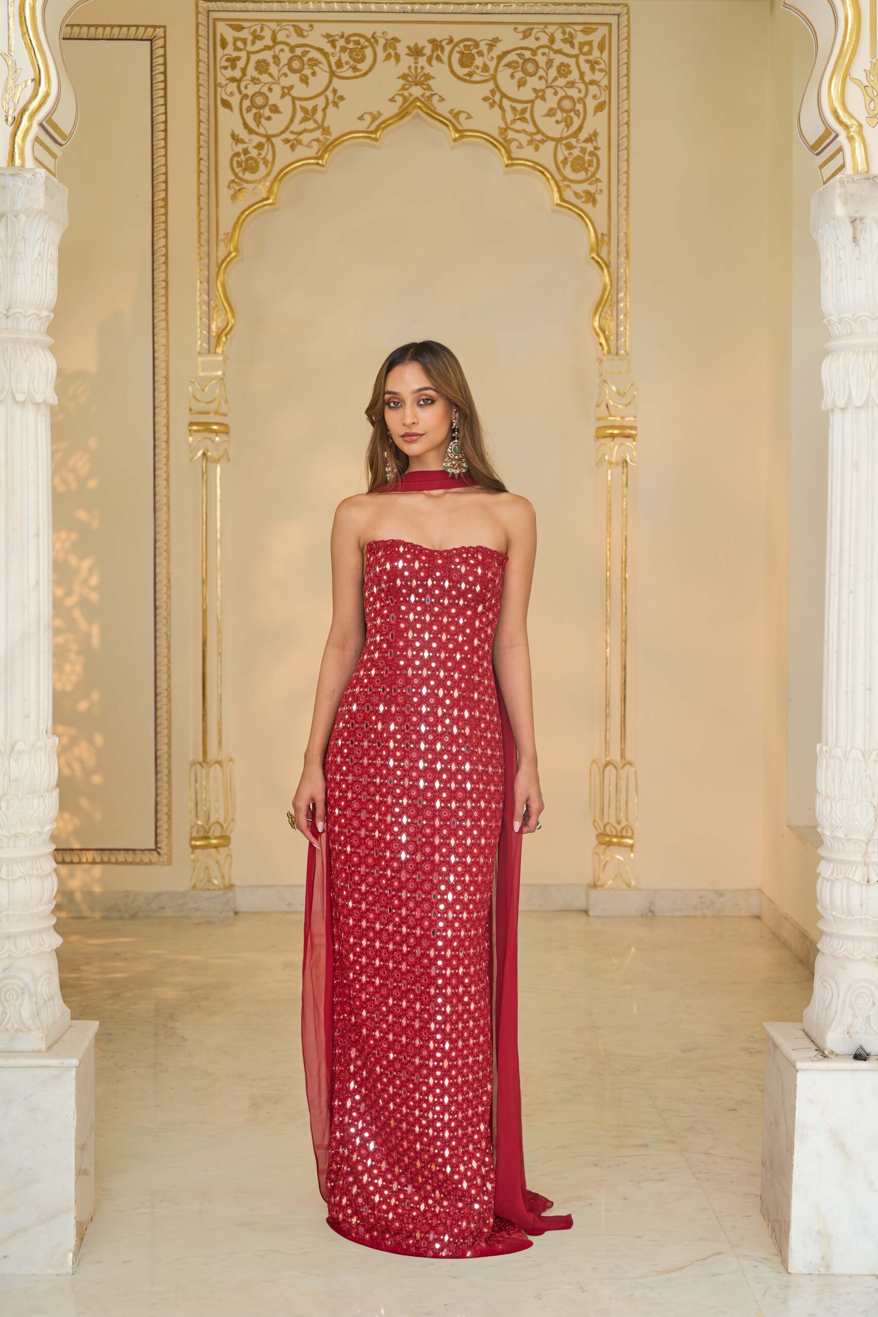 All red mirror & cutdana hand embroidered long bodycon dress with a solid georgette slim dupatta.