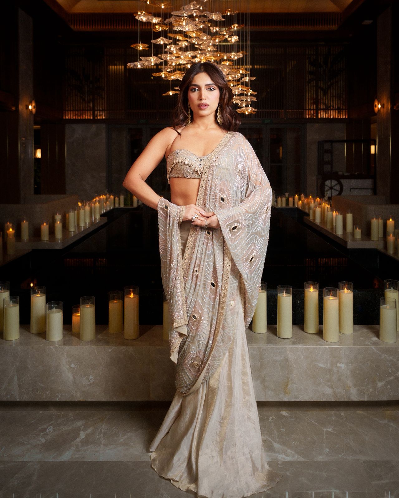 Rose gold tissue godet sari with a heavy mirror & multi colour cutdana hand embroidered jaal pallu & blouse set.