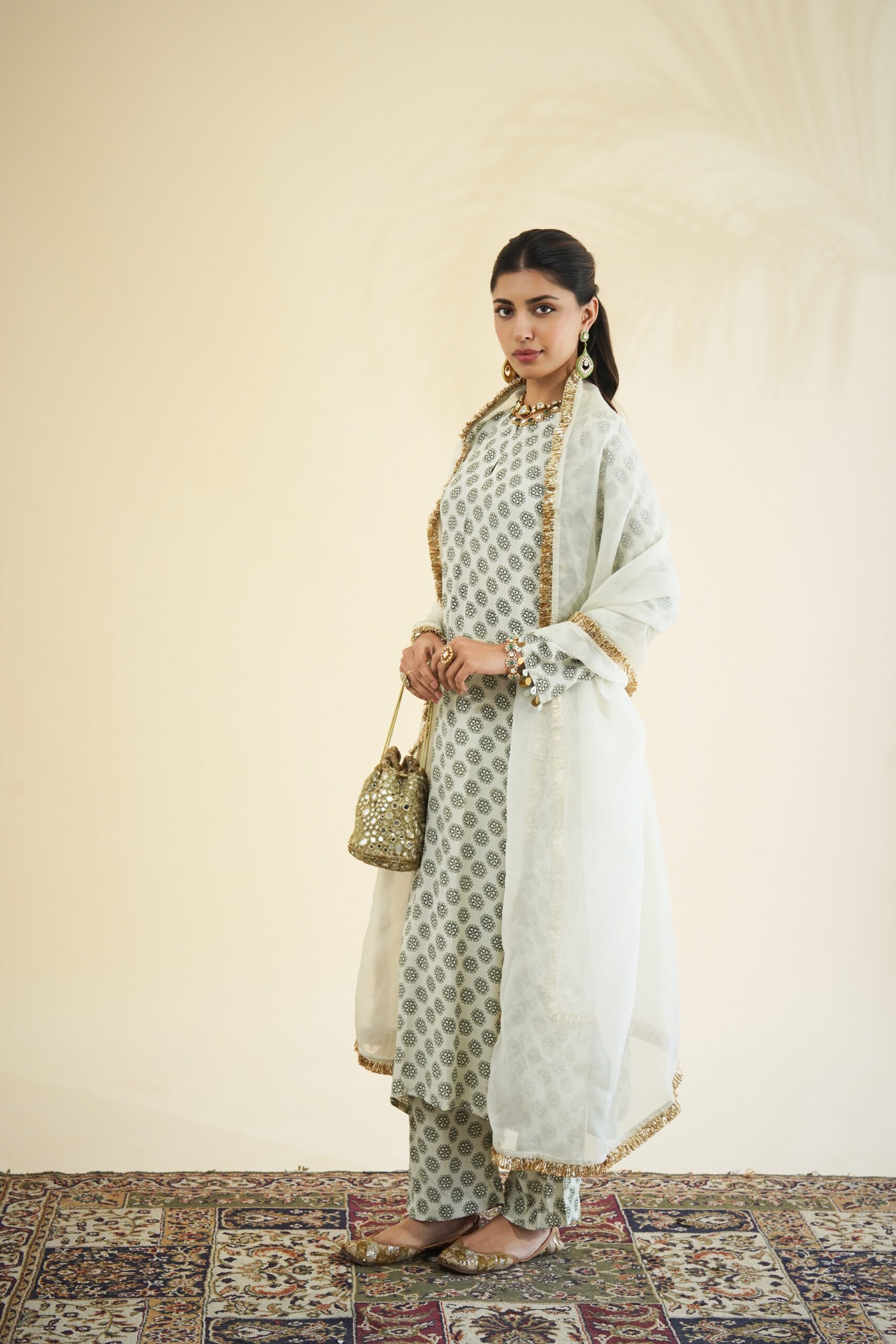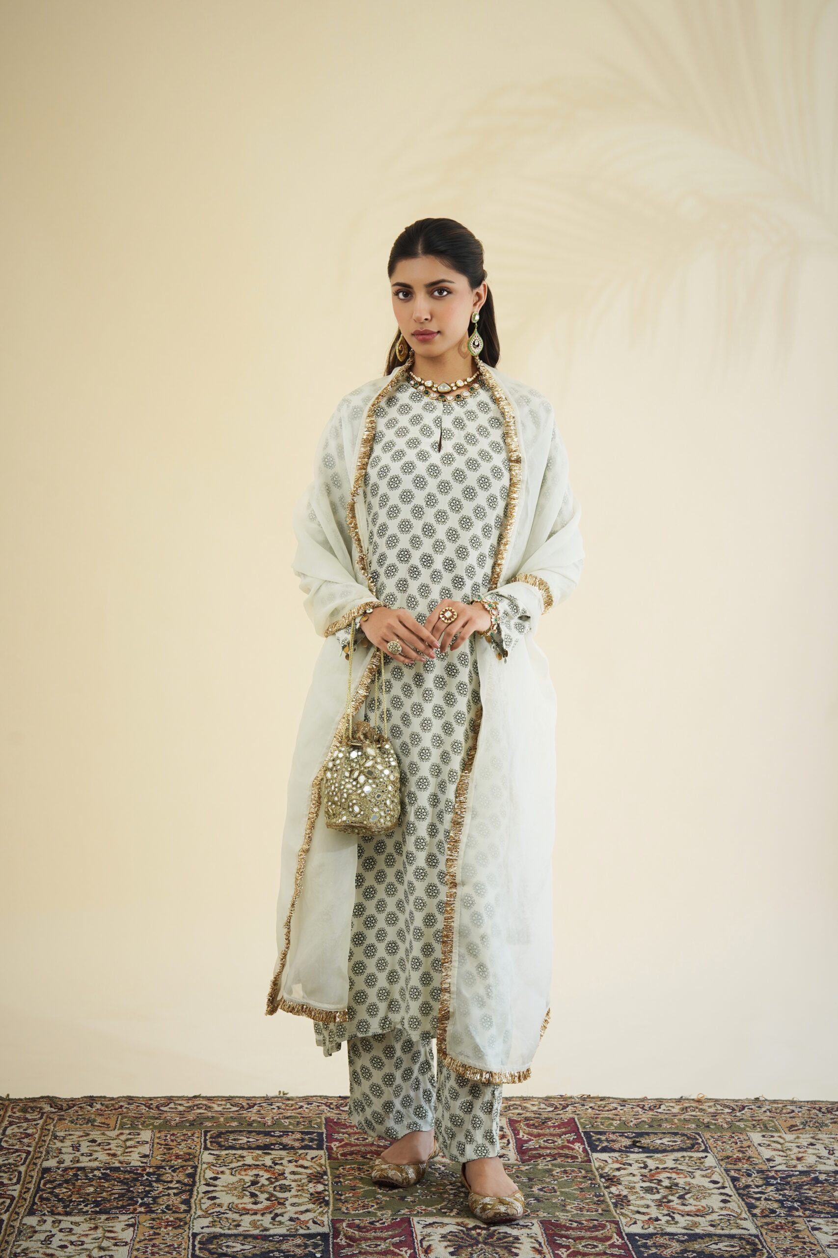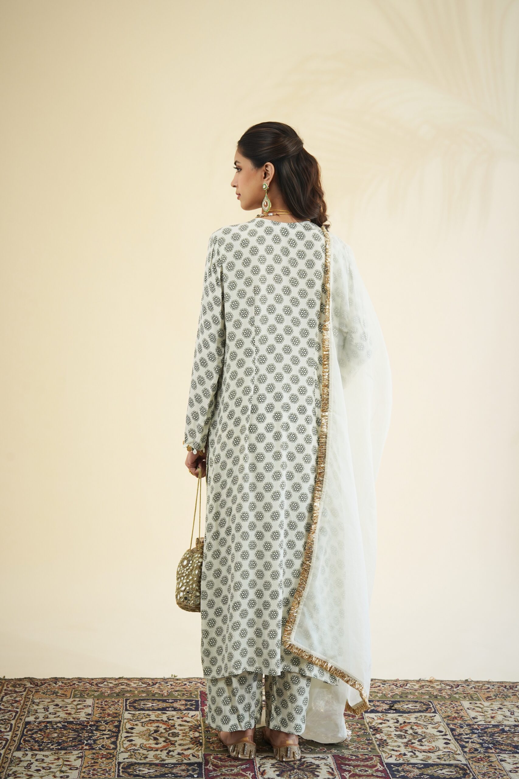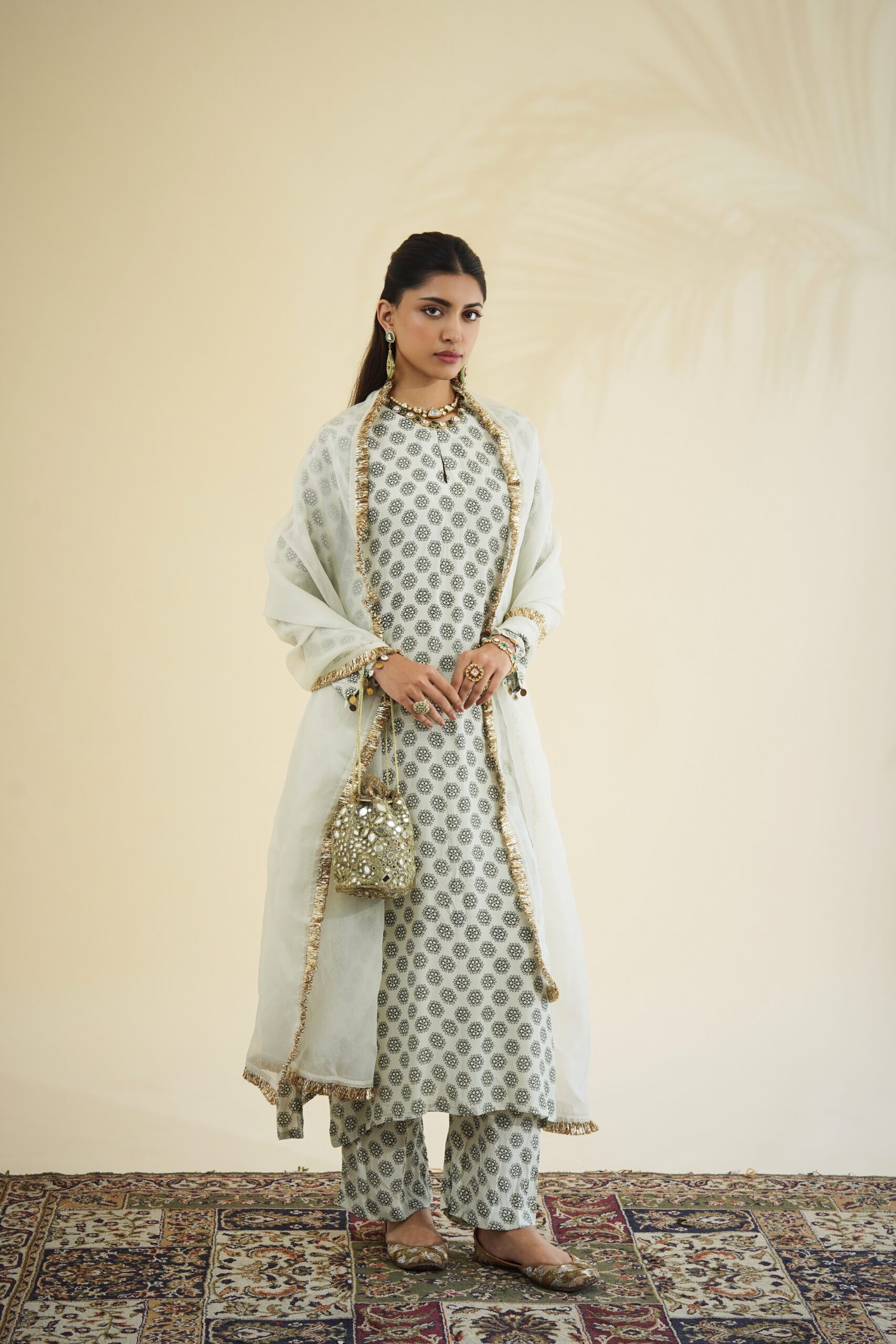 Sand & black butti print kurta & pant set paired with a solid sand organza dupatta.