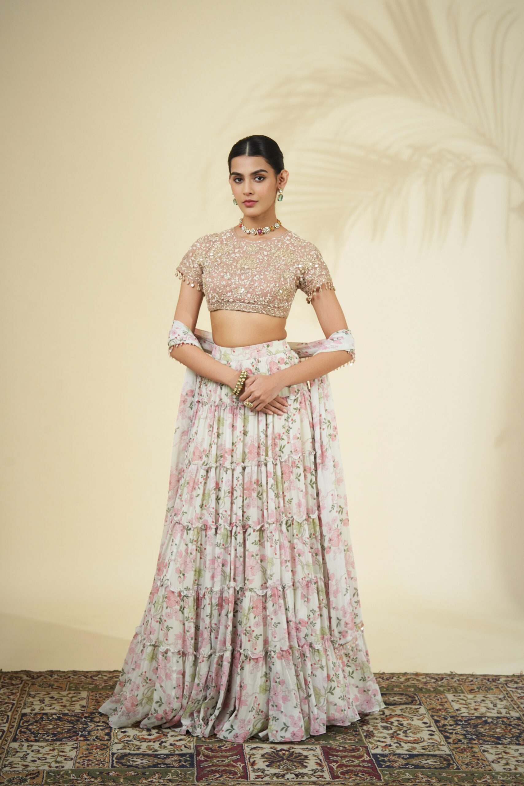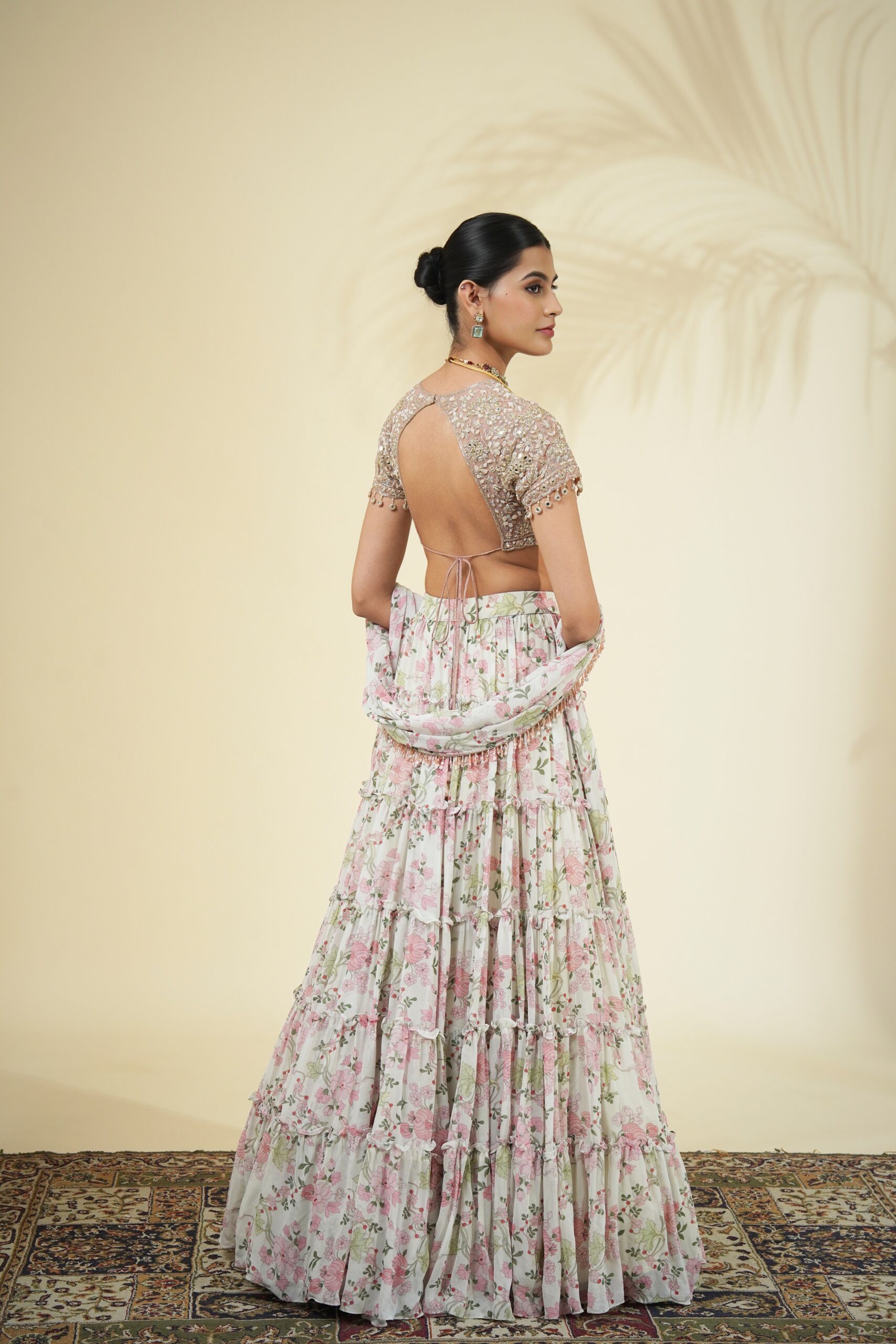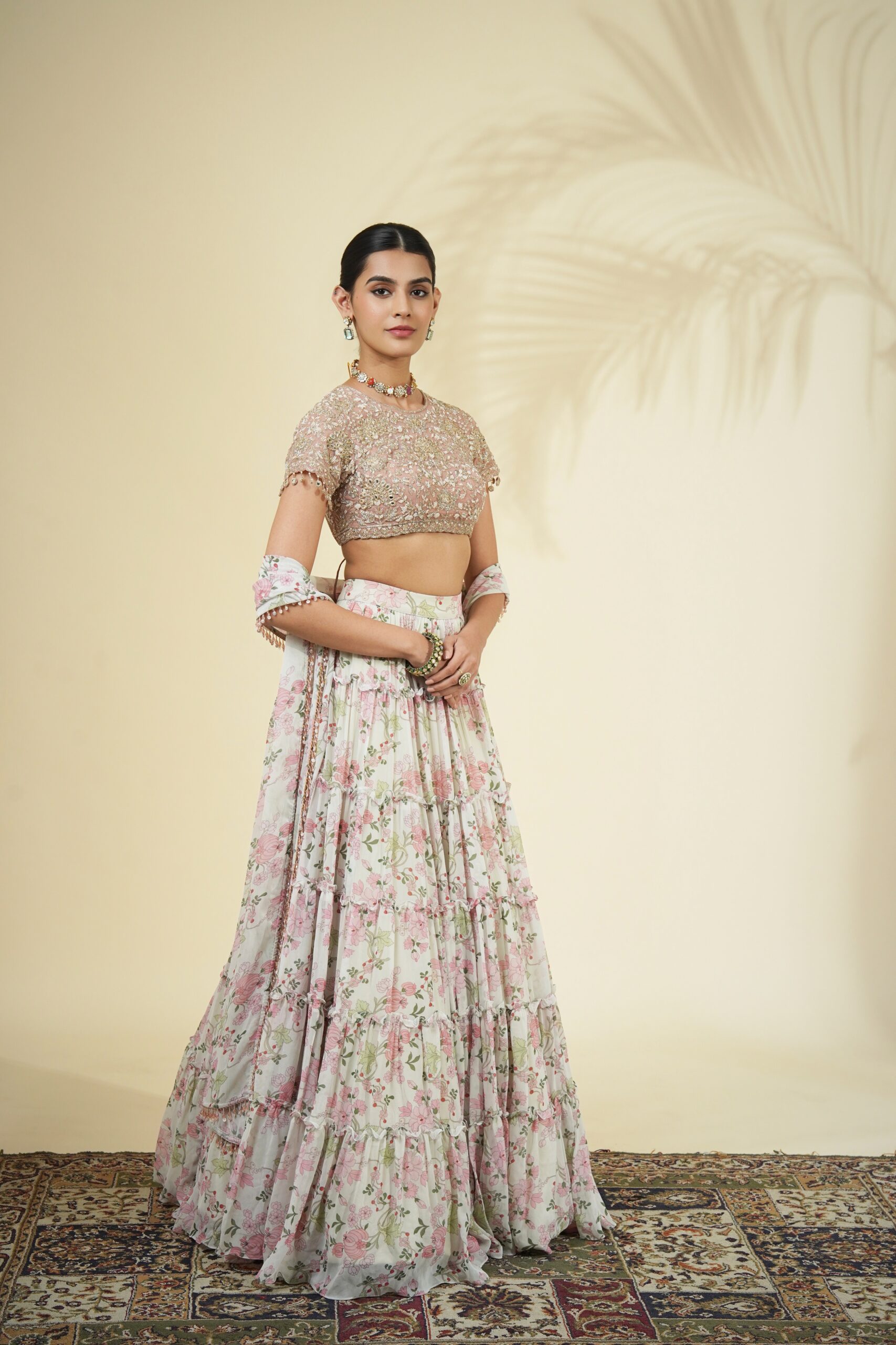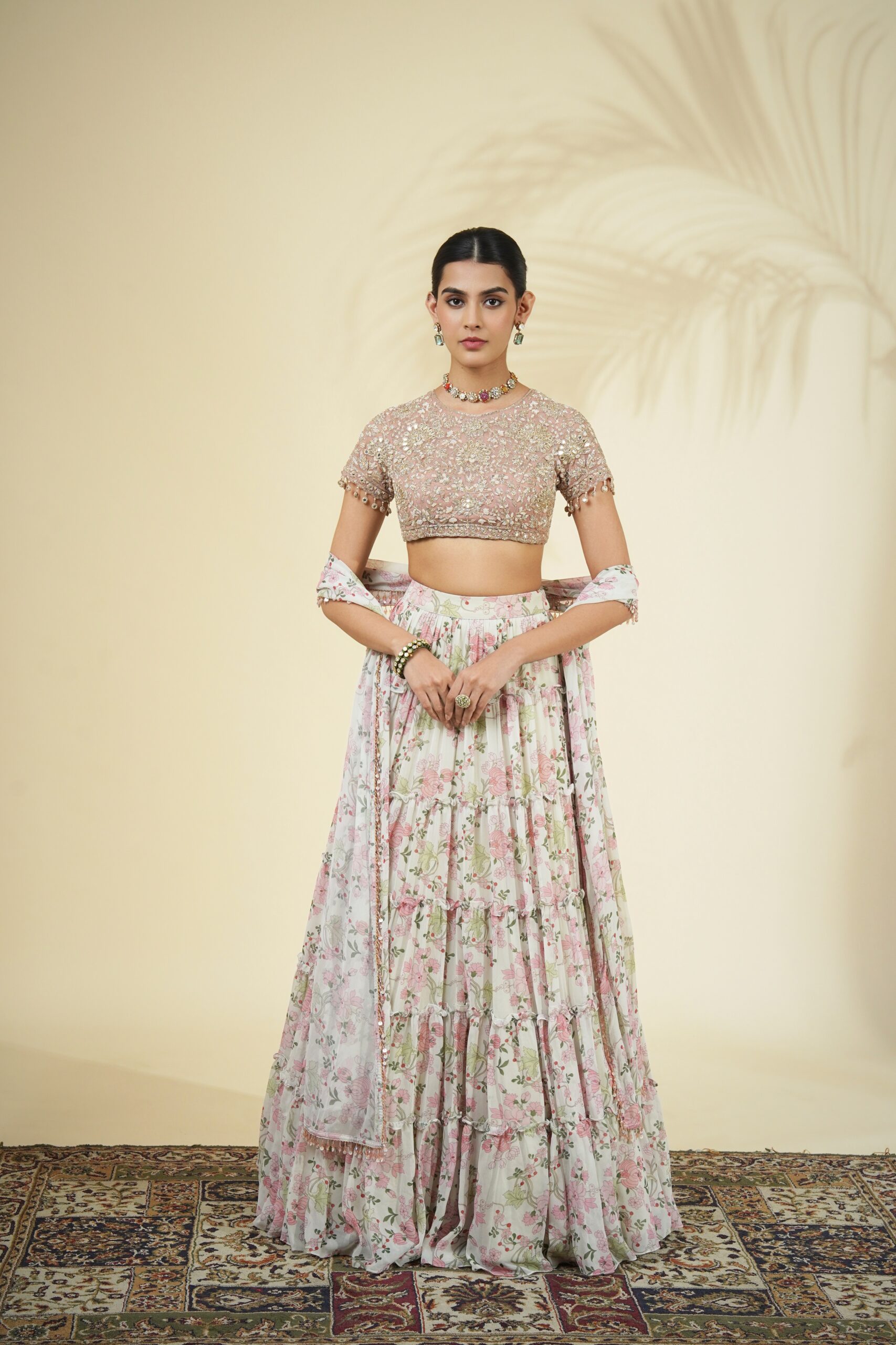 Coconut floral print tiered skirt & slim dupatta with crystal tassel detailing paired with a dust pink & rose gold mirror, cutdana & kasab hand embroidered blouse.