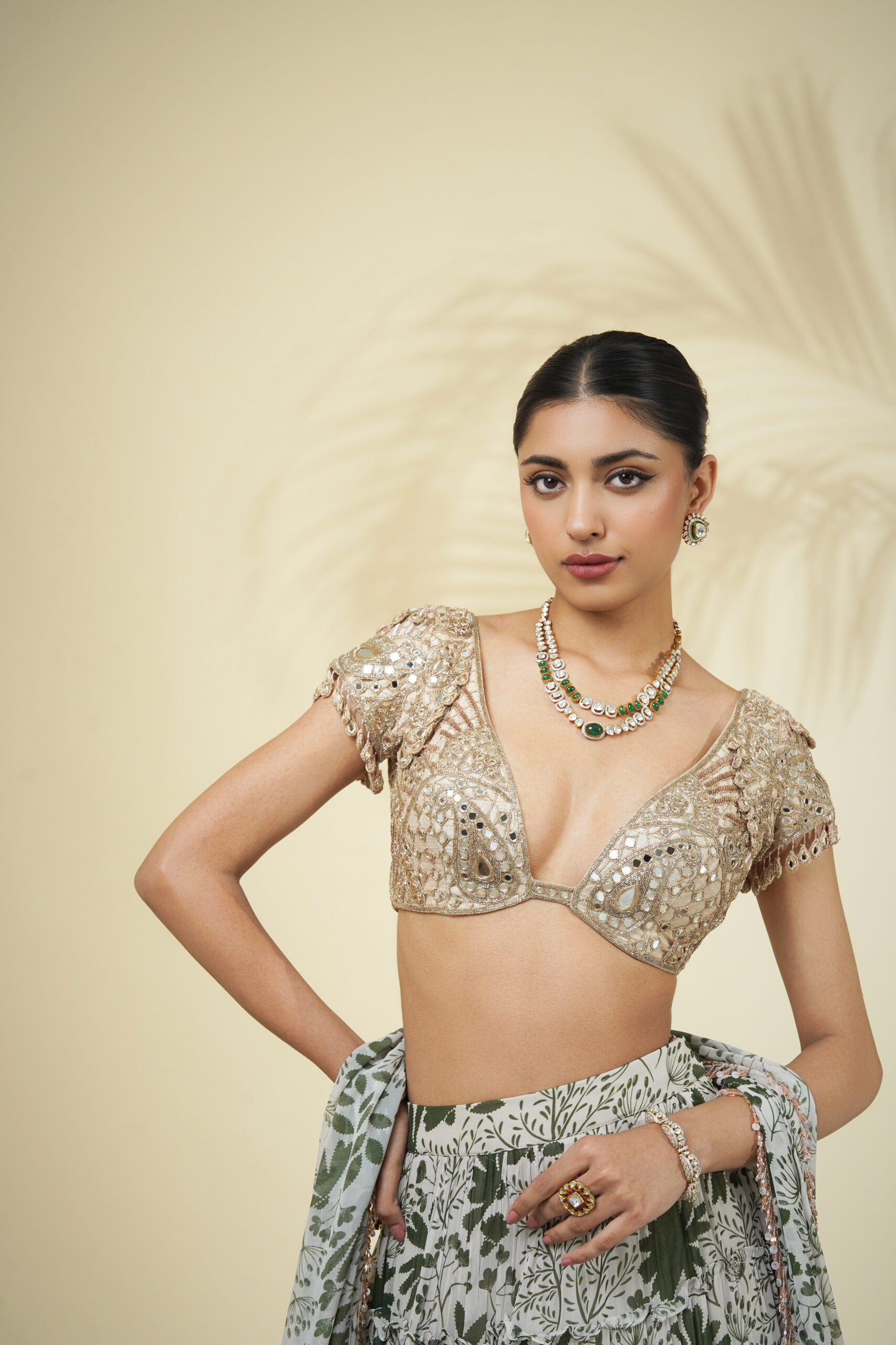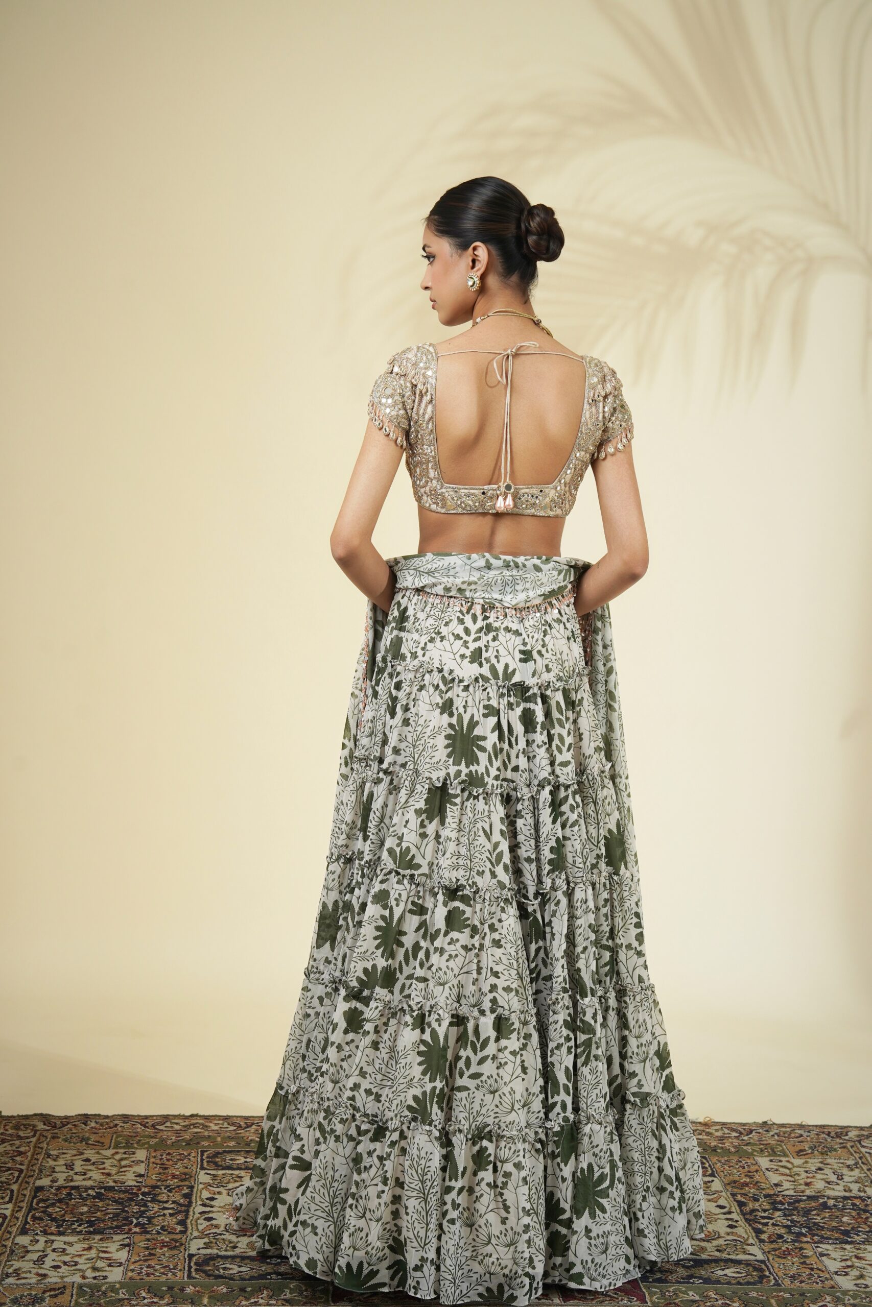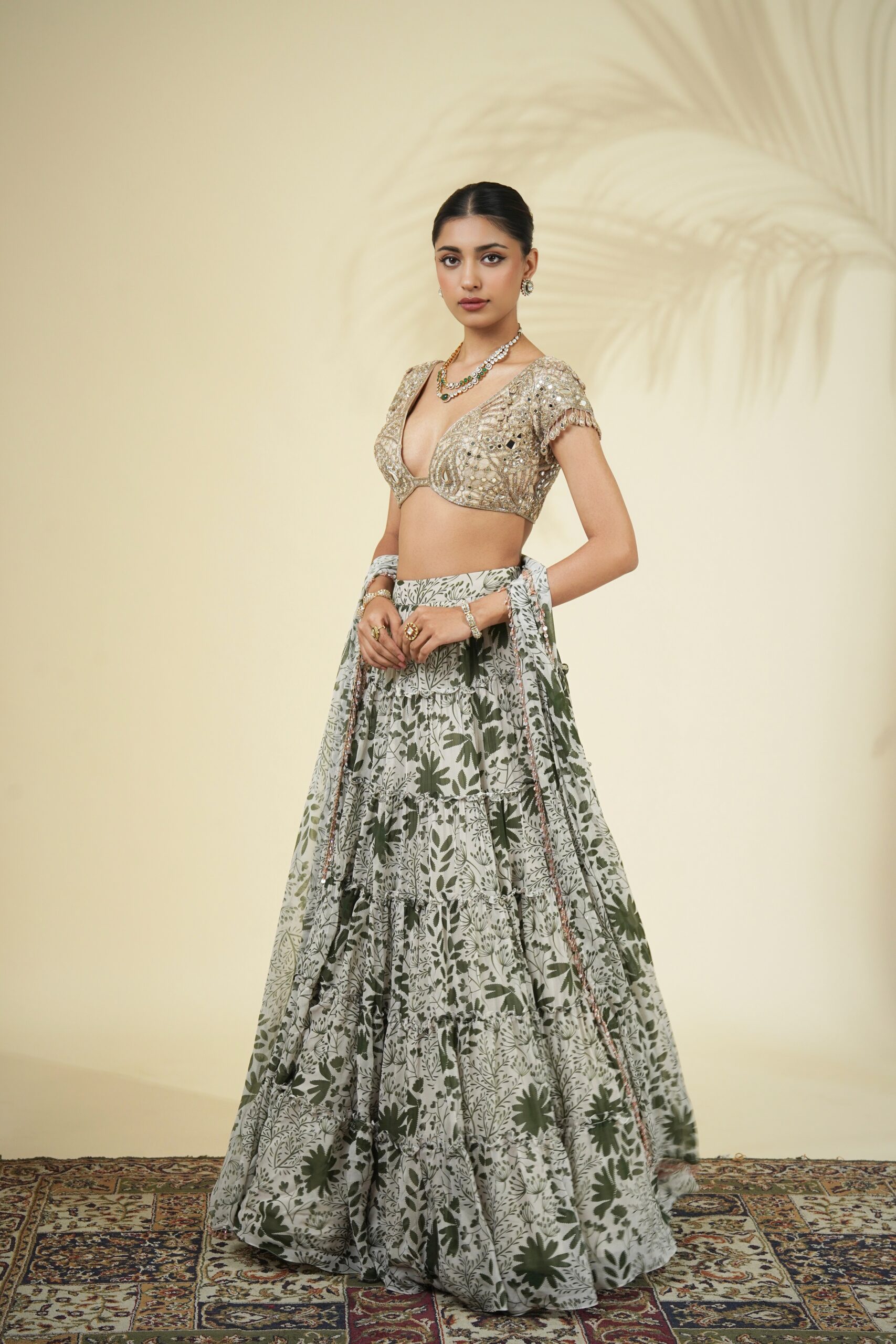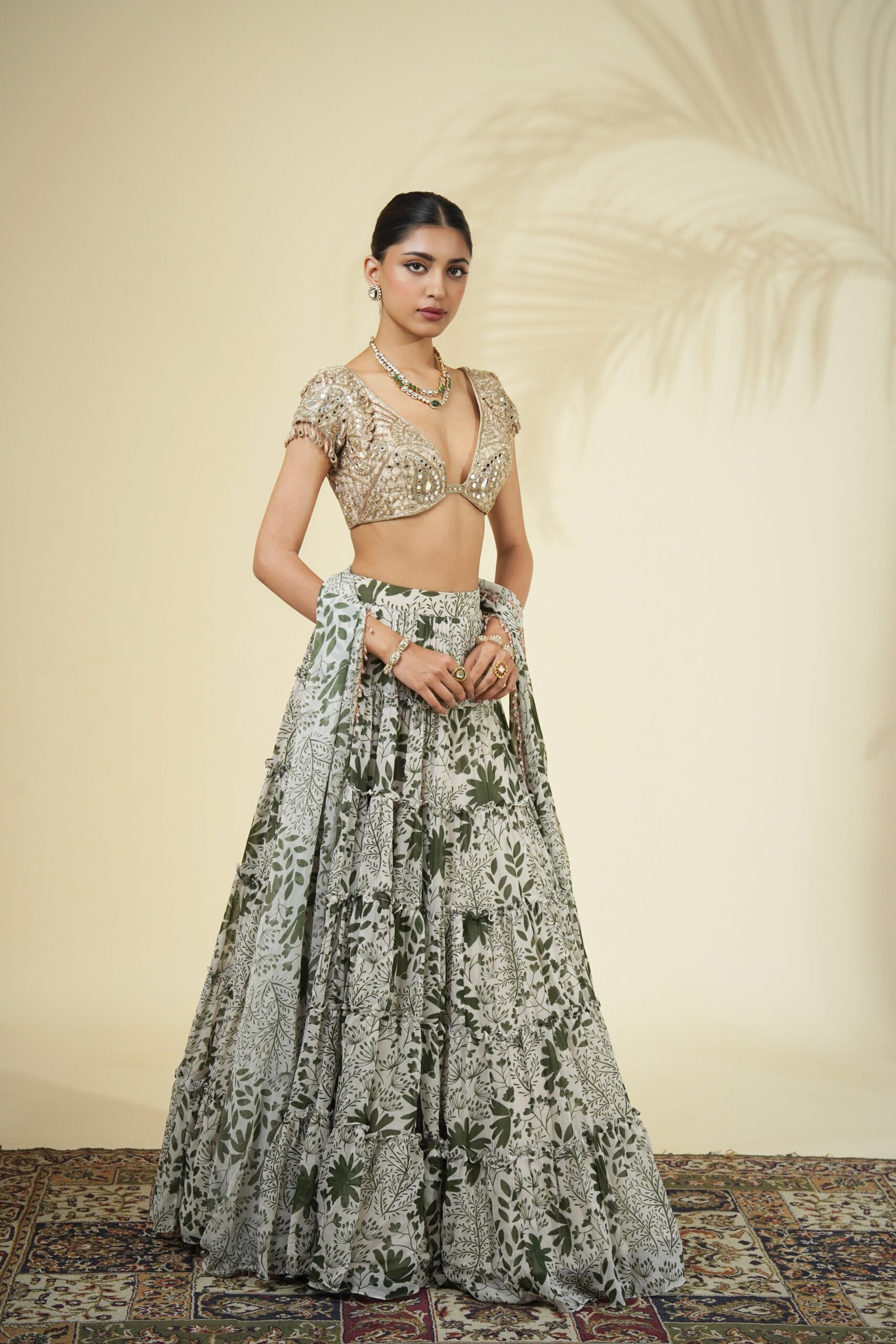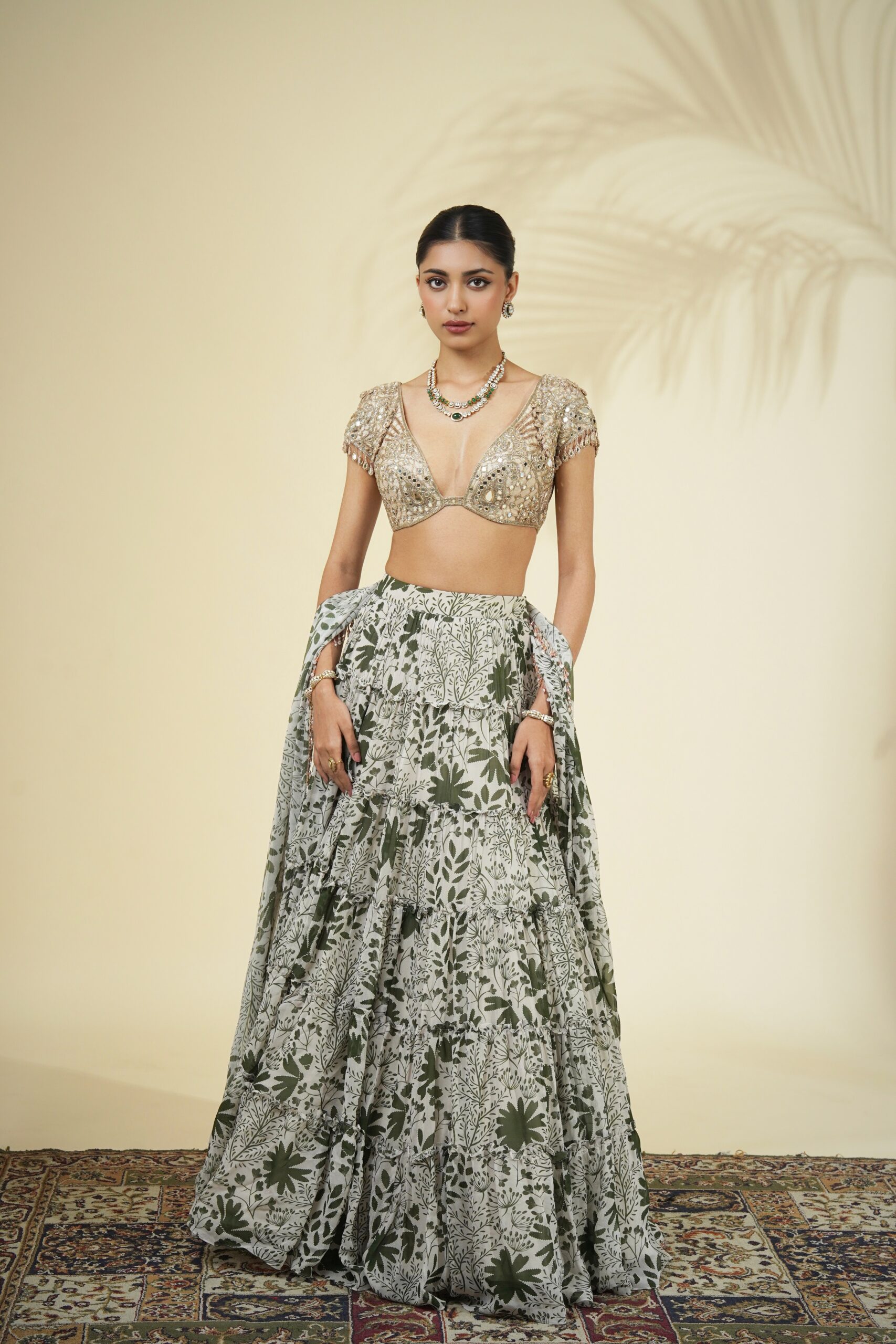 Sand & green garden print tiered skirt & slim dupatta with crystal tassel detailing paired with a rose gold mirror, cutdana & kasab hand embroidered blouse.