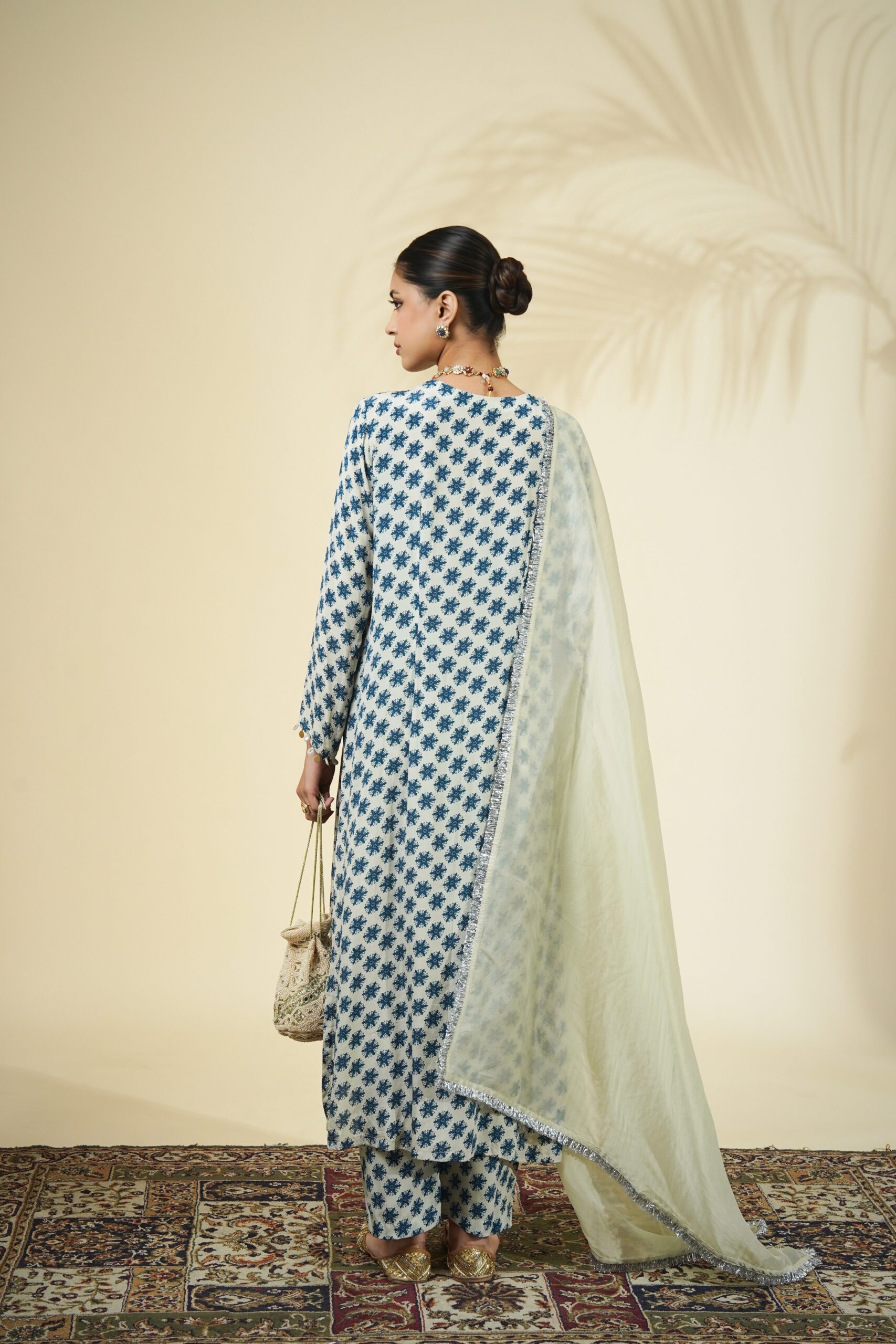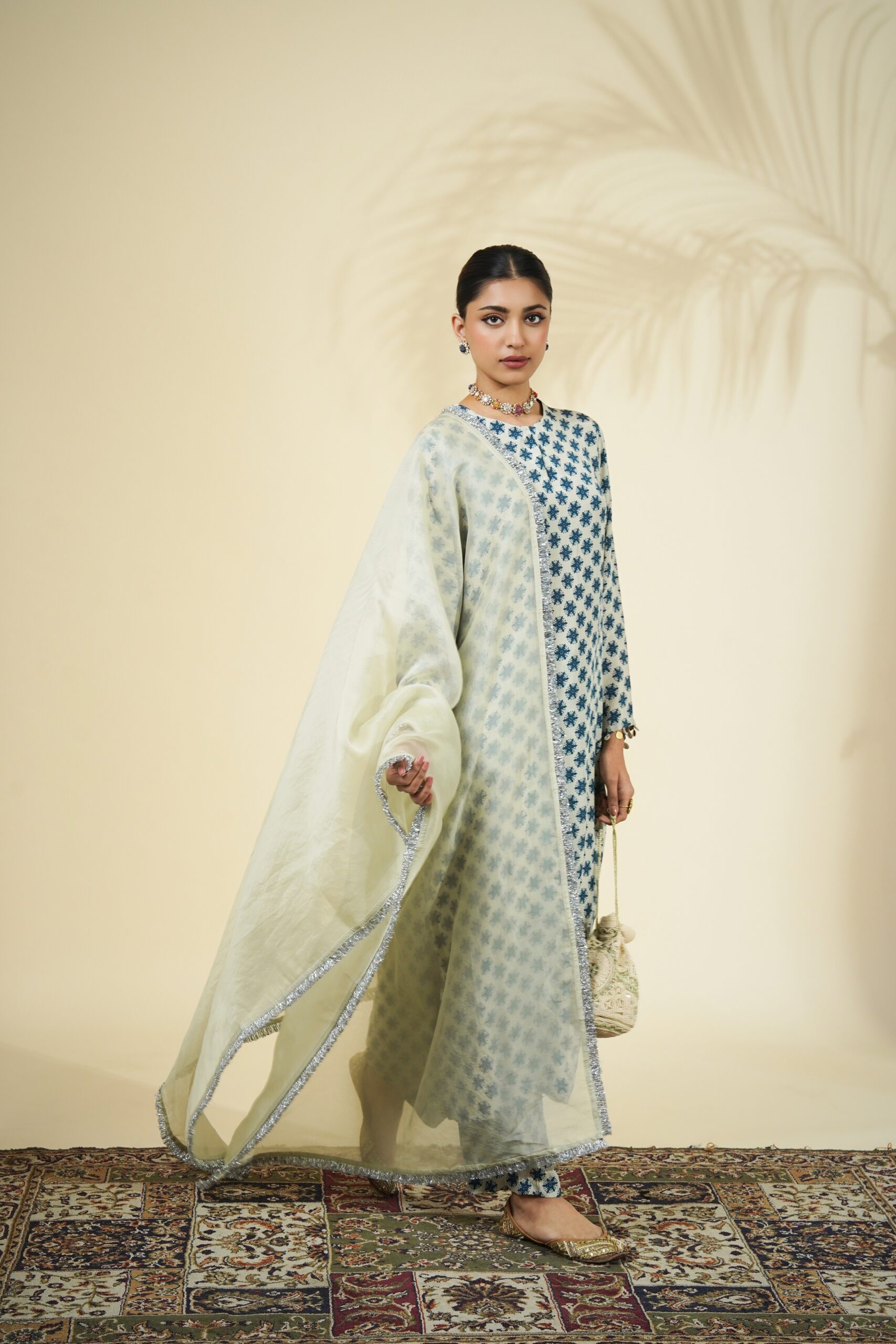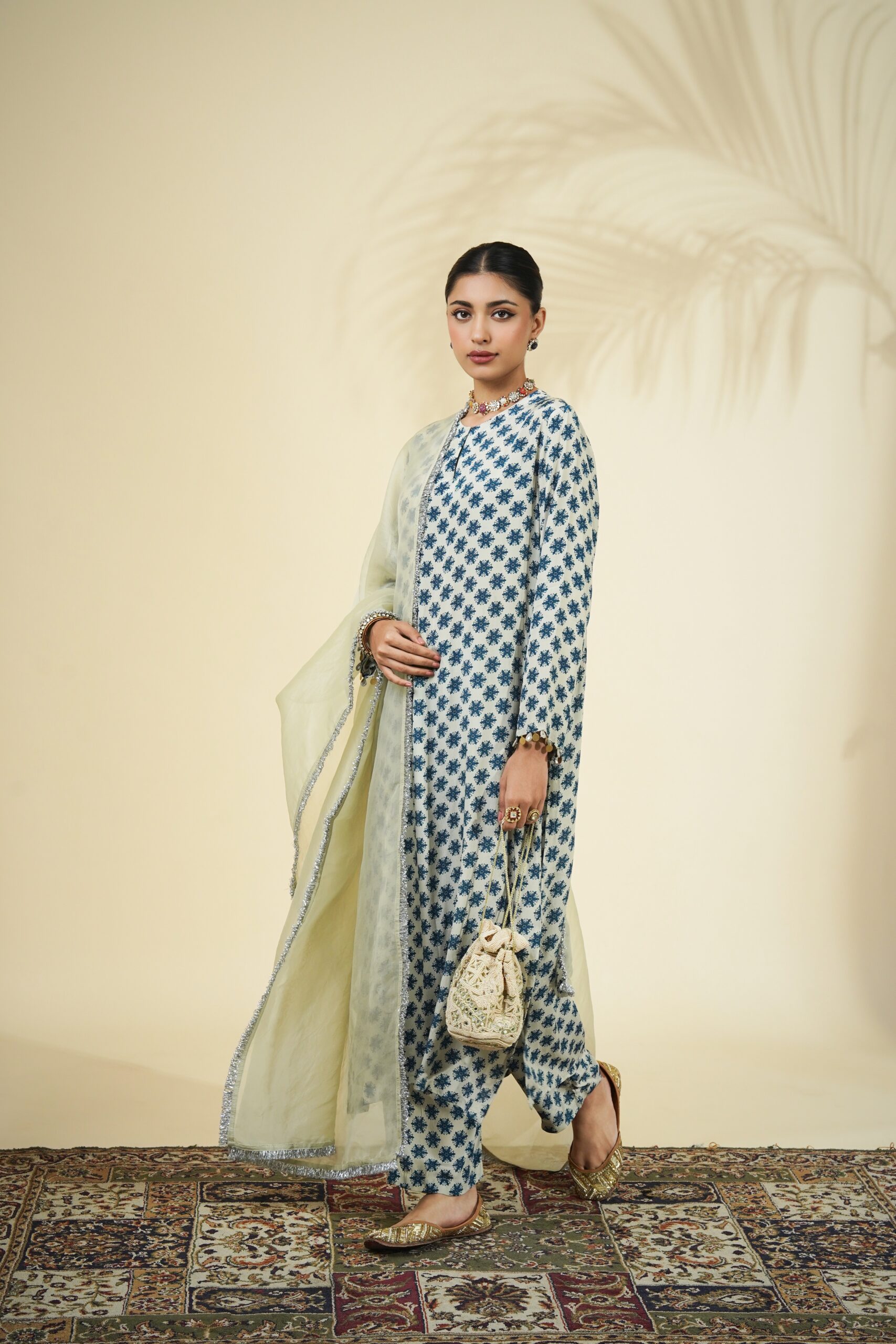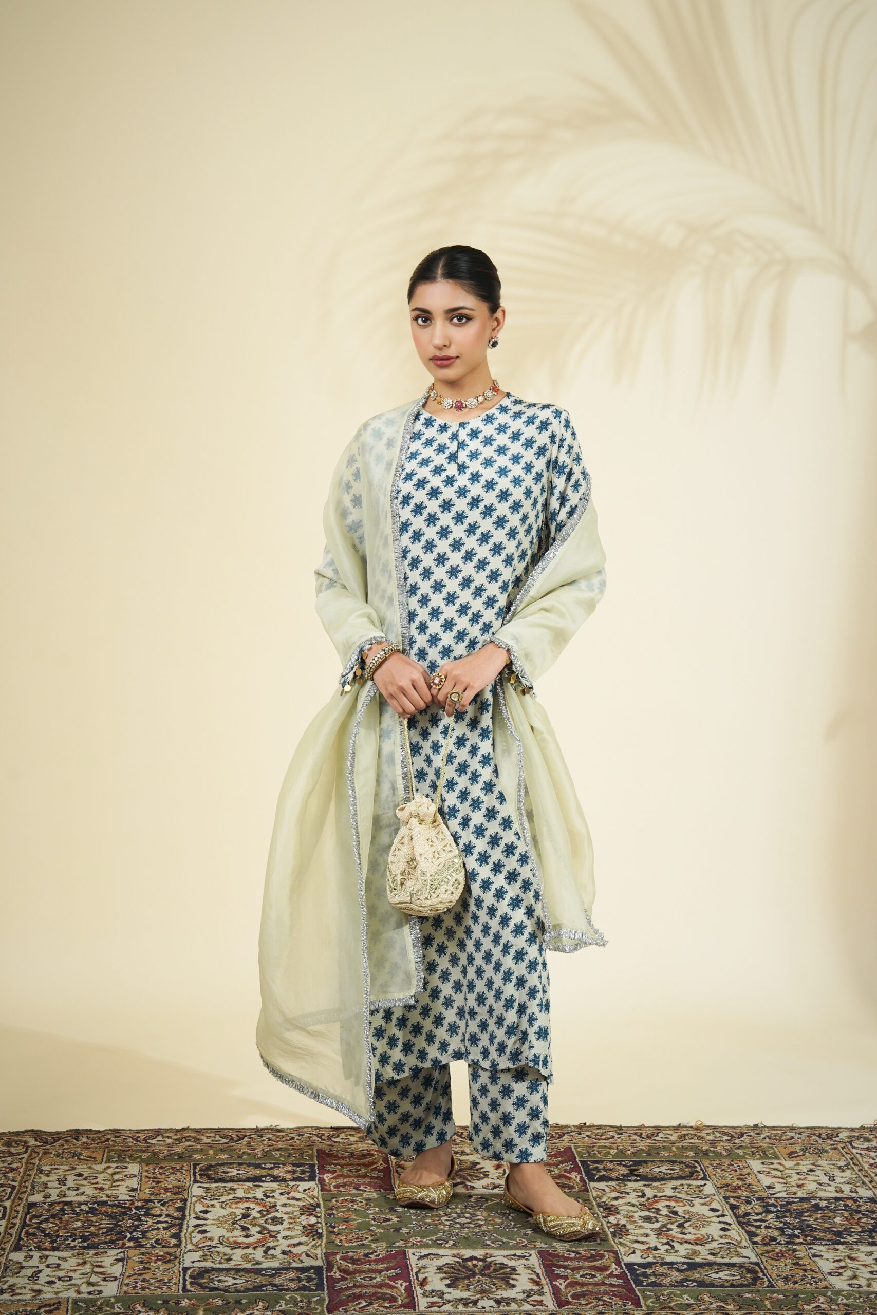 Sand & teal butti print kurta & pant set paired with a solid sand organza dupatta.