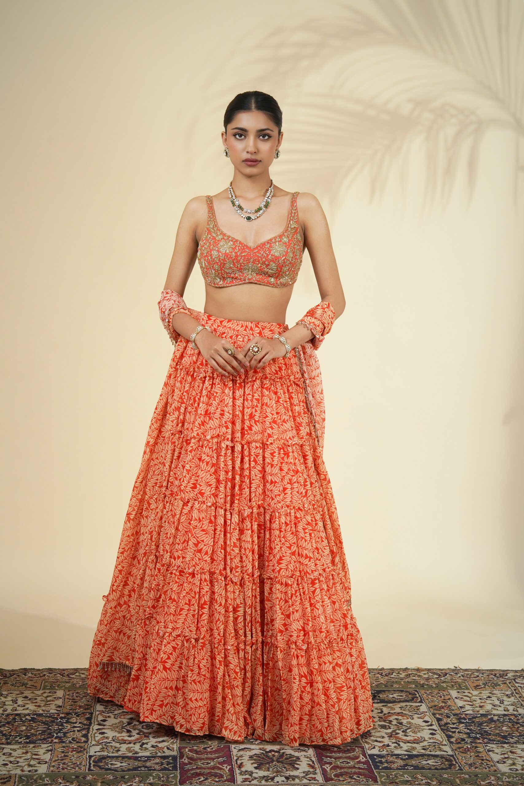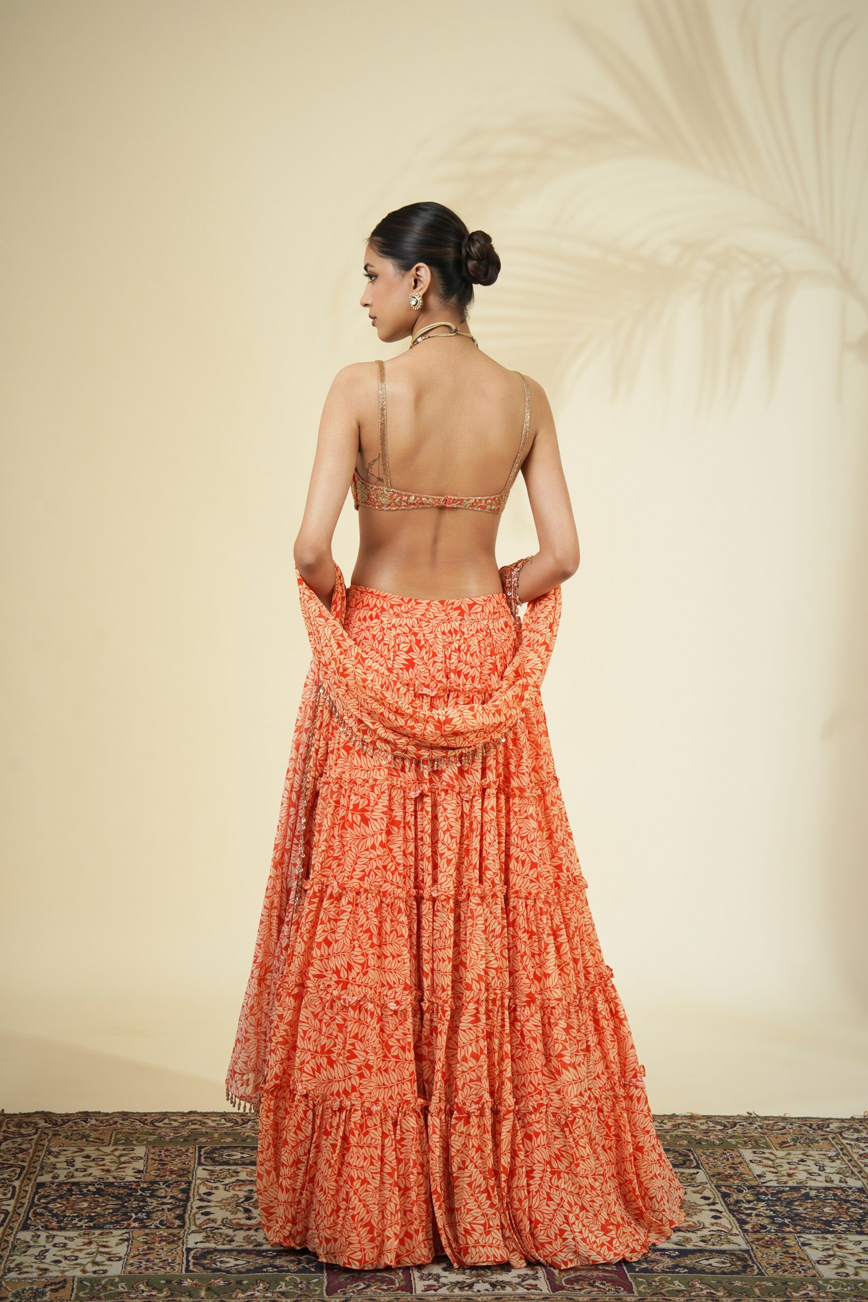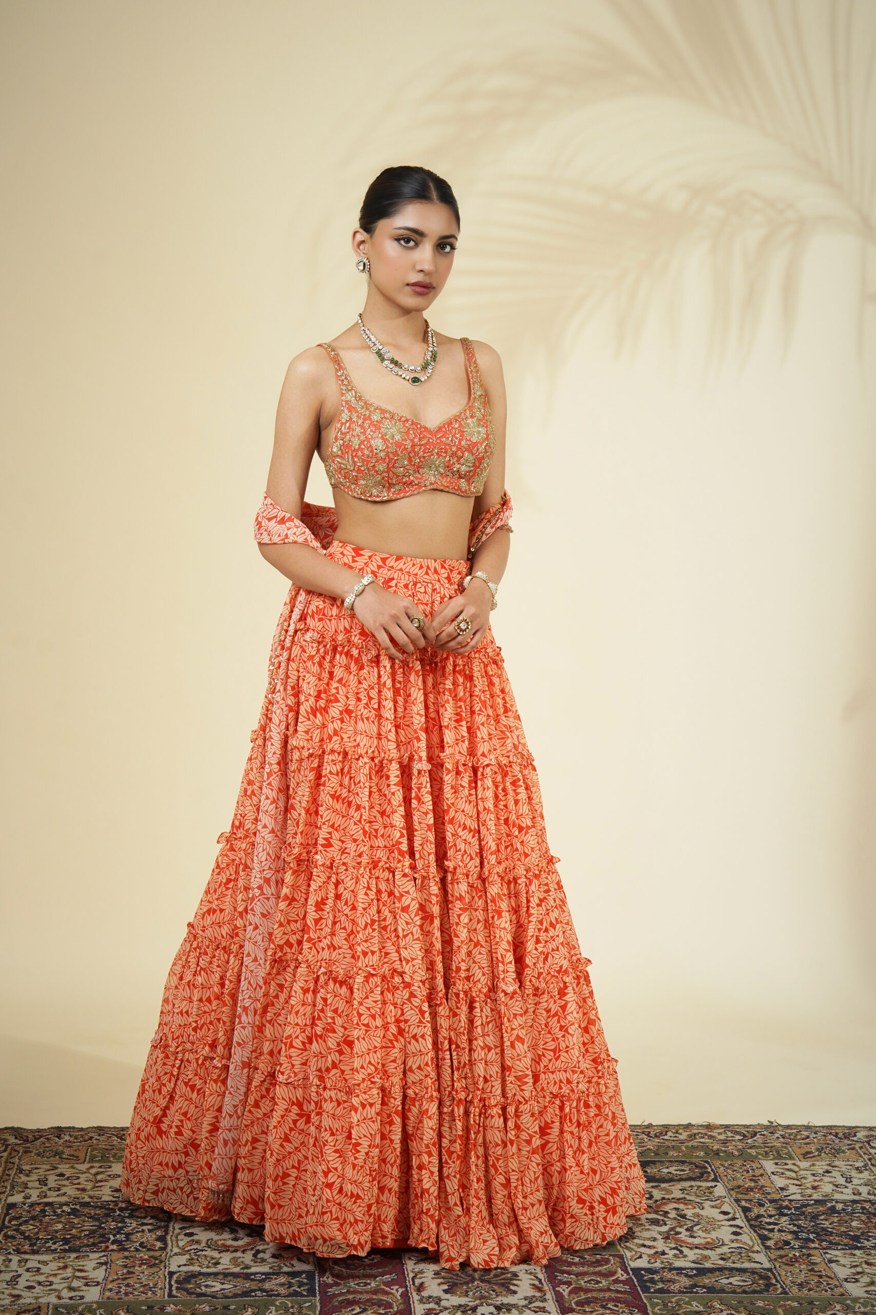 Sindoori fire prints tiered skirt & slim dupatta with crystal tassel detailing paired with a light gold mirror & cutdana hand embroidered sleeveless blouse.
