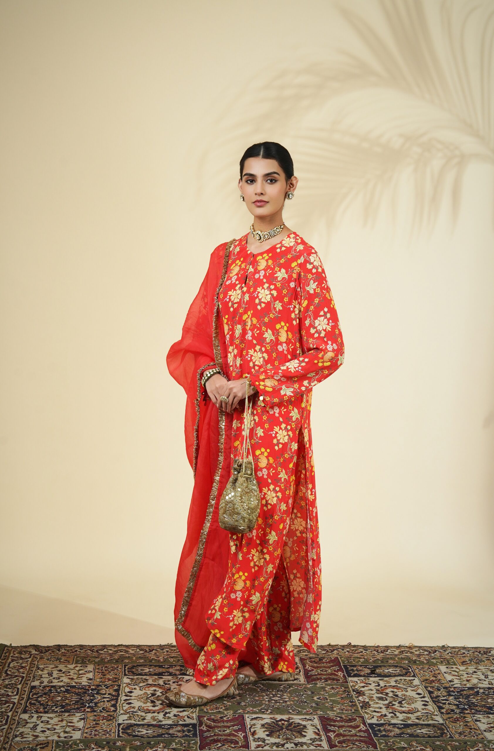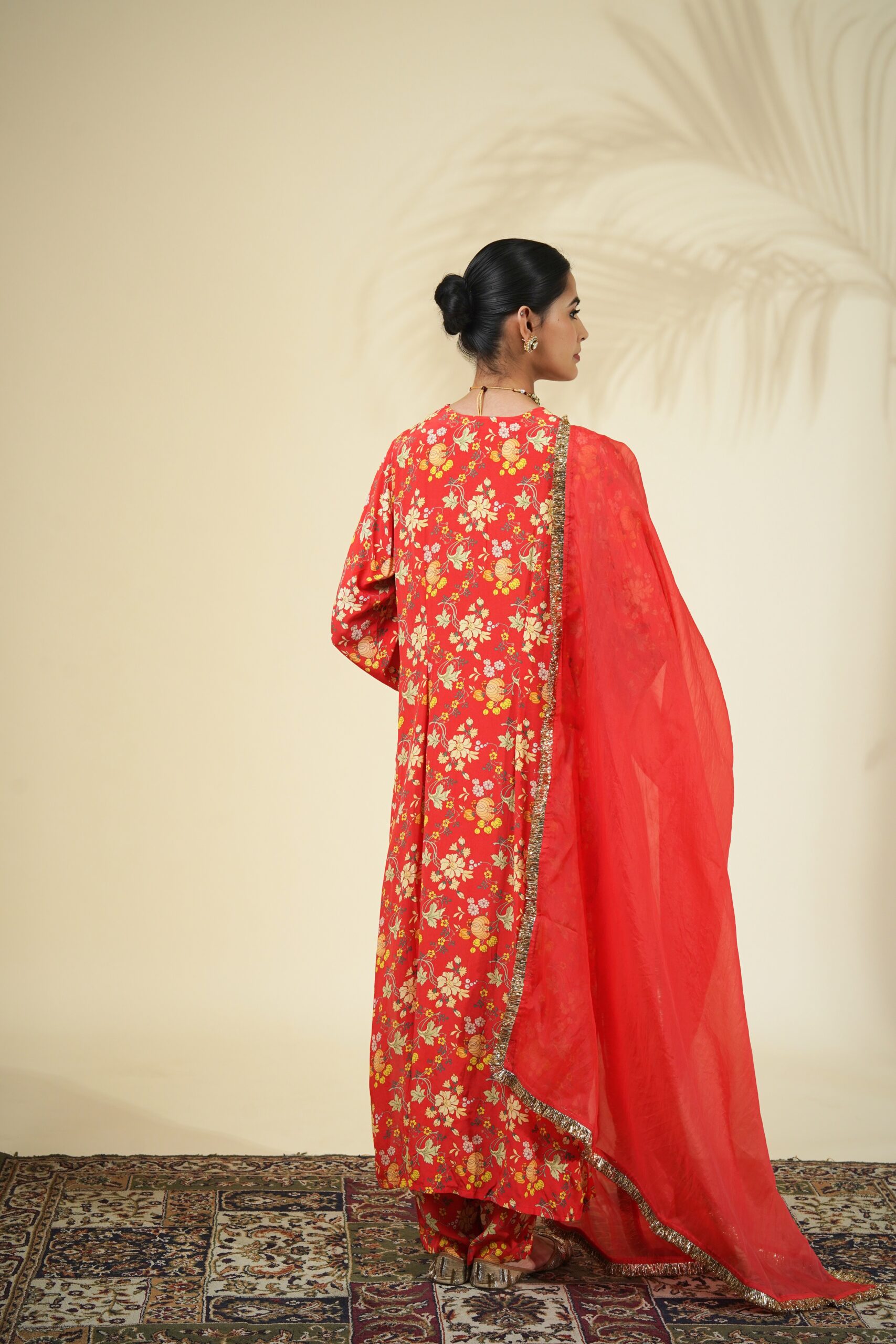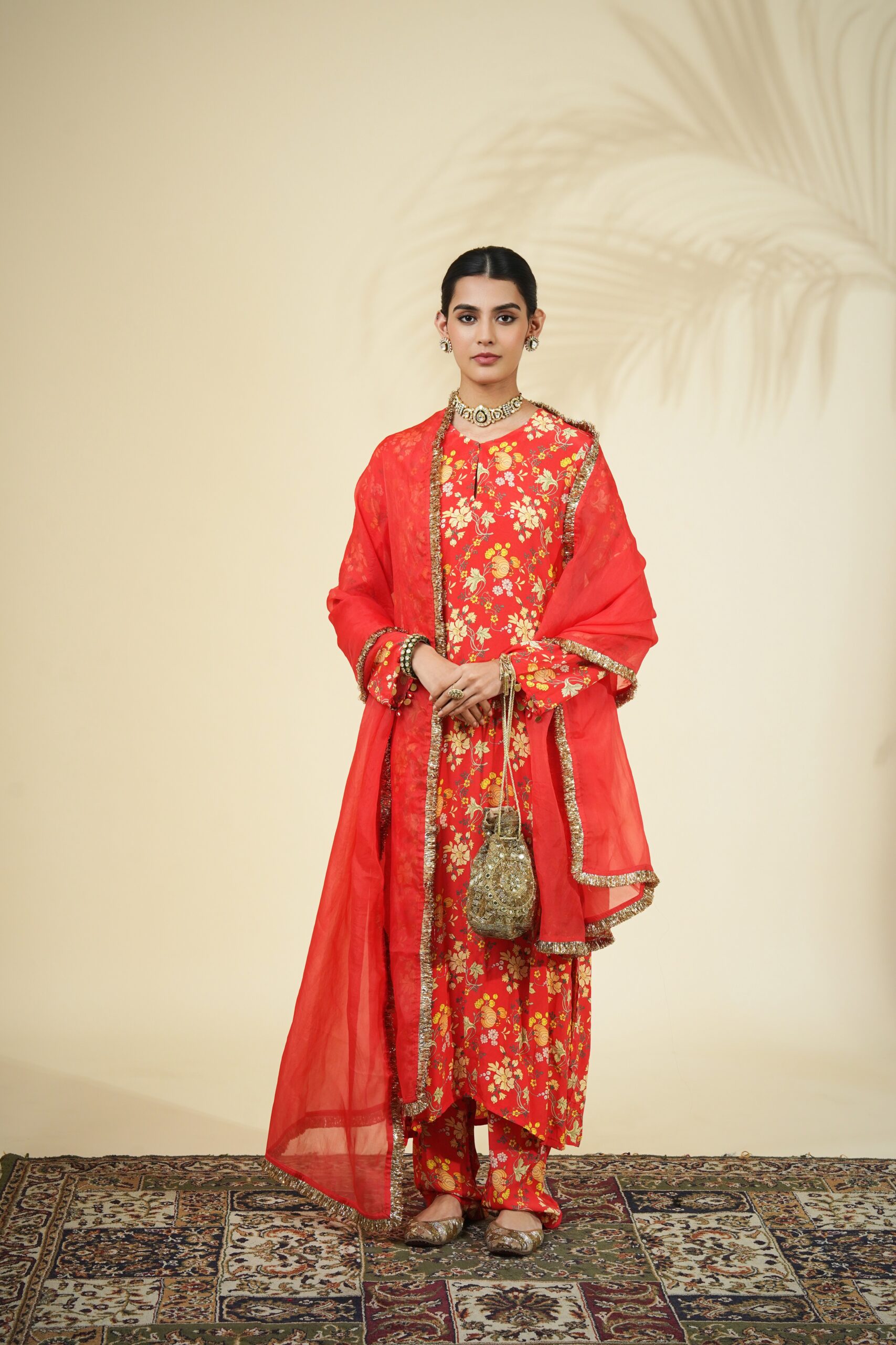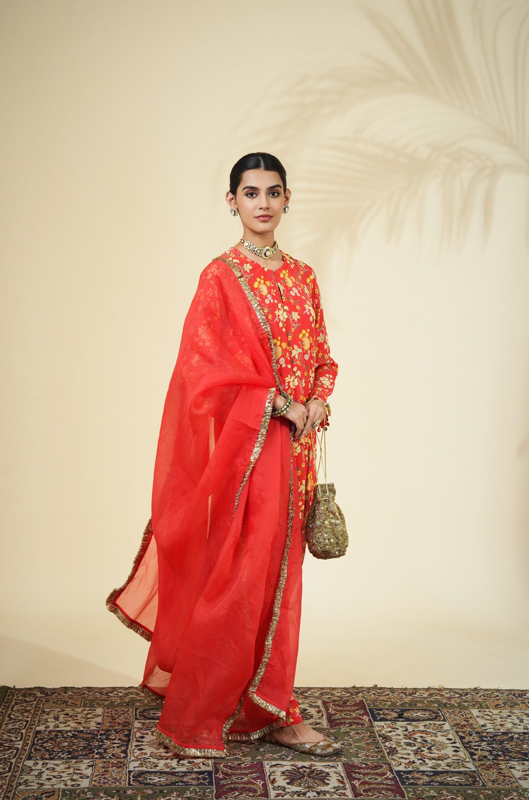 Sindoori floral print kurta & pant set paired with a solid sindoori organza dupatta.