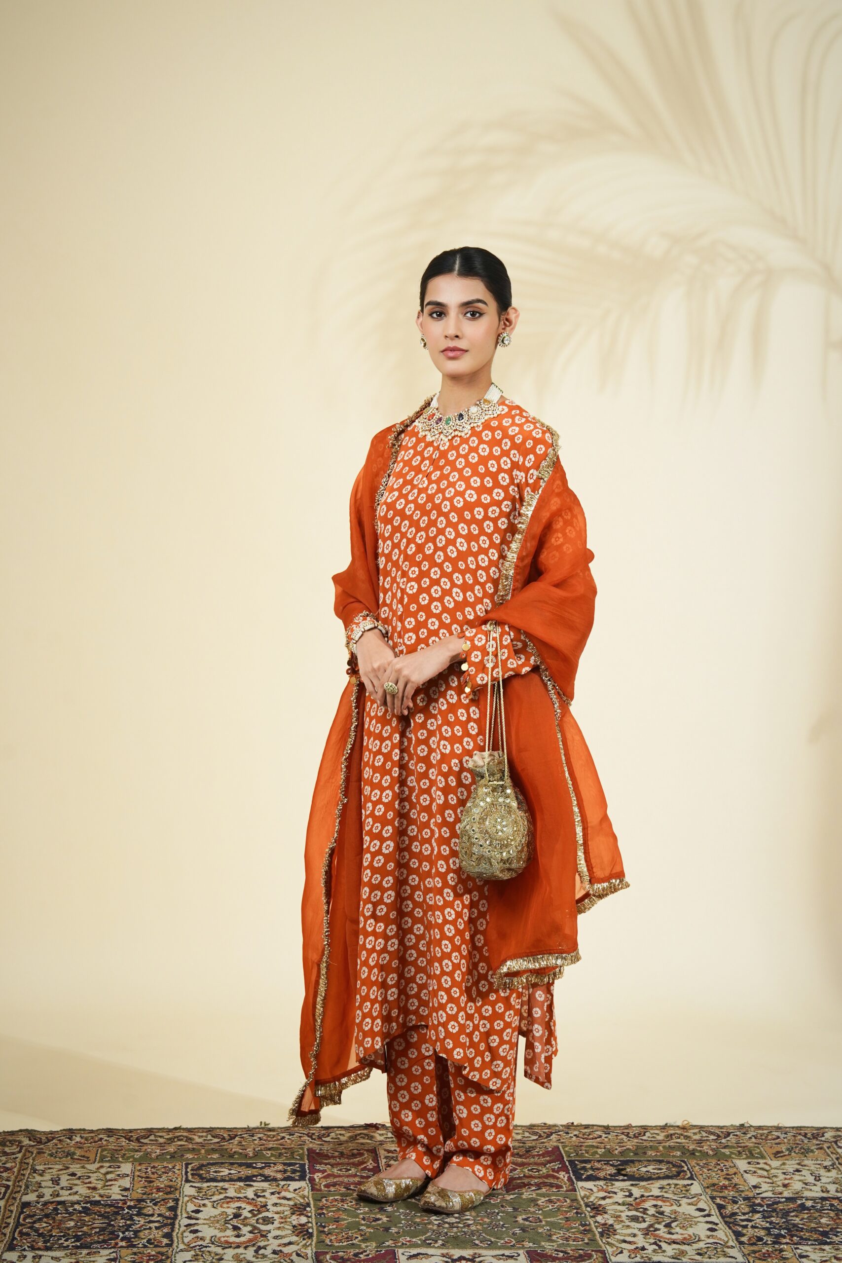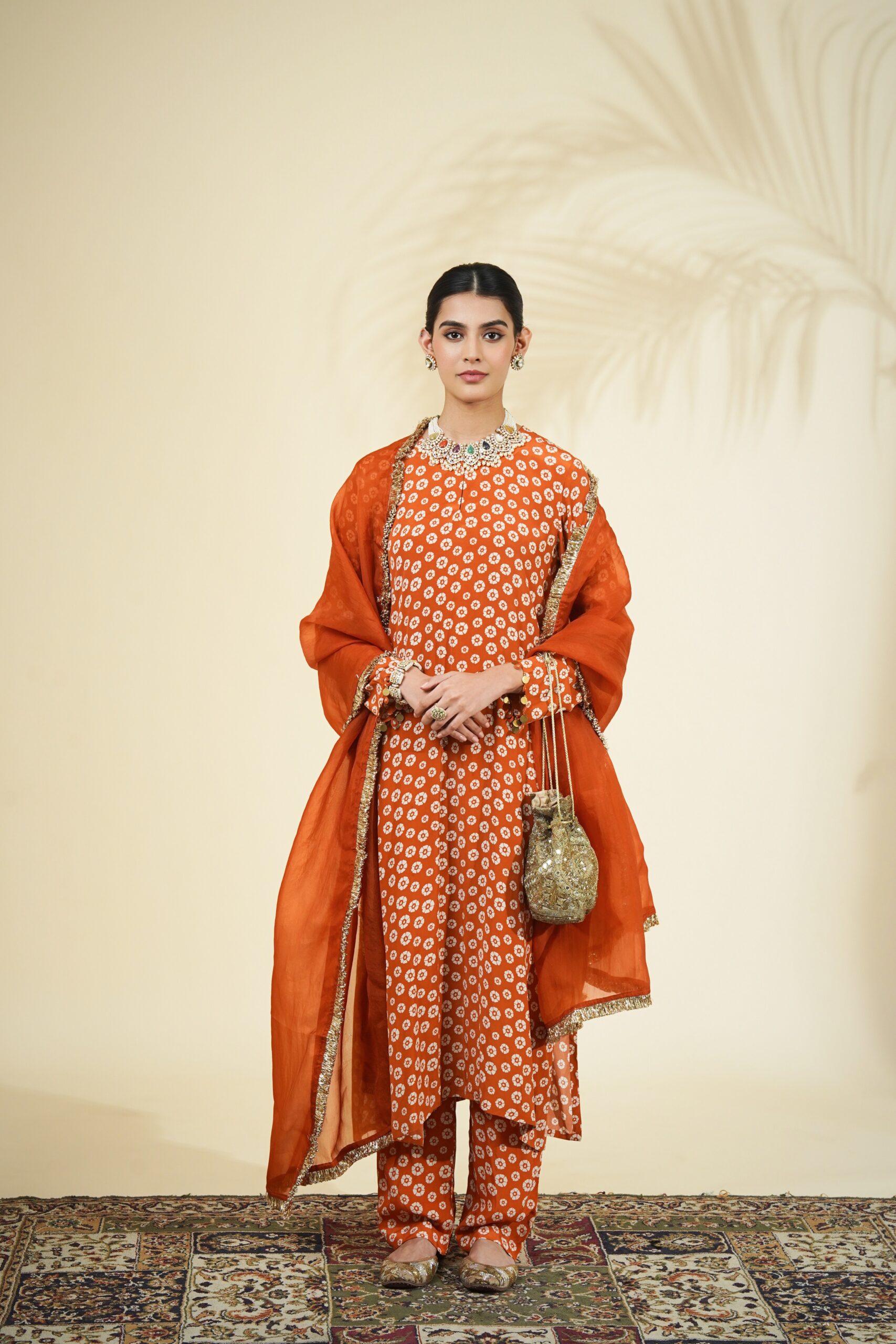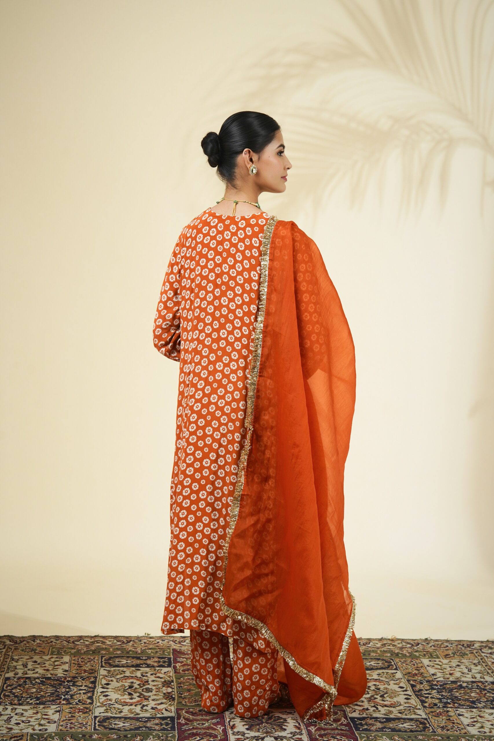 Toasted orange & sand butti print kurta & pant set paired with a solid toasted orange organza dupatta.