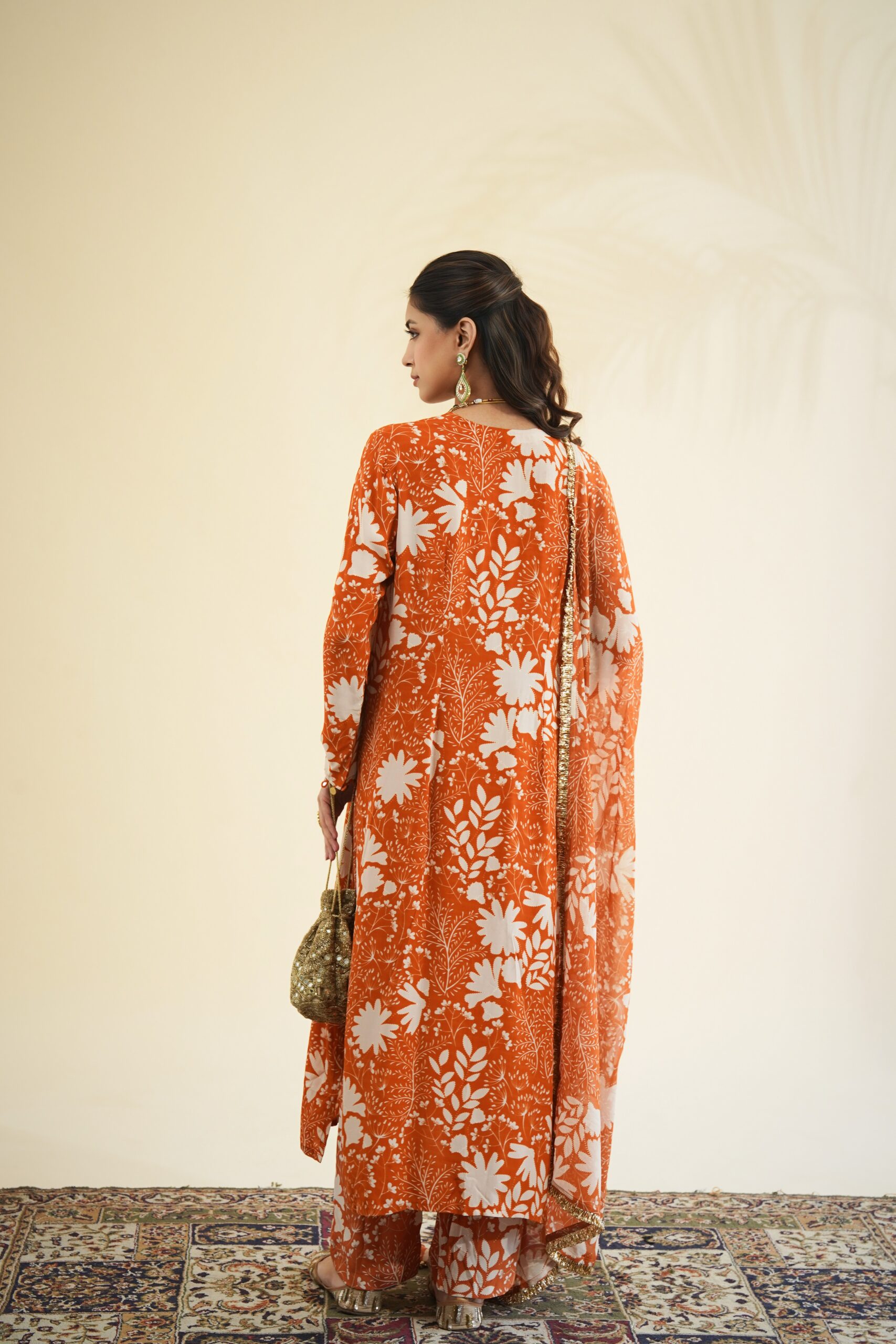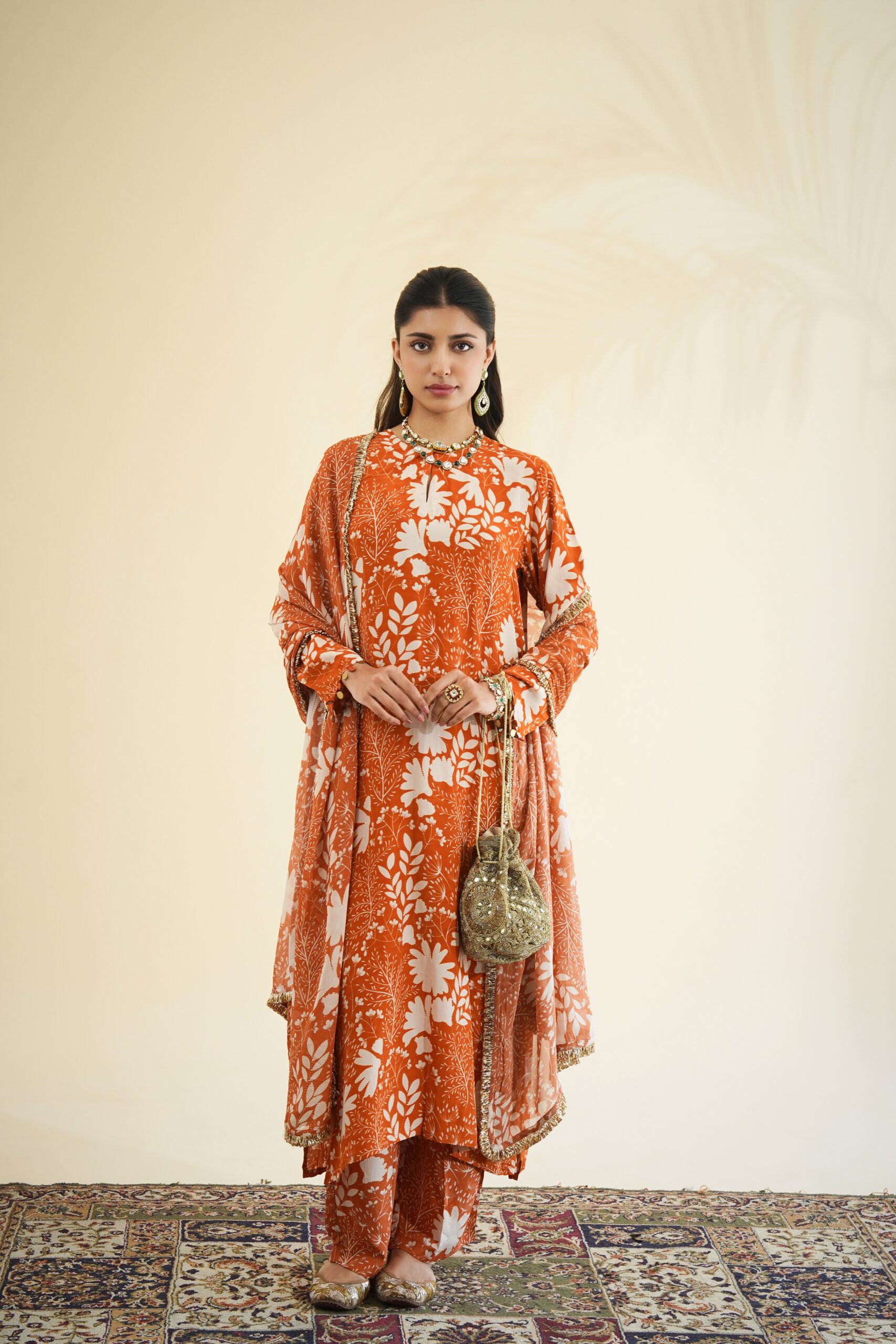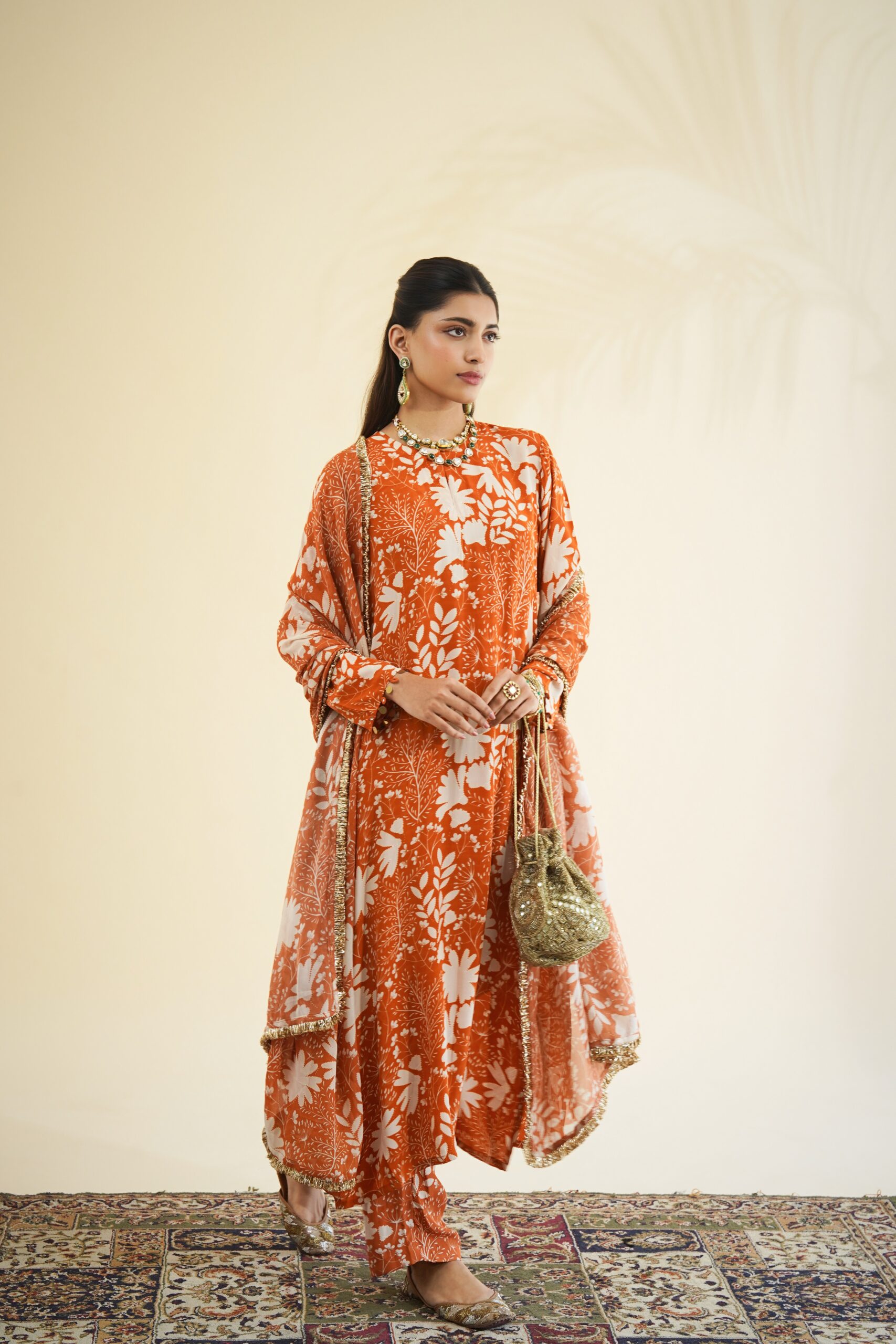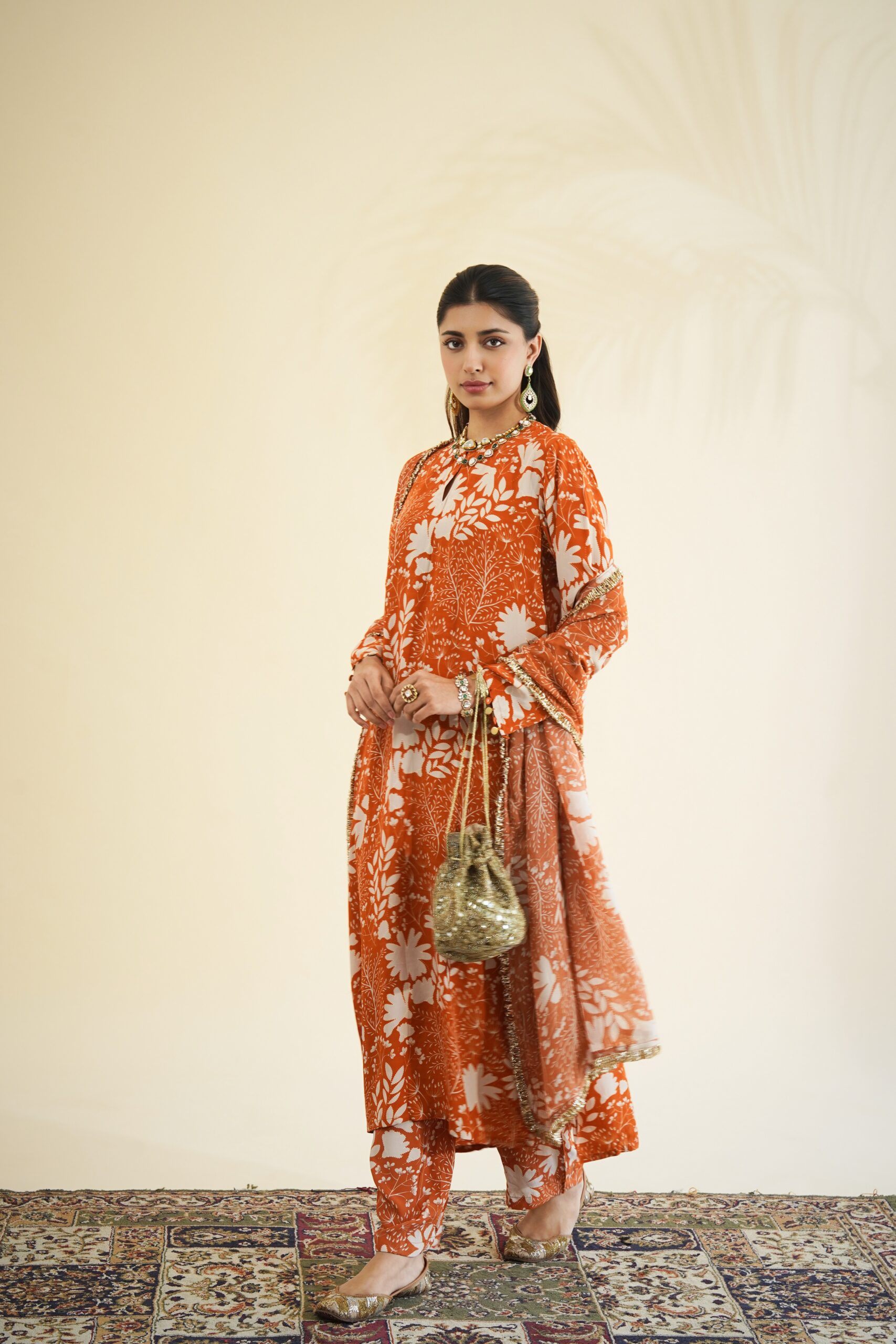 Toasted orange & sand garden print kurta & pant set paired with a solid toasted orange organza dupatta.