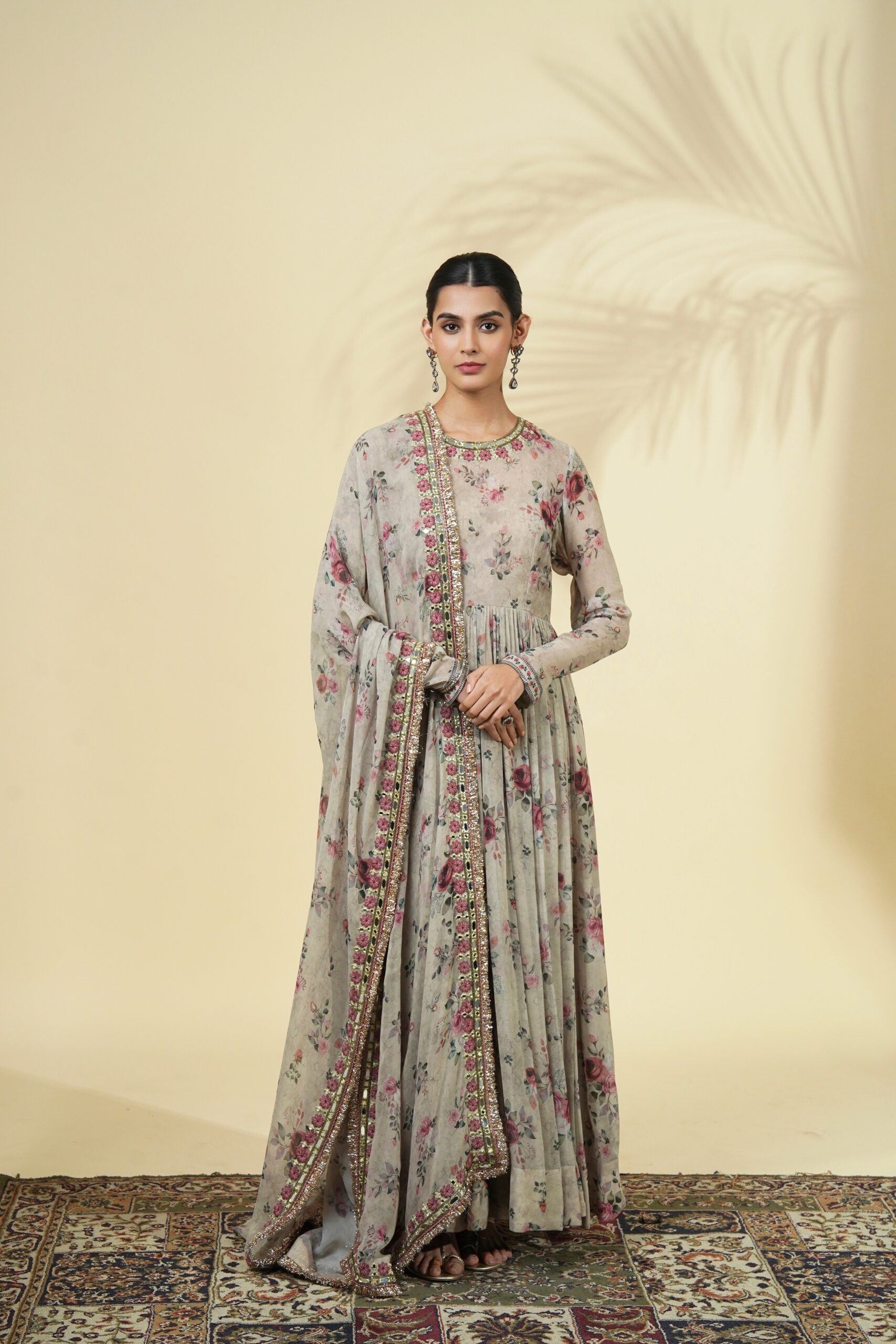 Vintage rose print & dull gold mirror, cutdana & multi thread hand embroidered anarkali & dupatta paired with a sand churidar.
