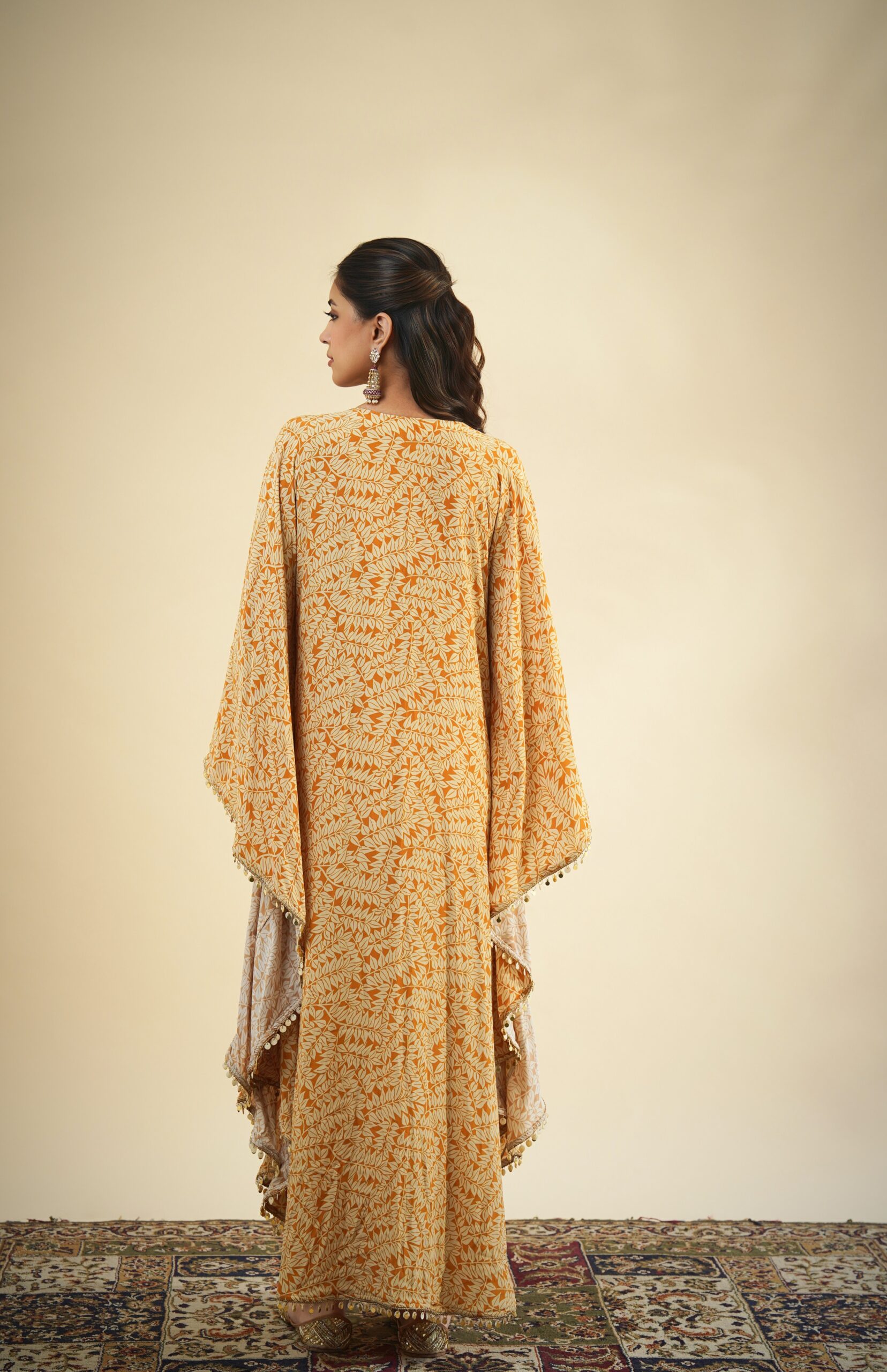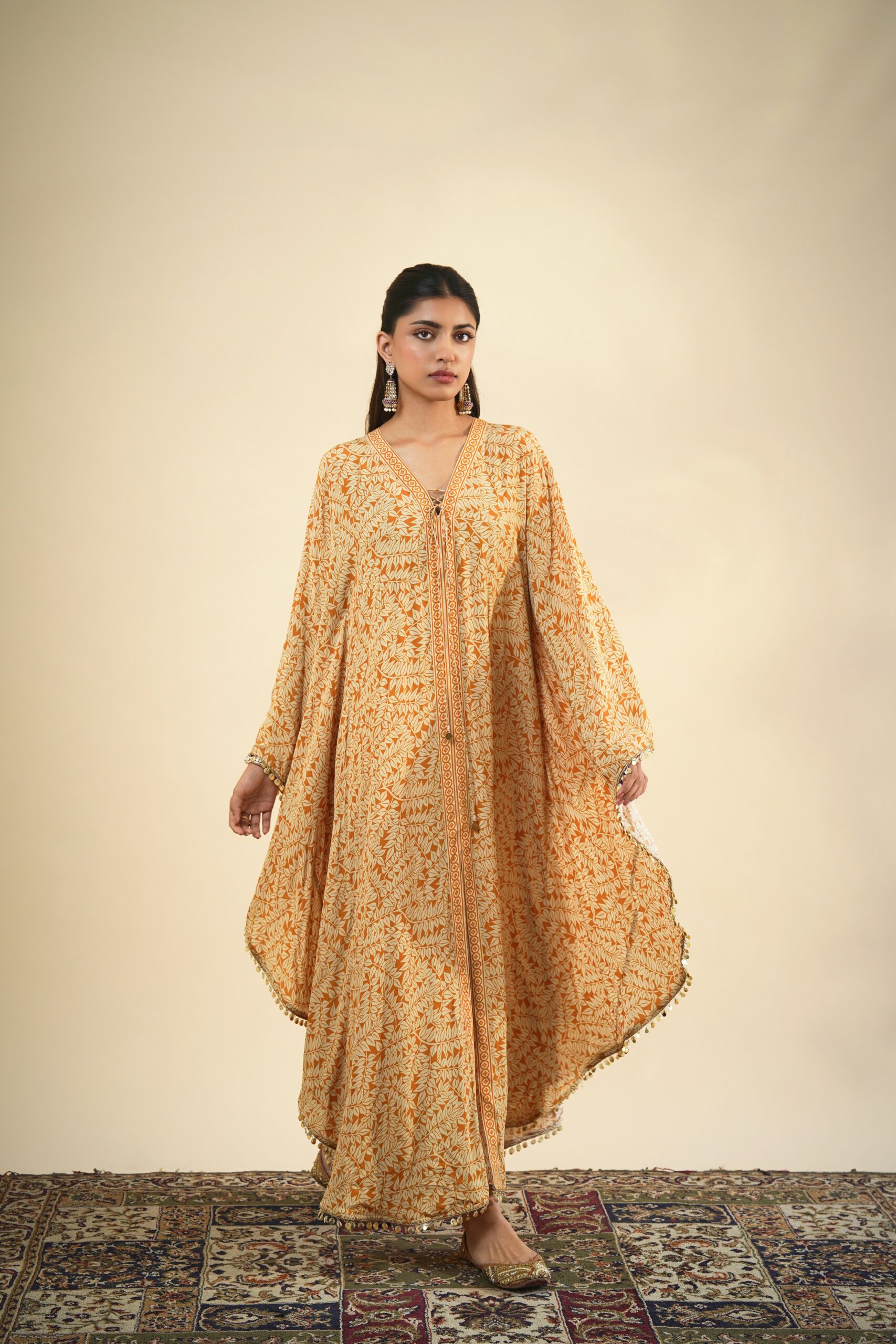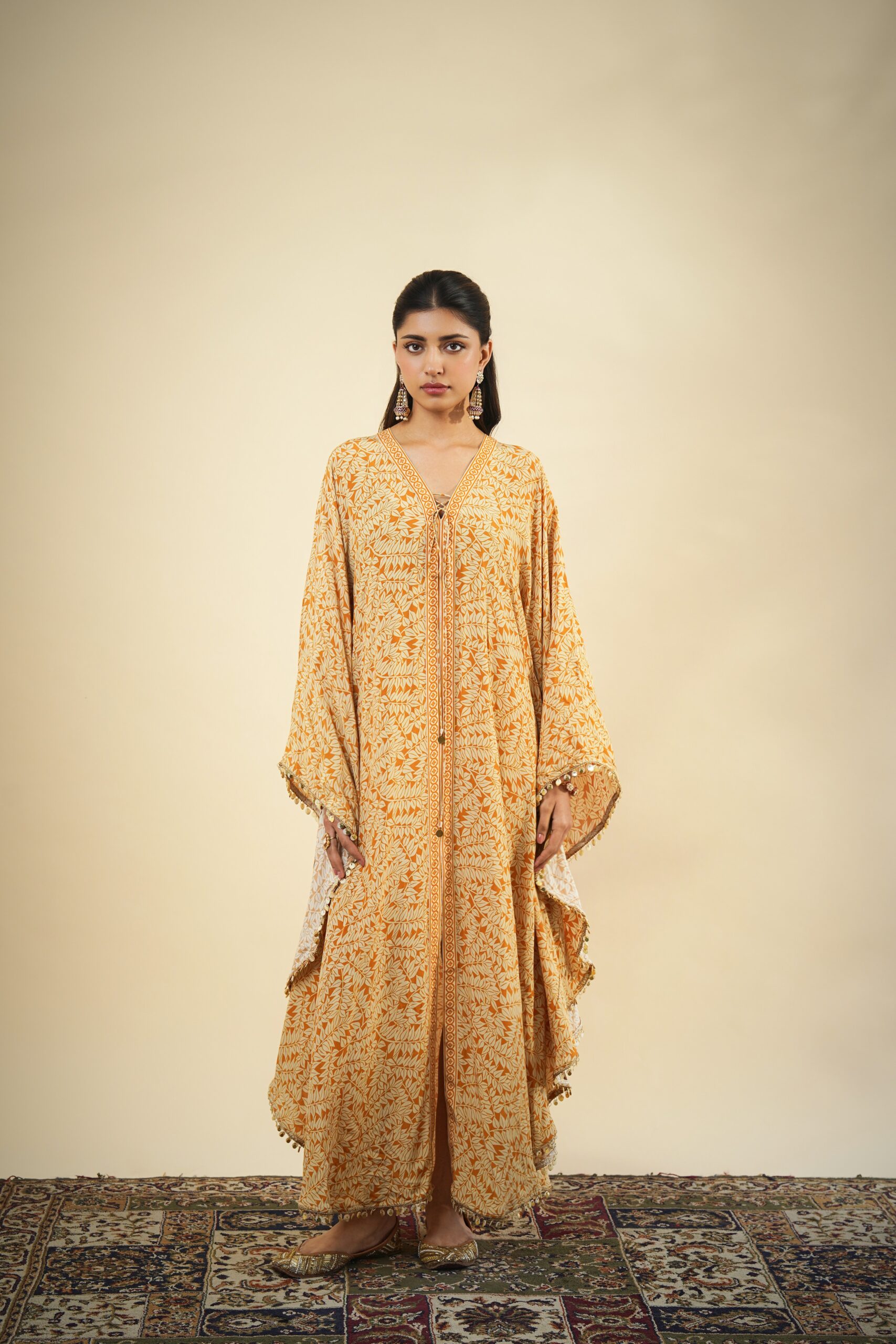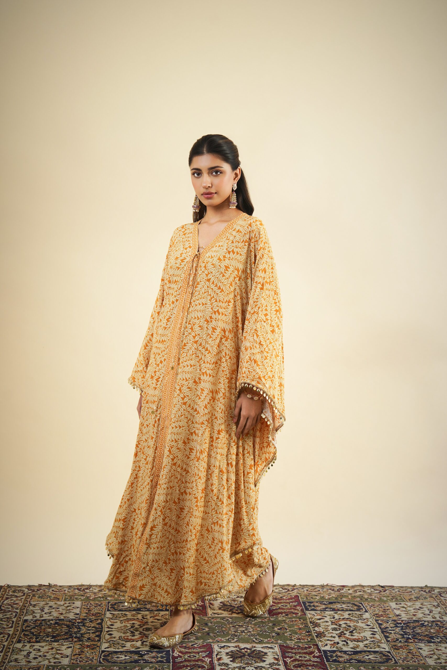 Yellow fire print kaftan with shell & coin trim detailing.