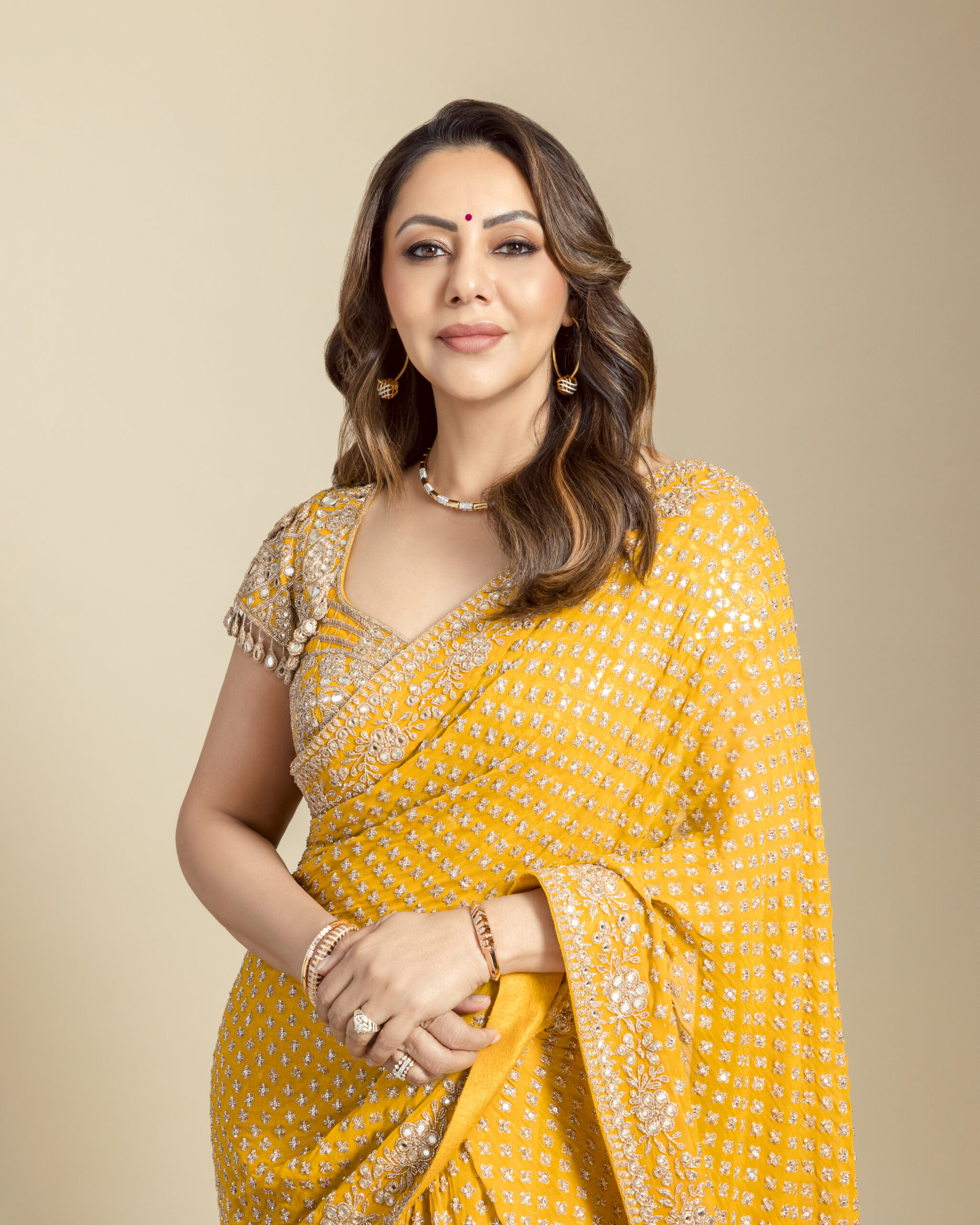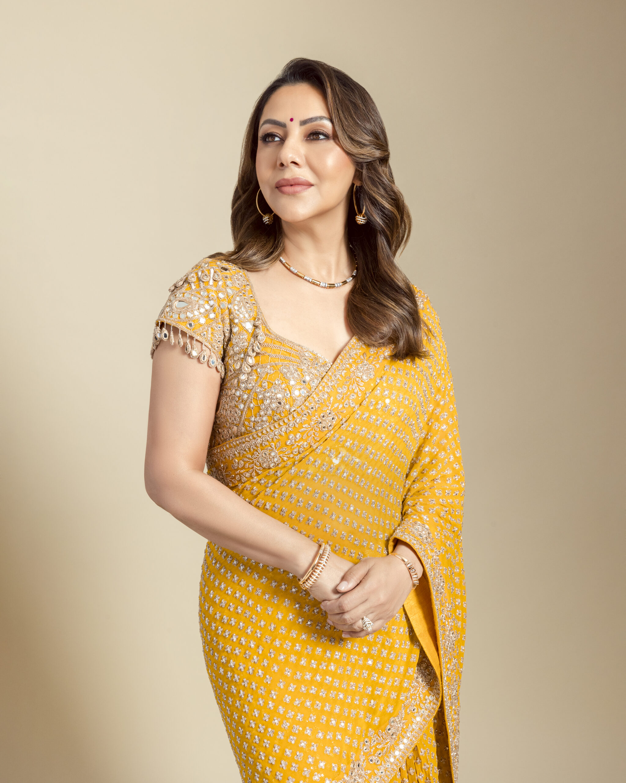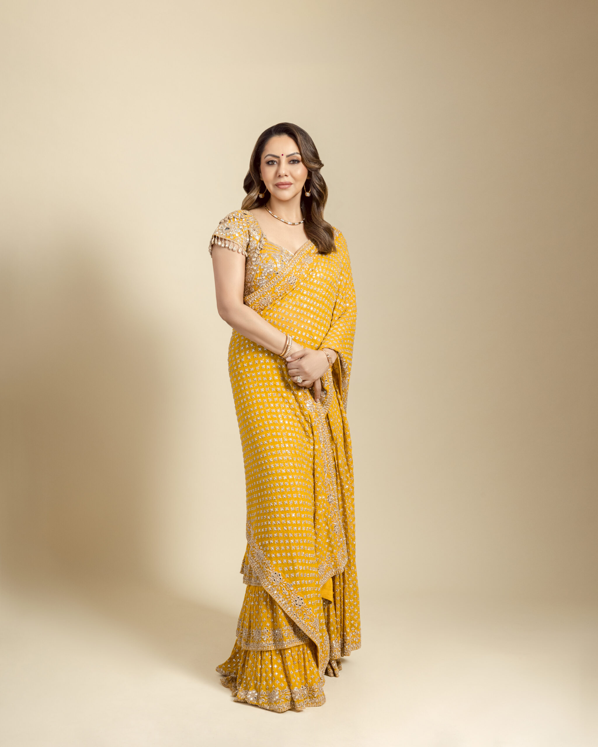 Yellow & rosegold star butti hand embriodered tiered sari set.
